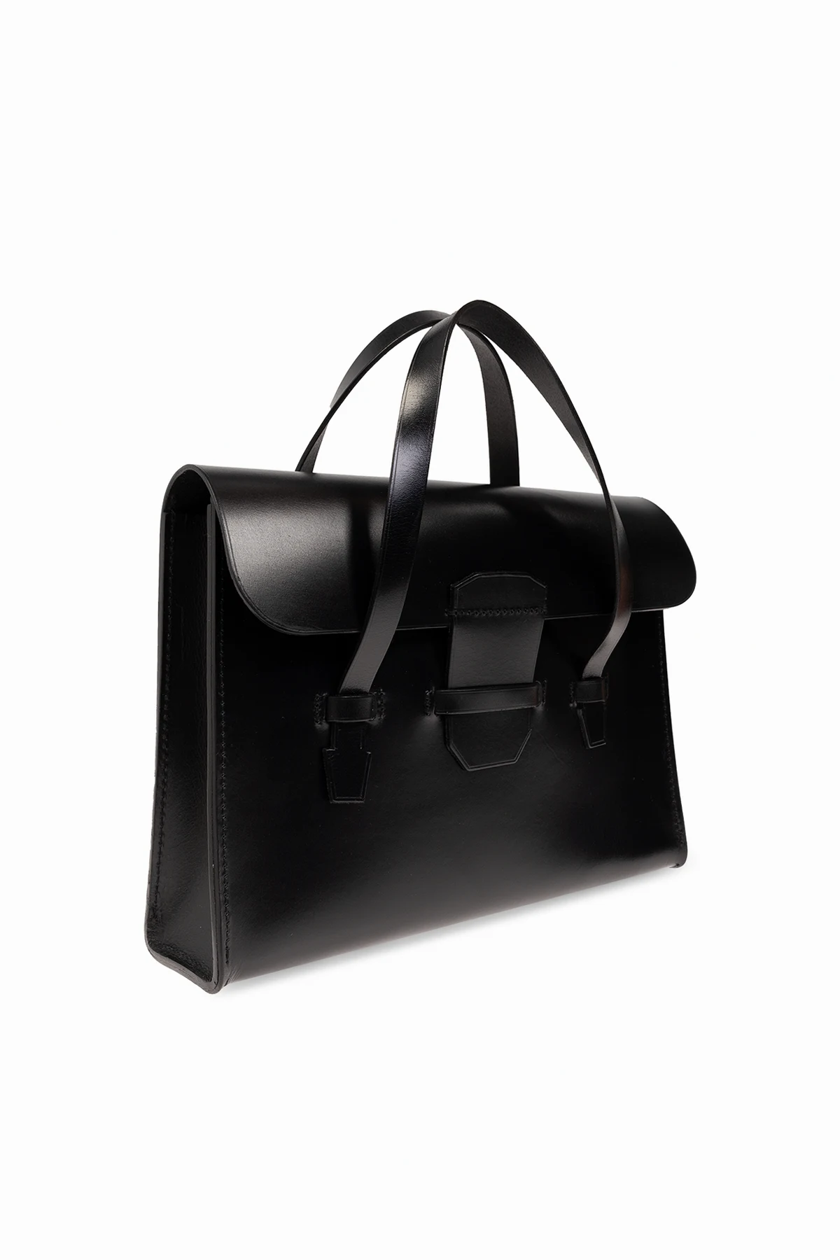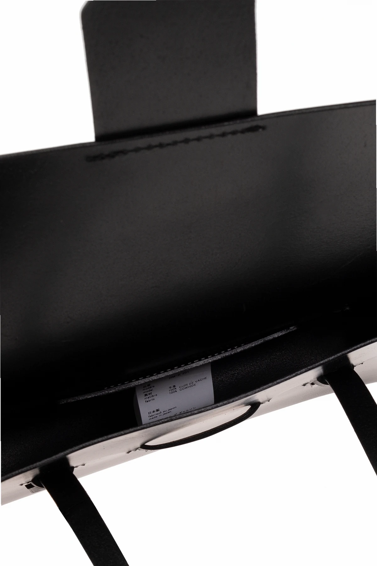 Black handbag from CDG by Comme des Garcons. Made of smooth leather, this model features a flap with a closure, two half-round handles and one internal compartment.