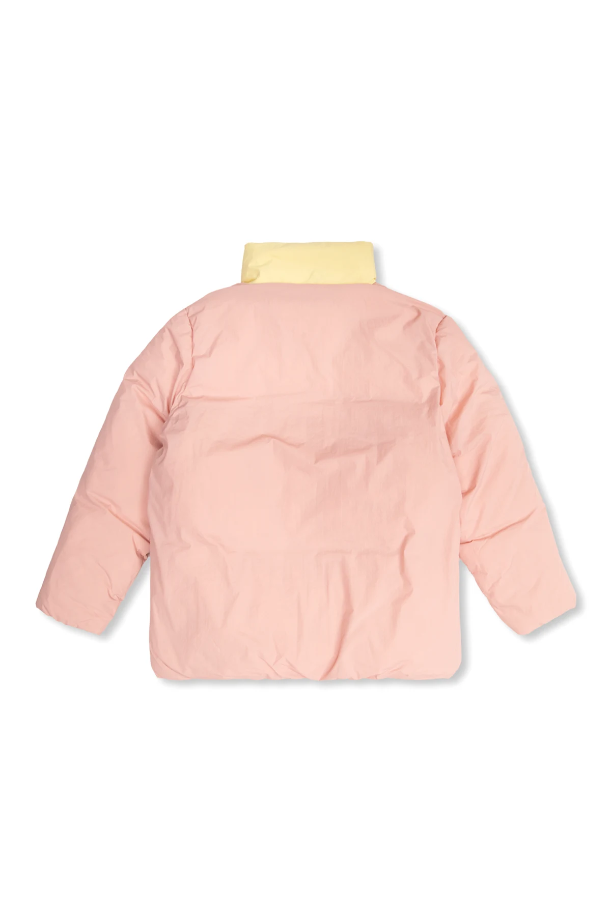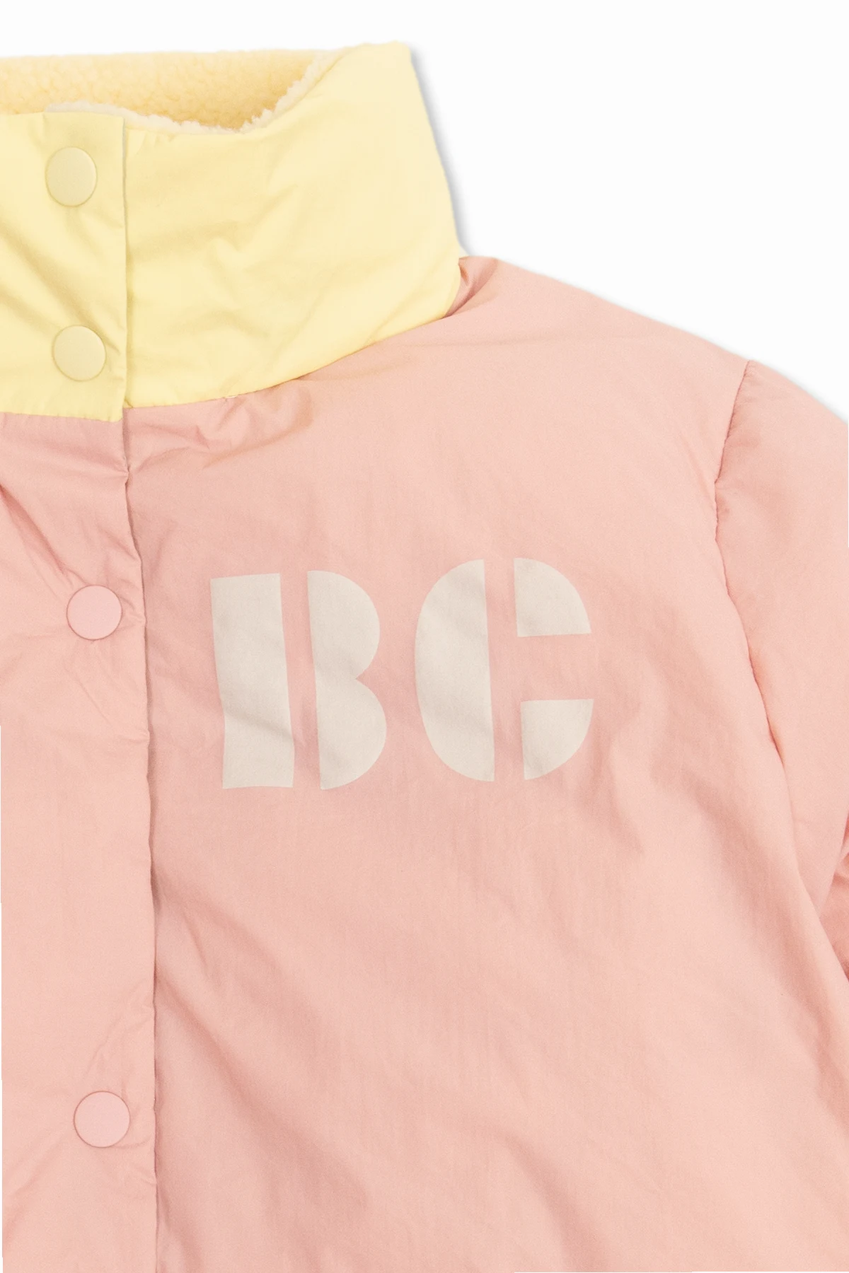 Pink jacket from Bobo Choses. Made from recycled material with waterproof properties, this style fastens with a zip and snaps and showcases a printed logo. It is complete with a standing collar with a concealed yellow hood, two slip pockets, long sleeves and elasticized trims on the bottom hem and cuffs.