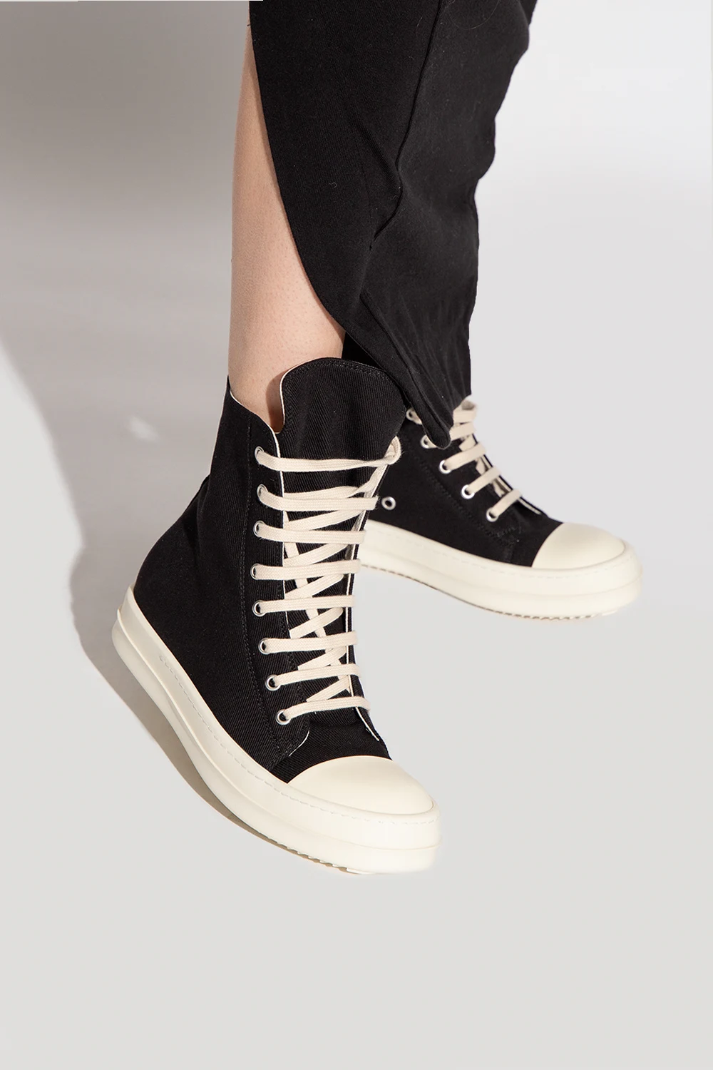 Black and cream high-top sneakers from Rick Owens DRKSHDW. Crafted from fabric, this lace-up model sits on a cream rubber sole and features an additional zipper on the side and rubber trims.