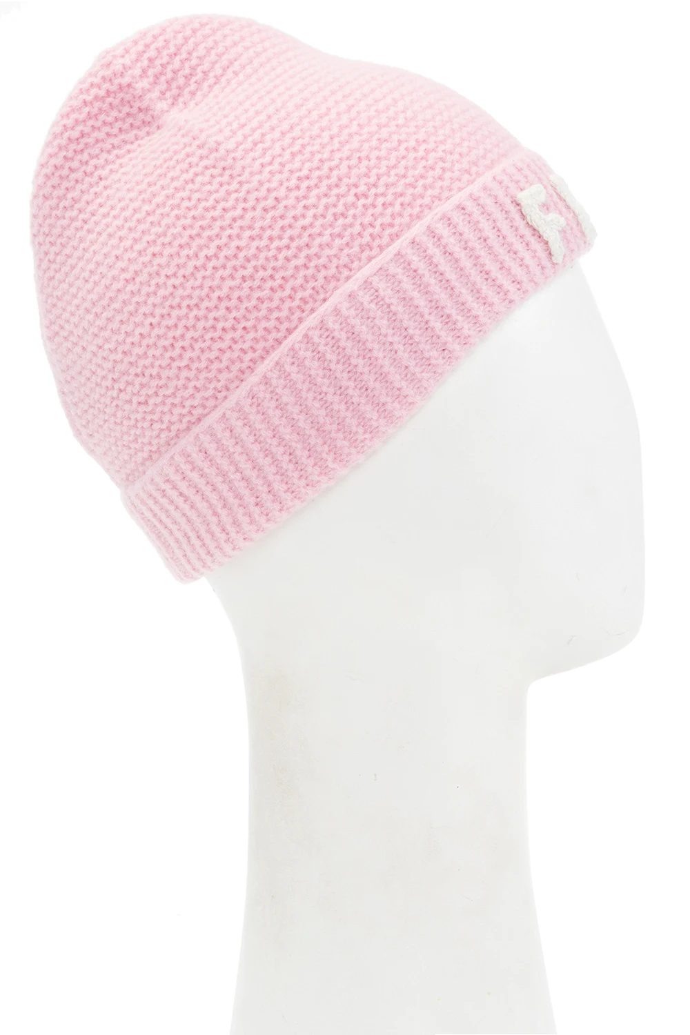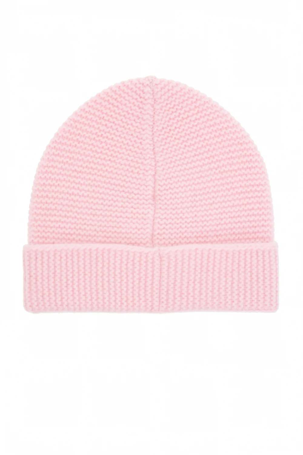 Pink hat from Fendi Kids. Knitted from a wool and cashmere blend, this model is decorated with a logo pattern in white.