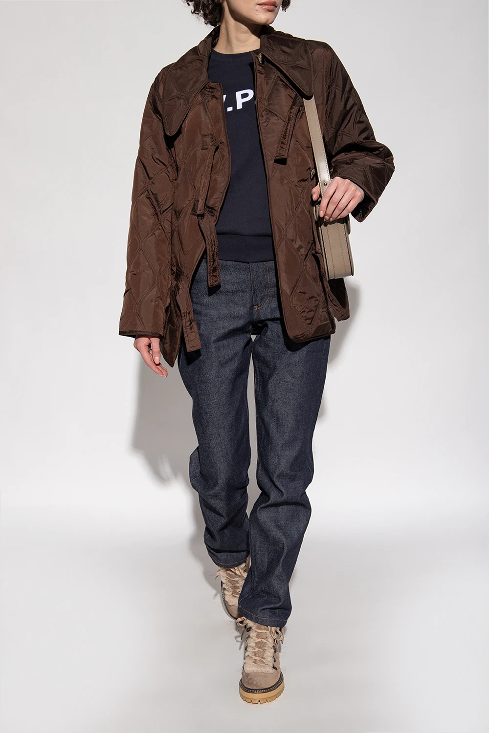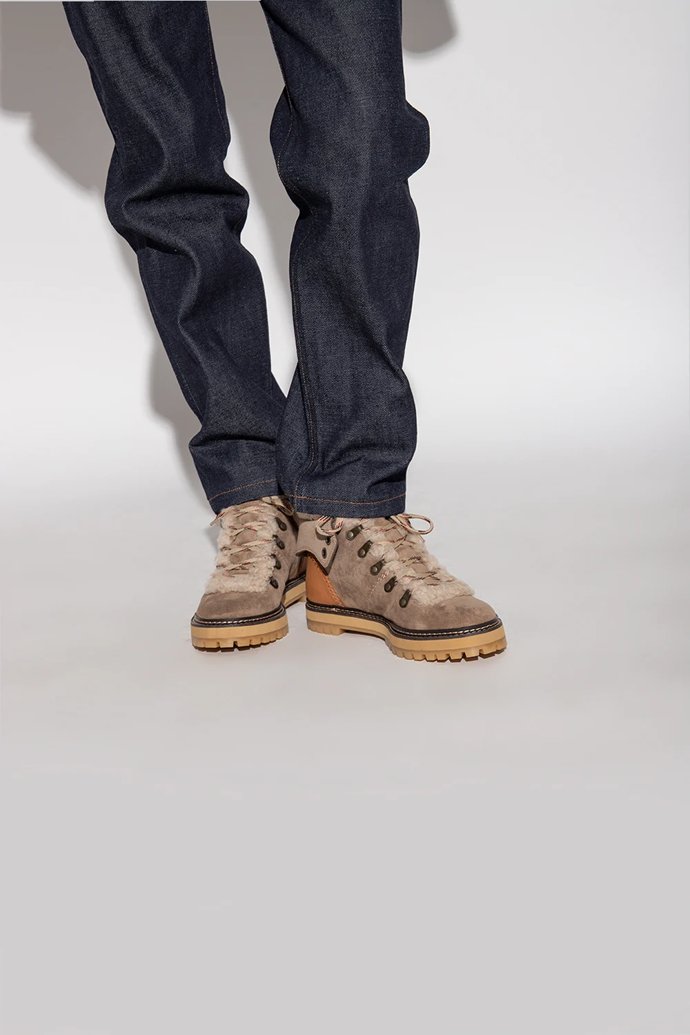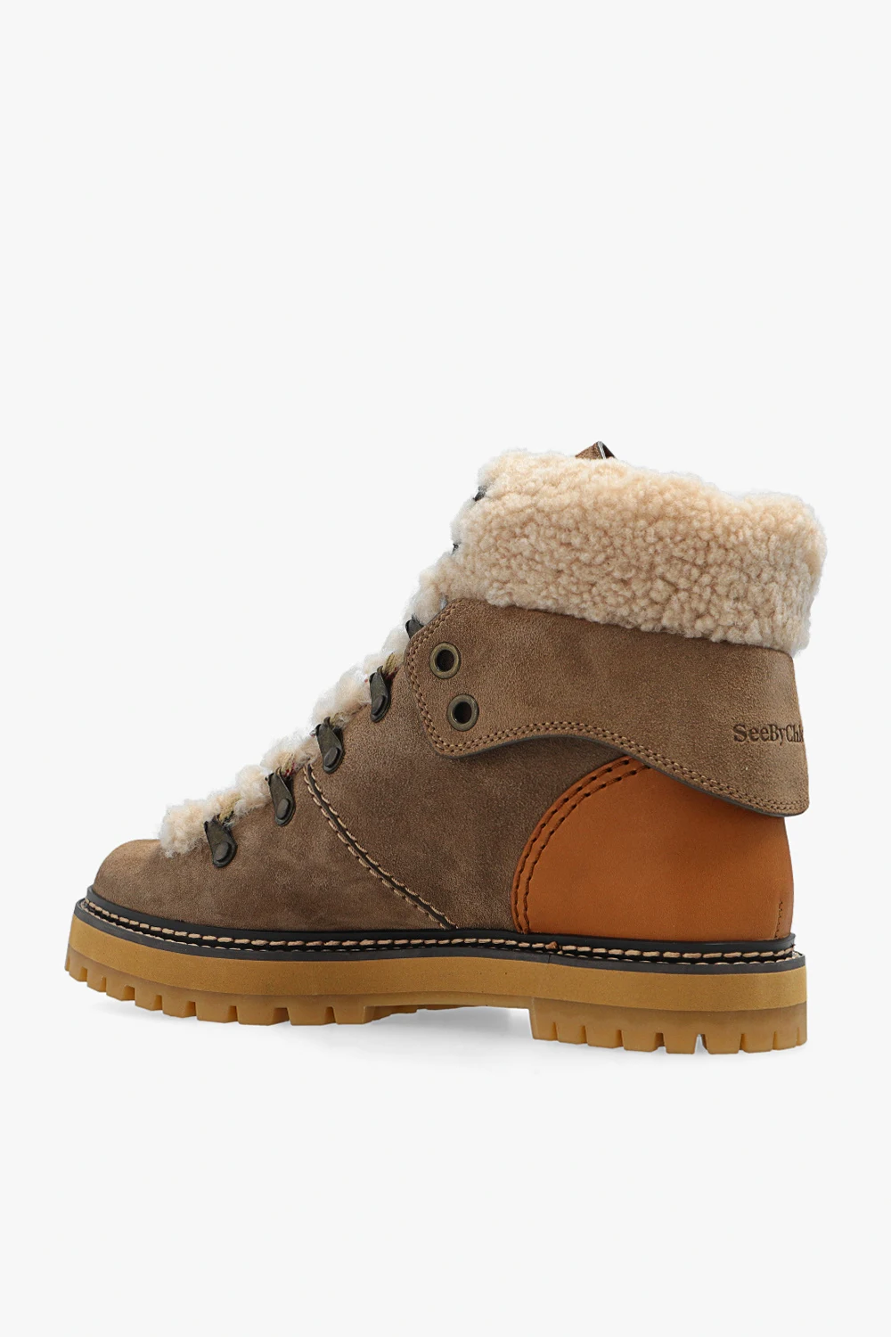 Greyish beige ‘Eileen’ hiking boots from See By Chloe. Crafted from calf suede and lined with shearling, this lace-up model sits on a beige rubber sole and showcases the brand's logo.