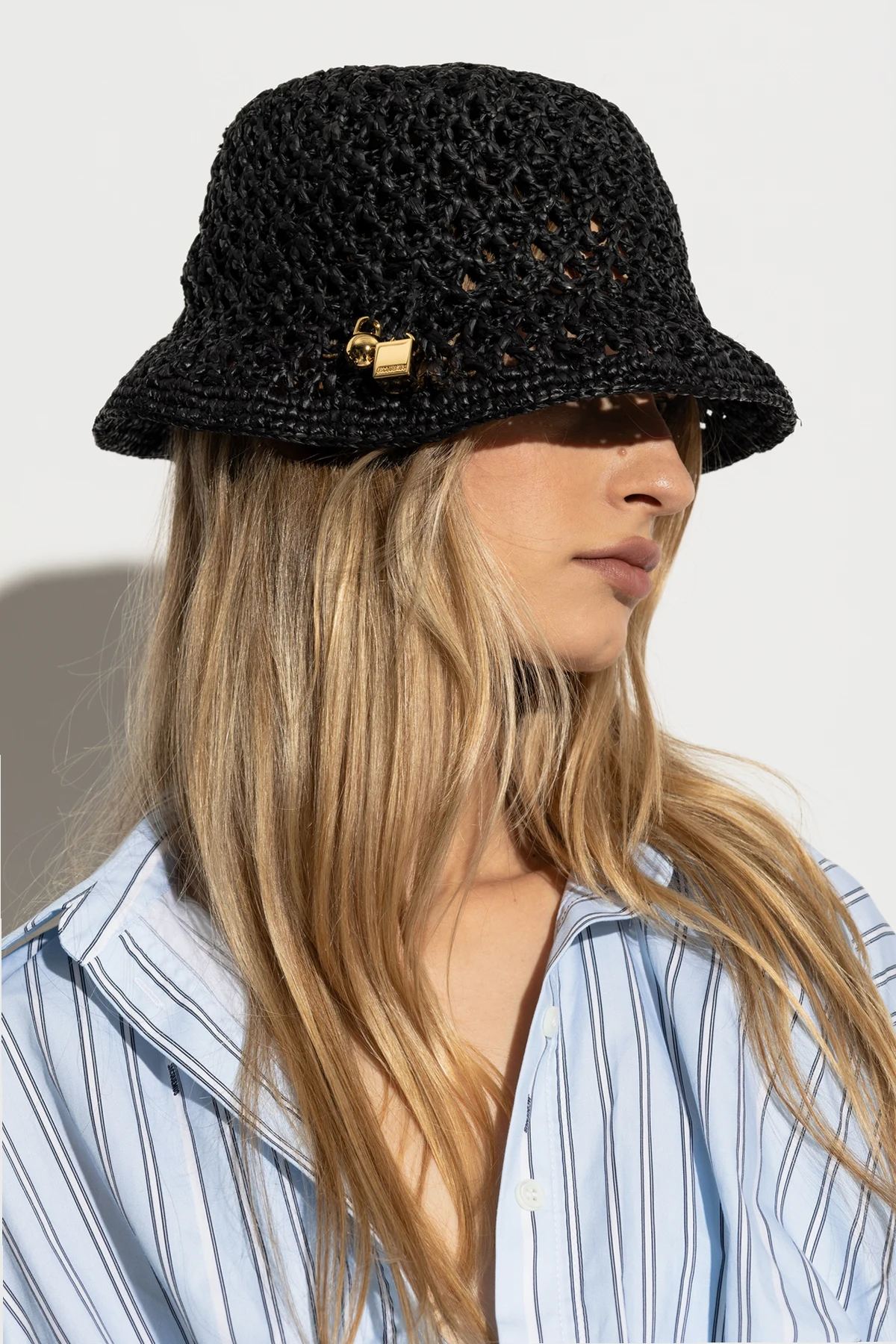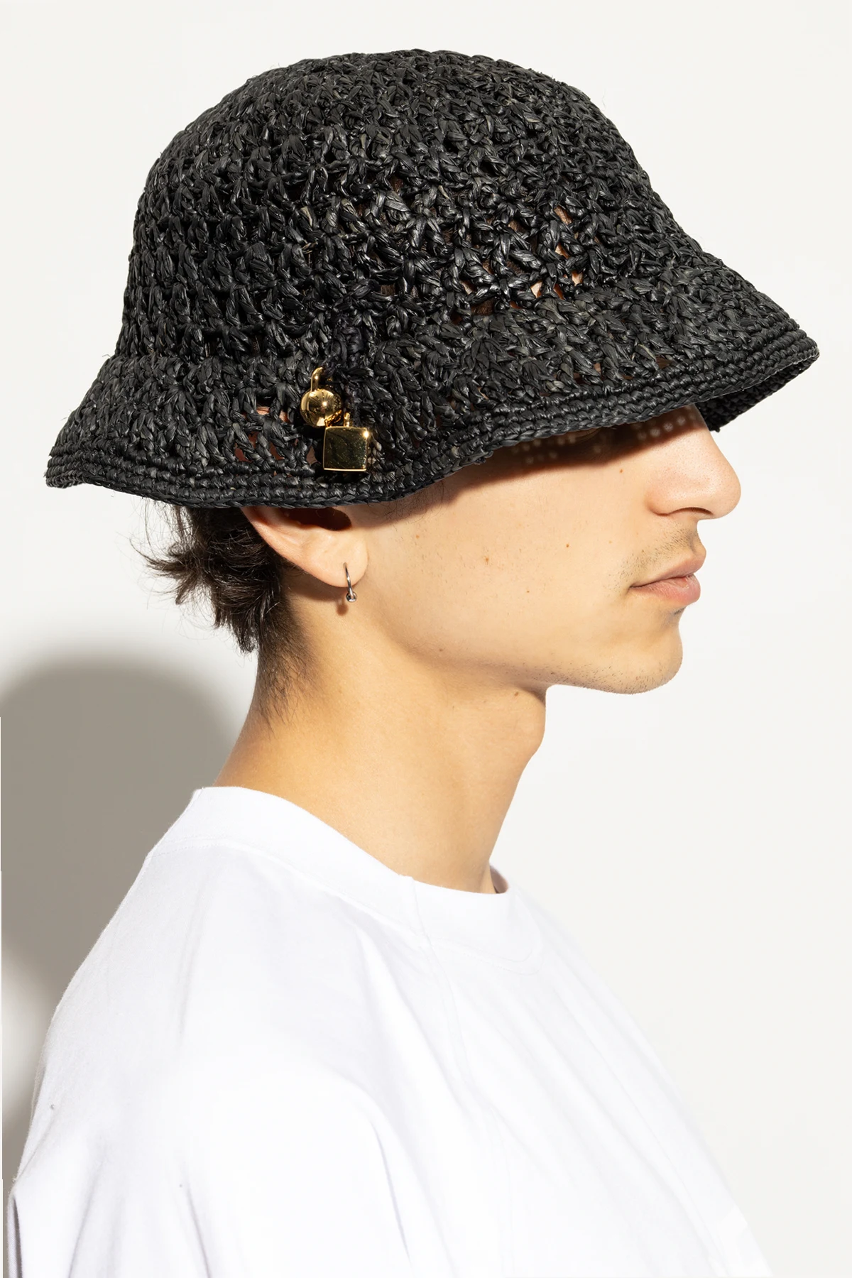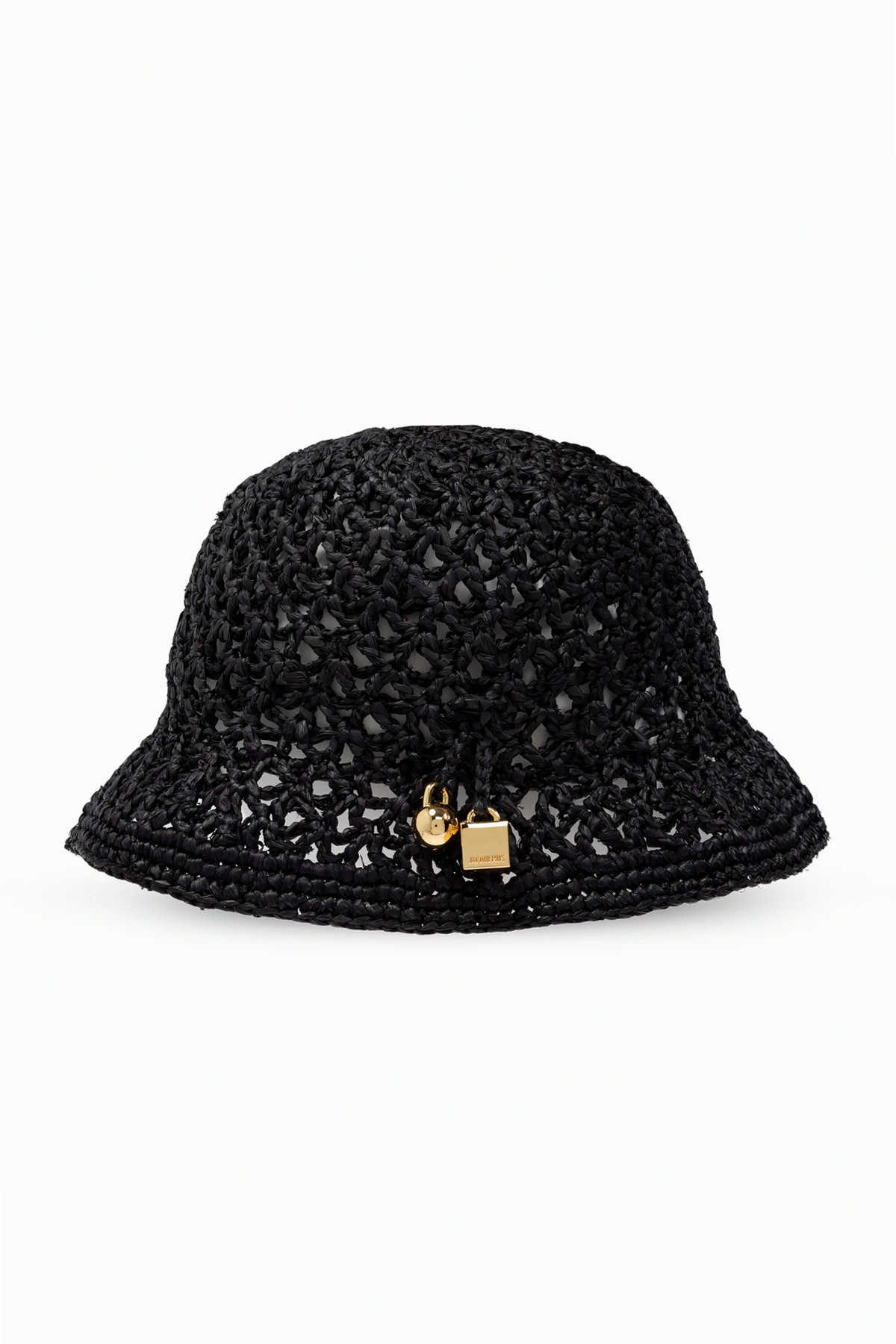 Die Exklusivität dieses Produkts wird durch eine kleine, auf der Seite angebrachte, goldene Anhänger mit dem Jacquemus -Logo hervorgehoben, ein subtiler, aber erkennbarer Akzent von Luxus. Die schwarze Farbe des Hutes verleiht Eleganz und macht ihn zu einem universellen Accessoire, das zu vielen Outfits passt.