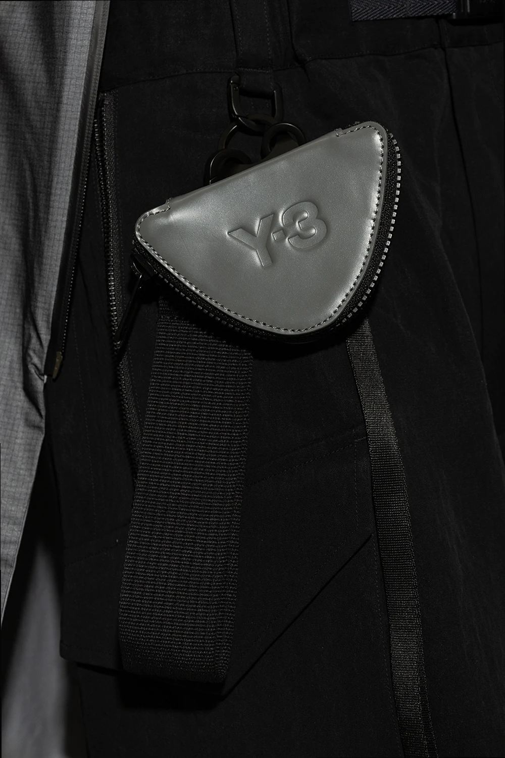 Grey and black pouch on a strap from Y-3 Yohji Yamamoto. Crafted from leather, this design fastens with a zipper and features an embossed logo on the front, a detachable, wide wrist strap, neck lanyard and one internal compartment with a slip pocket.