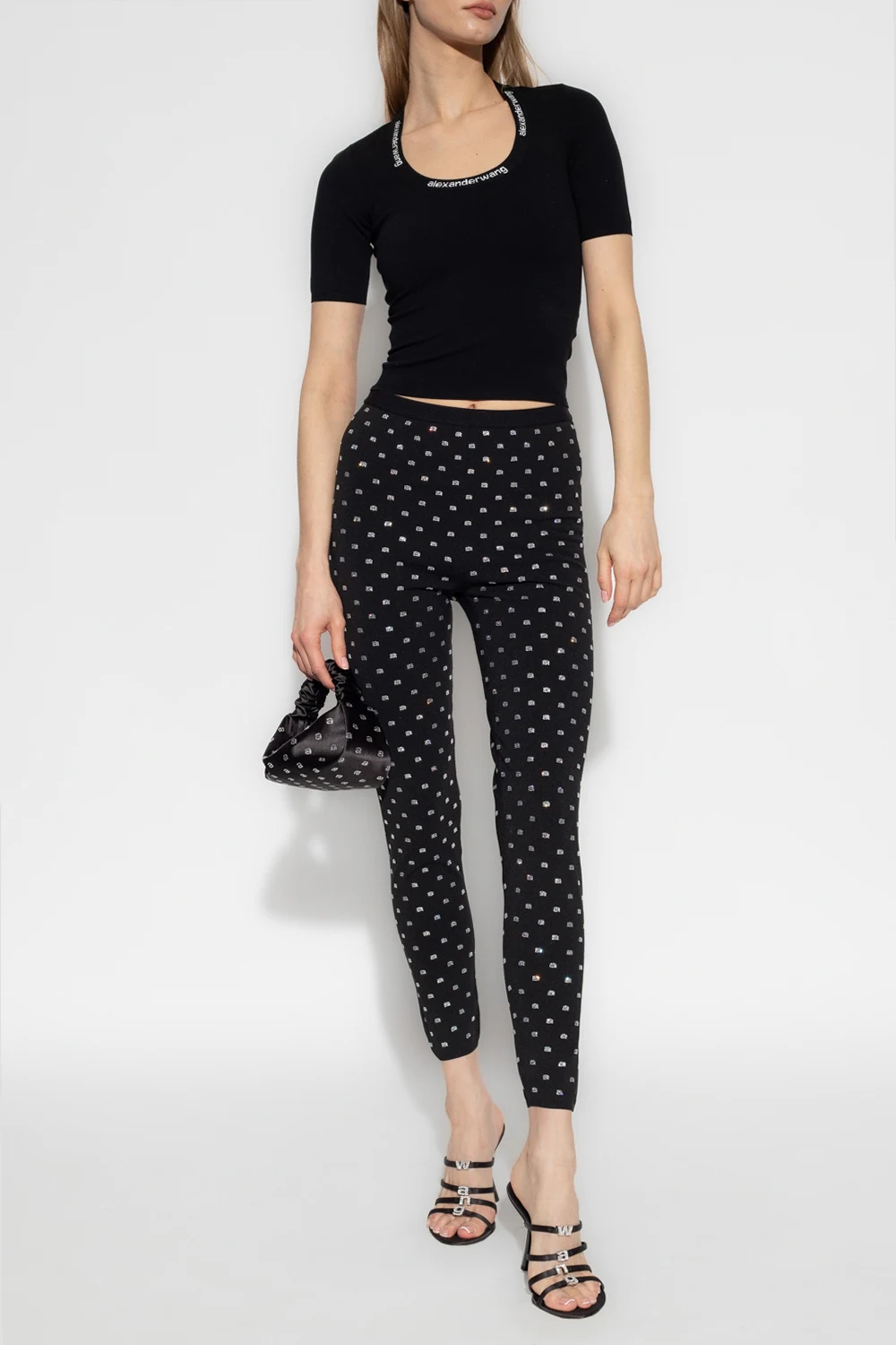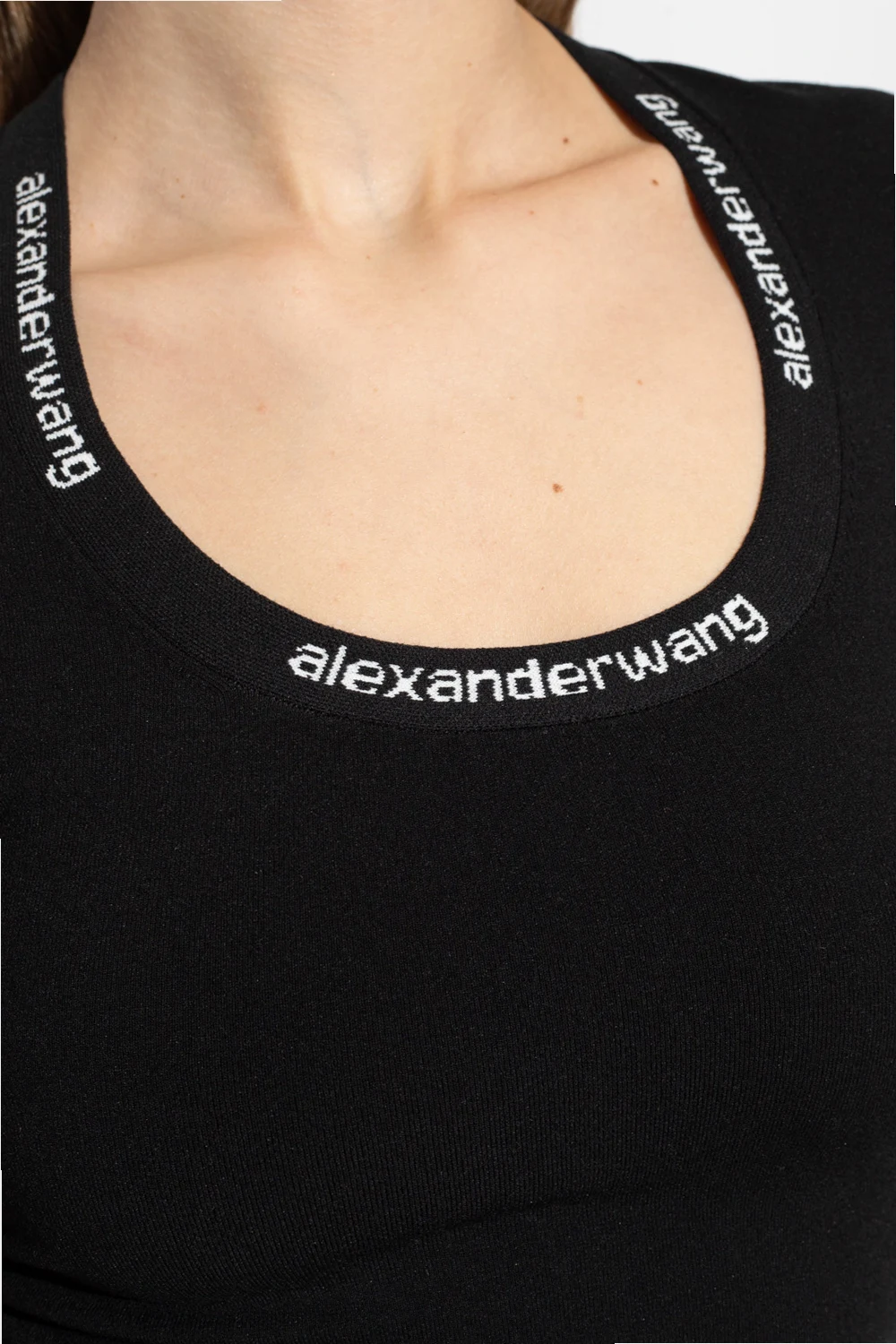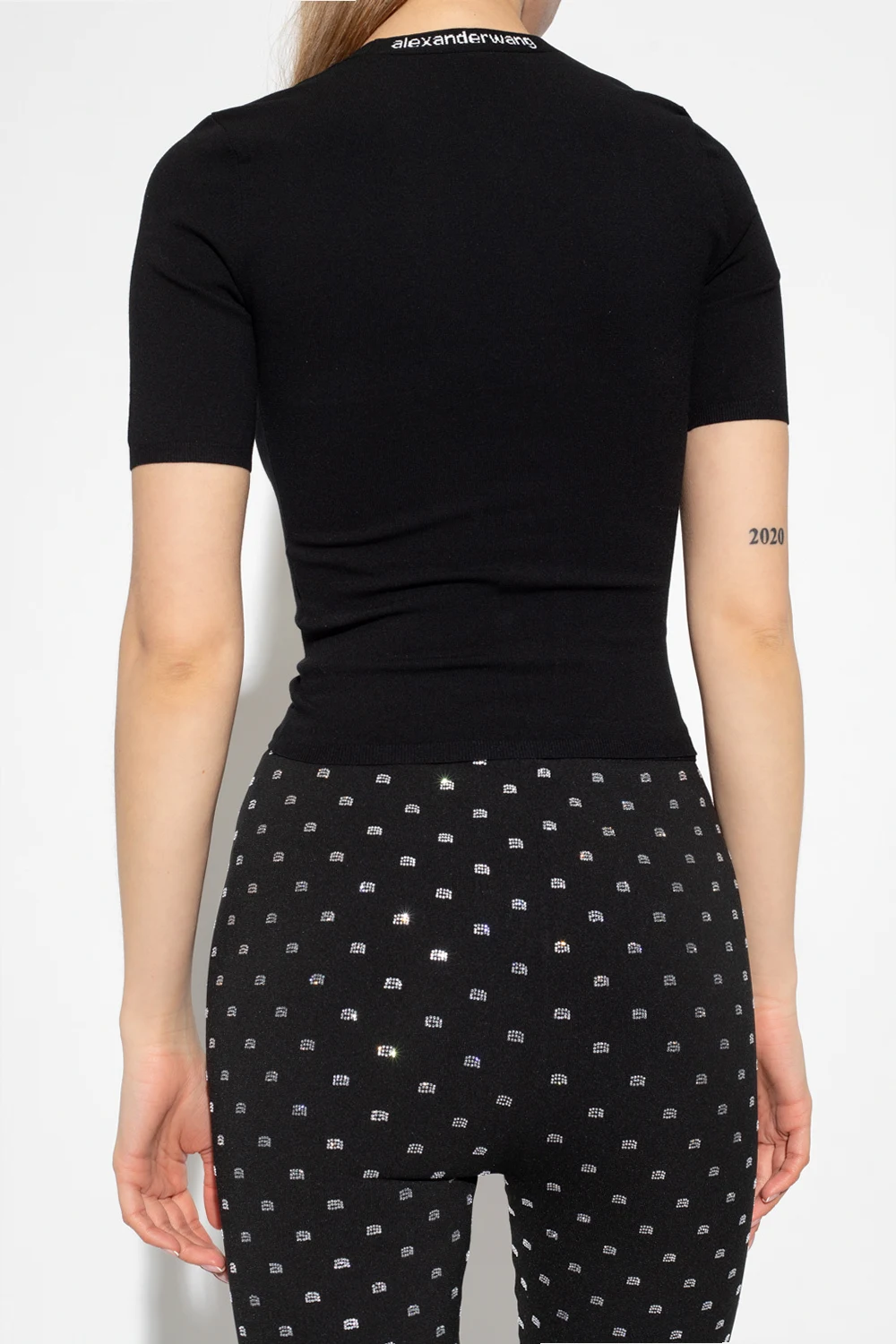 Black fitted top from T by Alexander Wang. This short sleeve design has a ribbed round neck with a white logo embroidery.