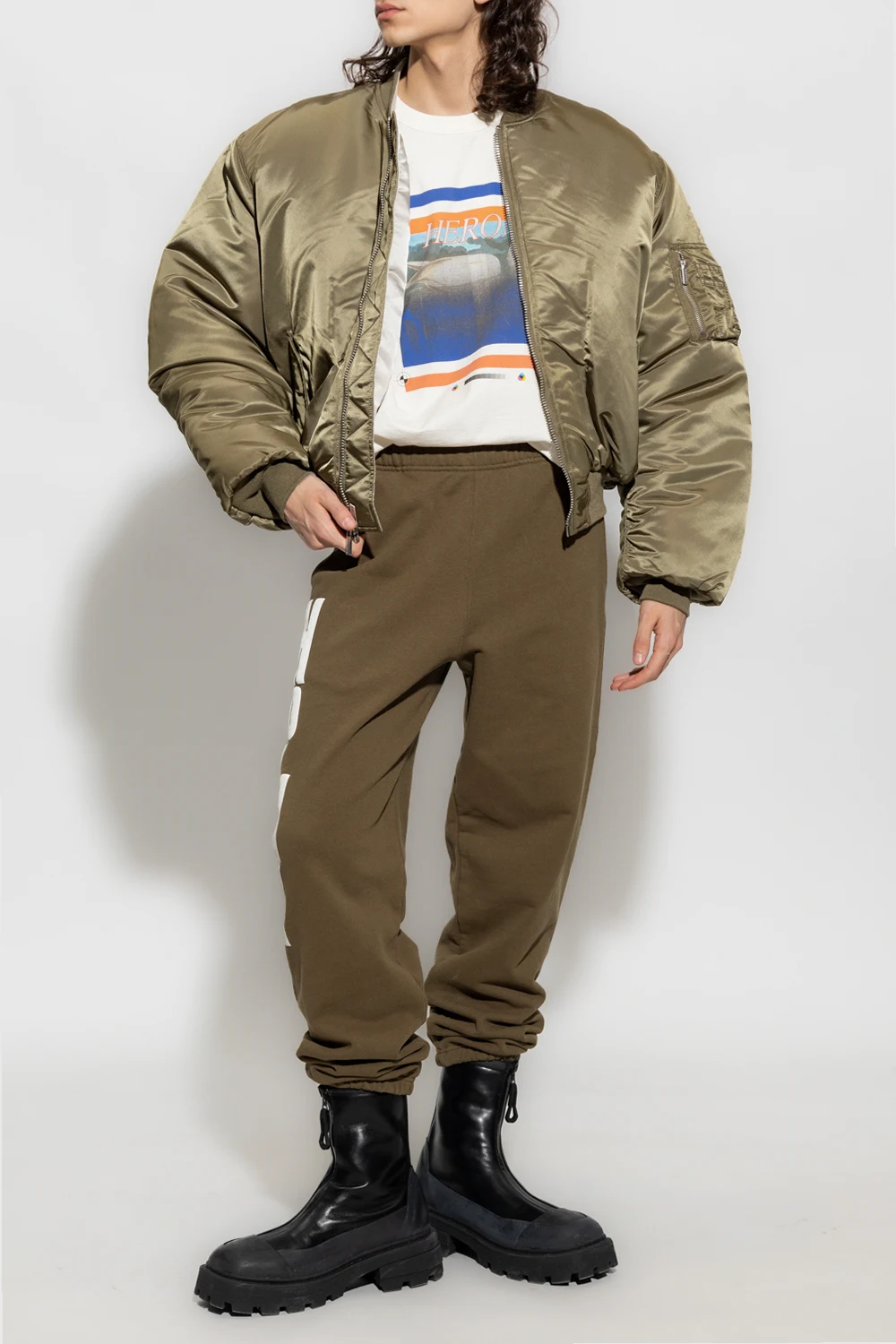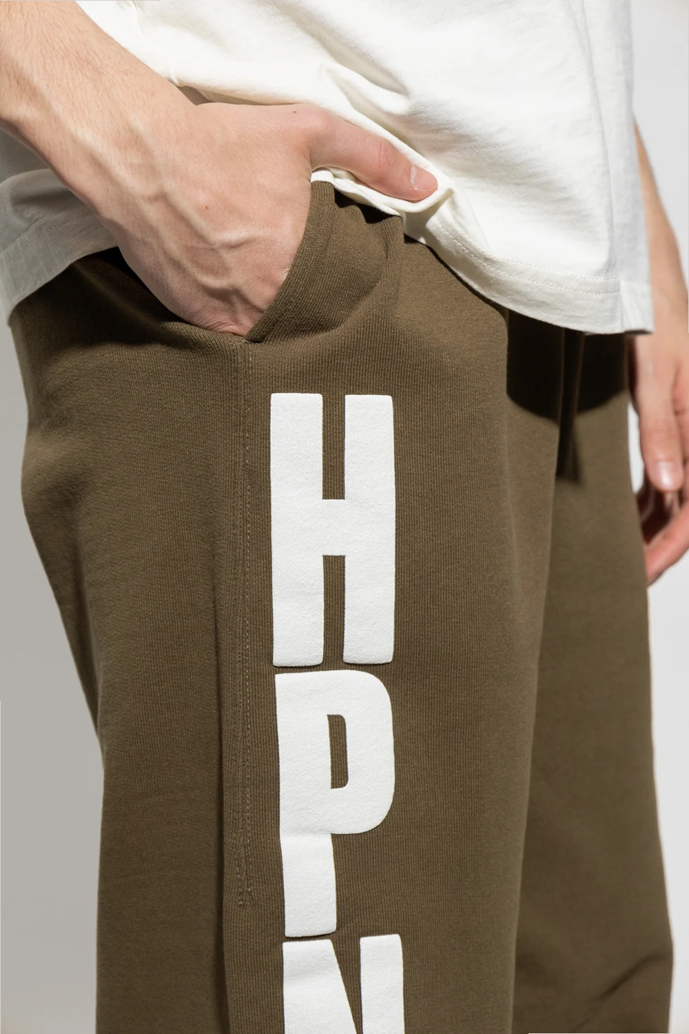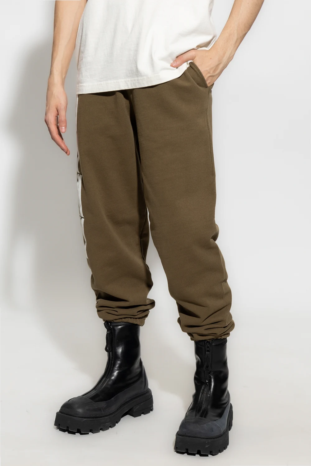 Green sweatpants from Heron Preston. Crafted from cotton, this pair features an elastic drawstring waistband, white logo print on the front, orange patch at the back, two slip pockets and ribbed cuffs.