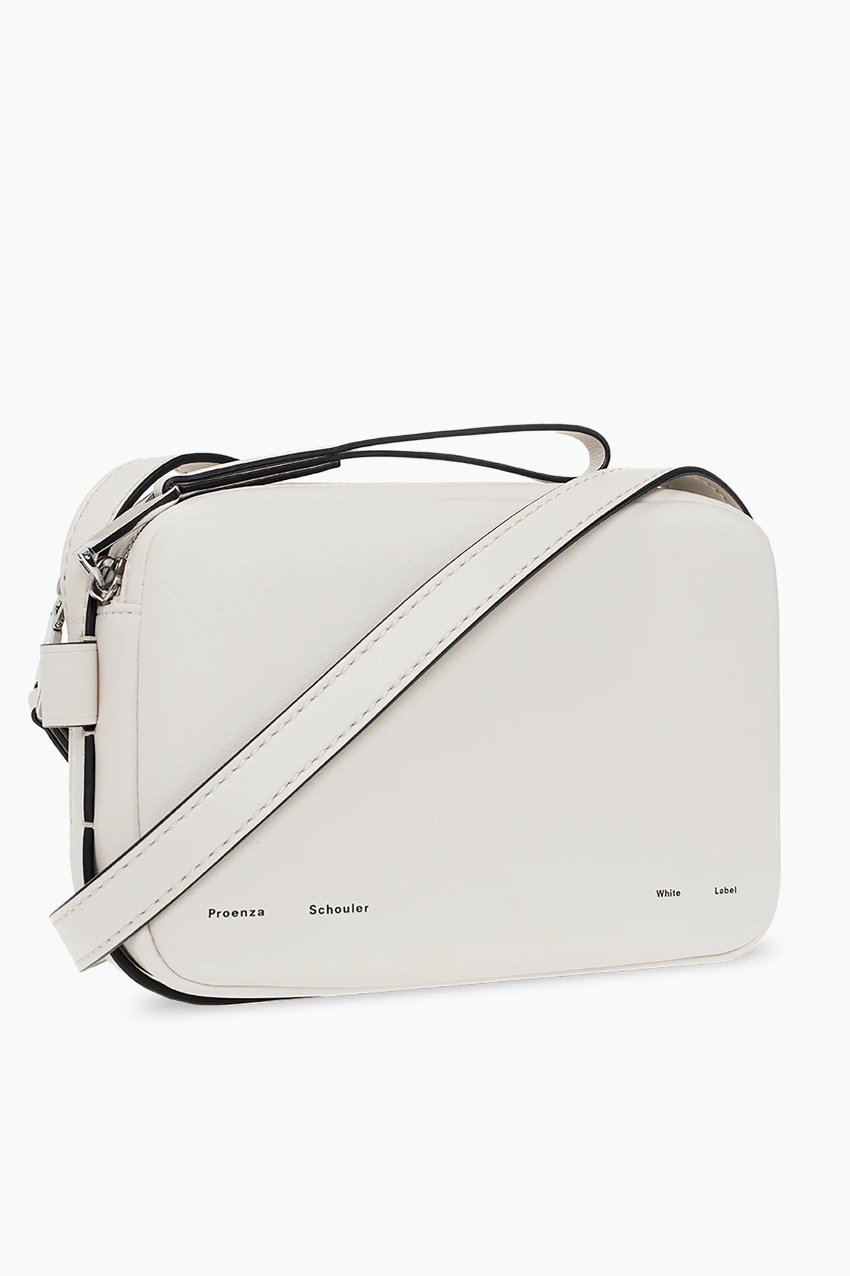Cream ‘Watts’ shoulder bag from Proenza Schouler White Label. Crafted from leather, this design features a zip fastening, a black logo print on the front, an adjustable shoulder strap, silver-tone metal hardware and an interior with two separate compartments – one has a slip pocket inside.