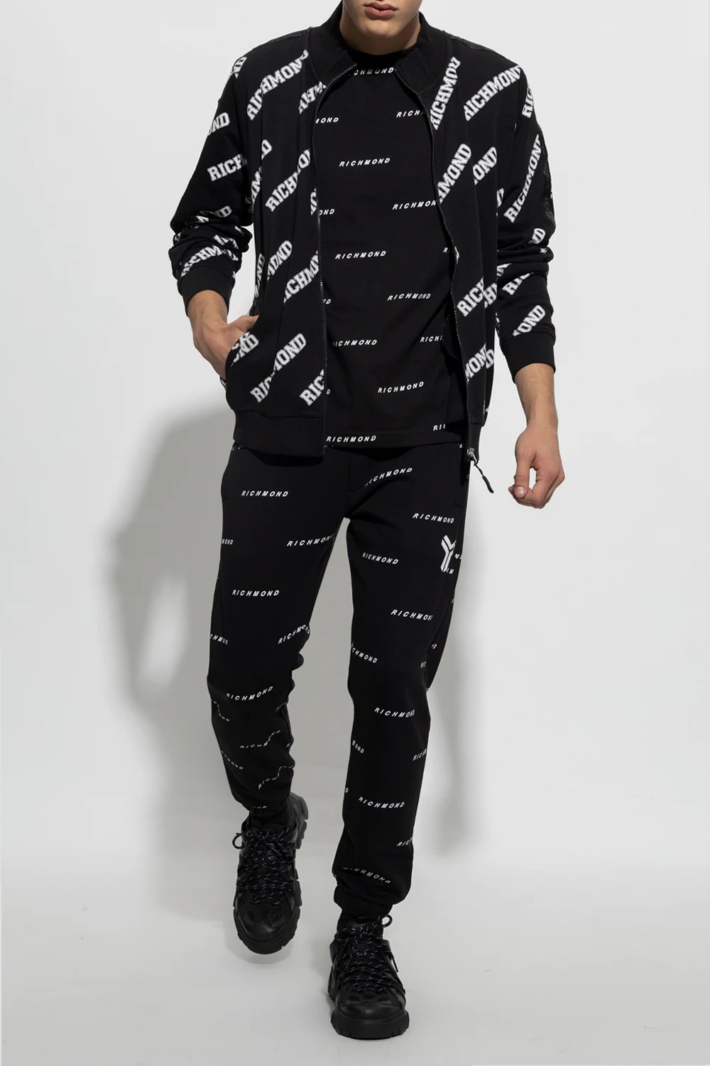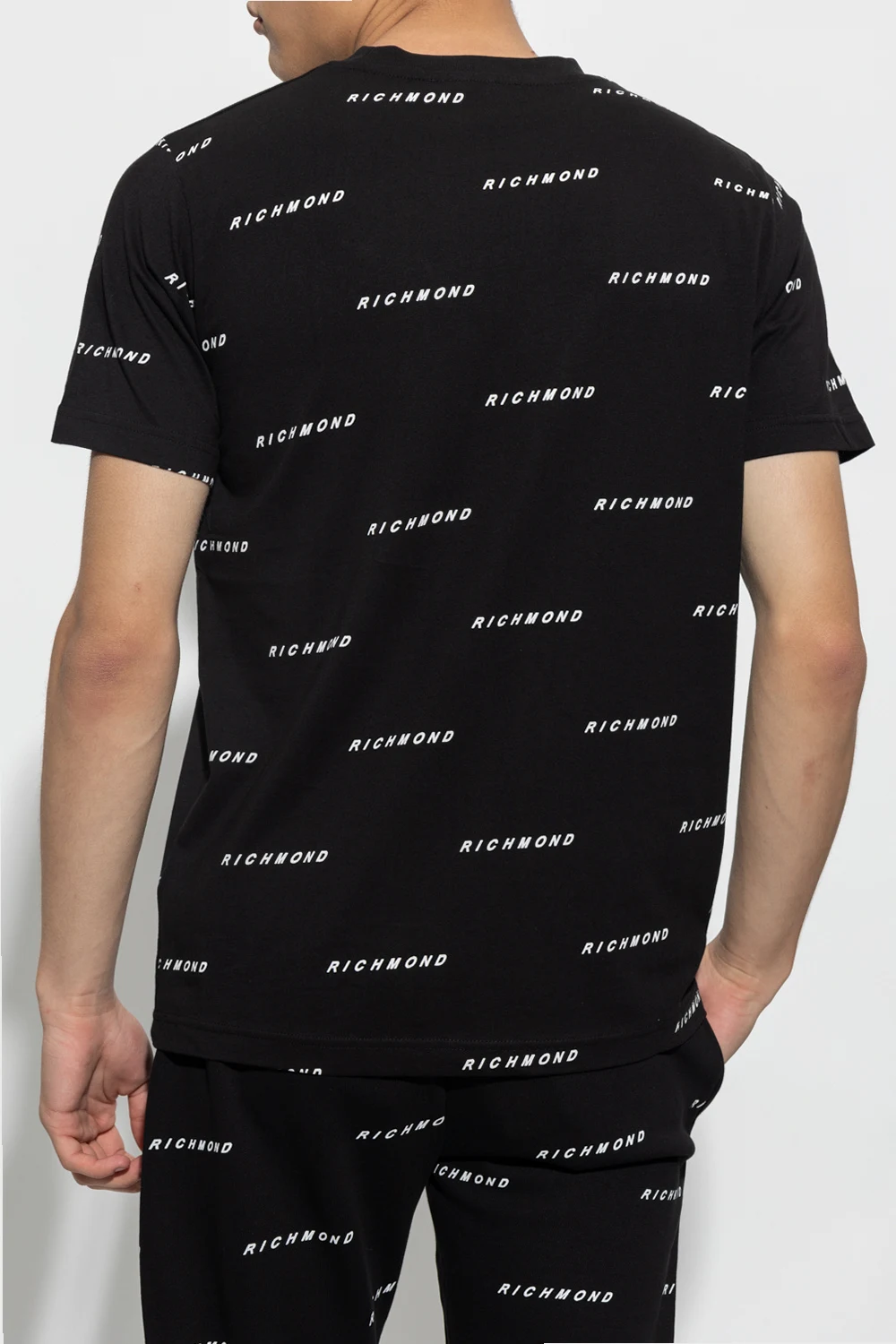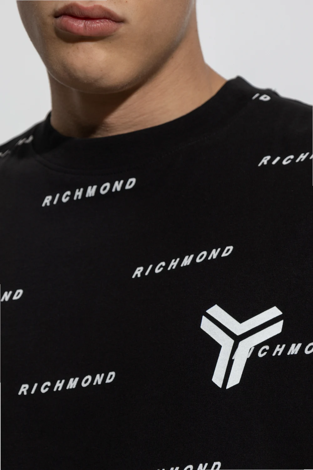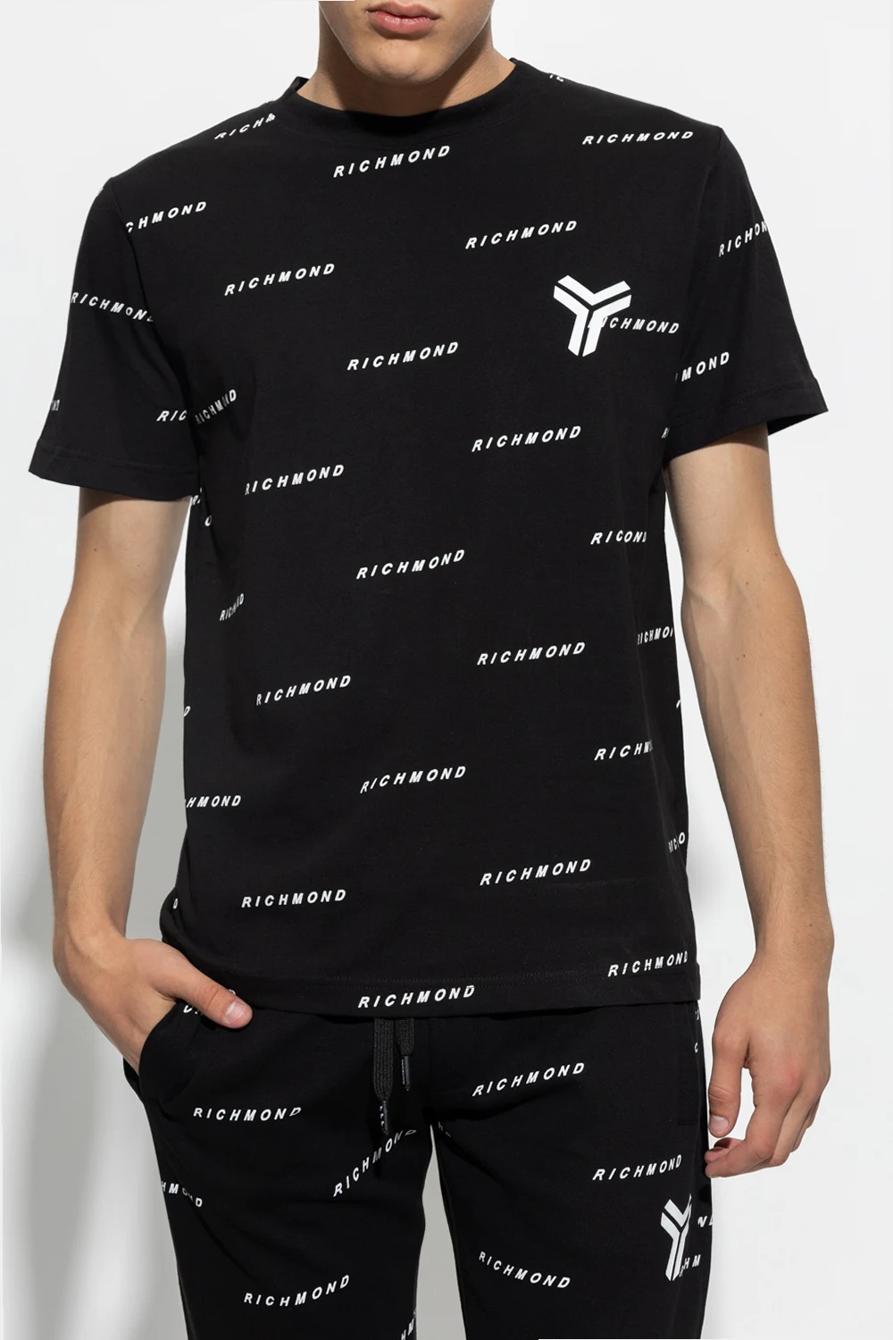 Black crewneck T-shirt from John Richmond. Made from cotton, this style features short sleeves, an elasticated collar and a white graphic motif with the brand's logo.