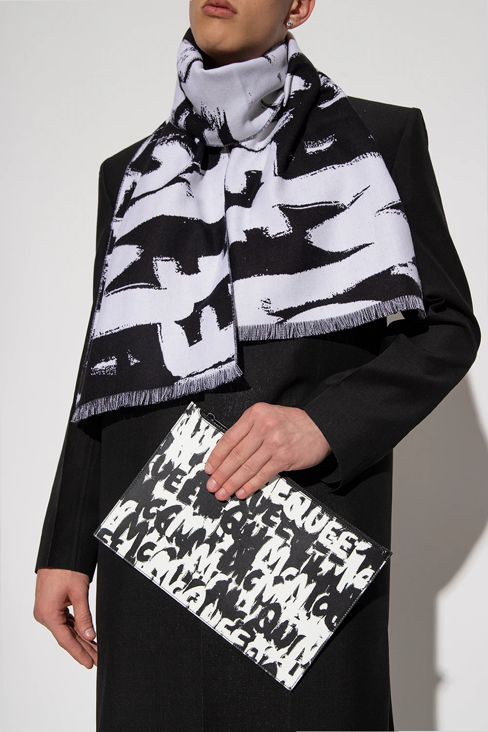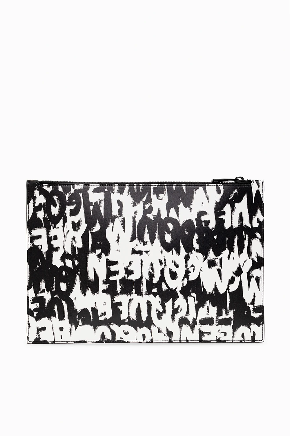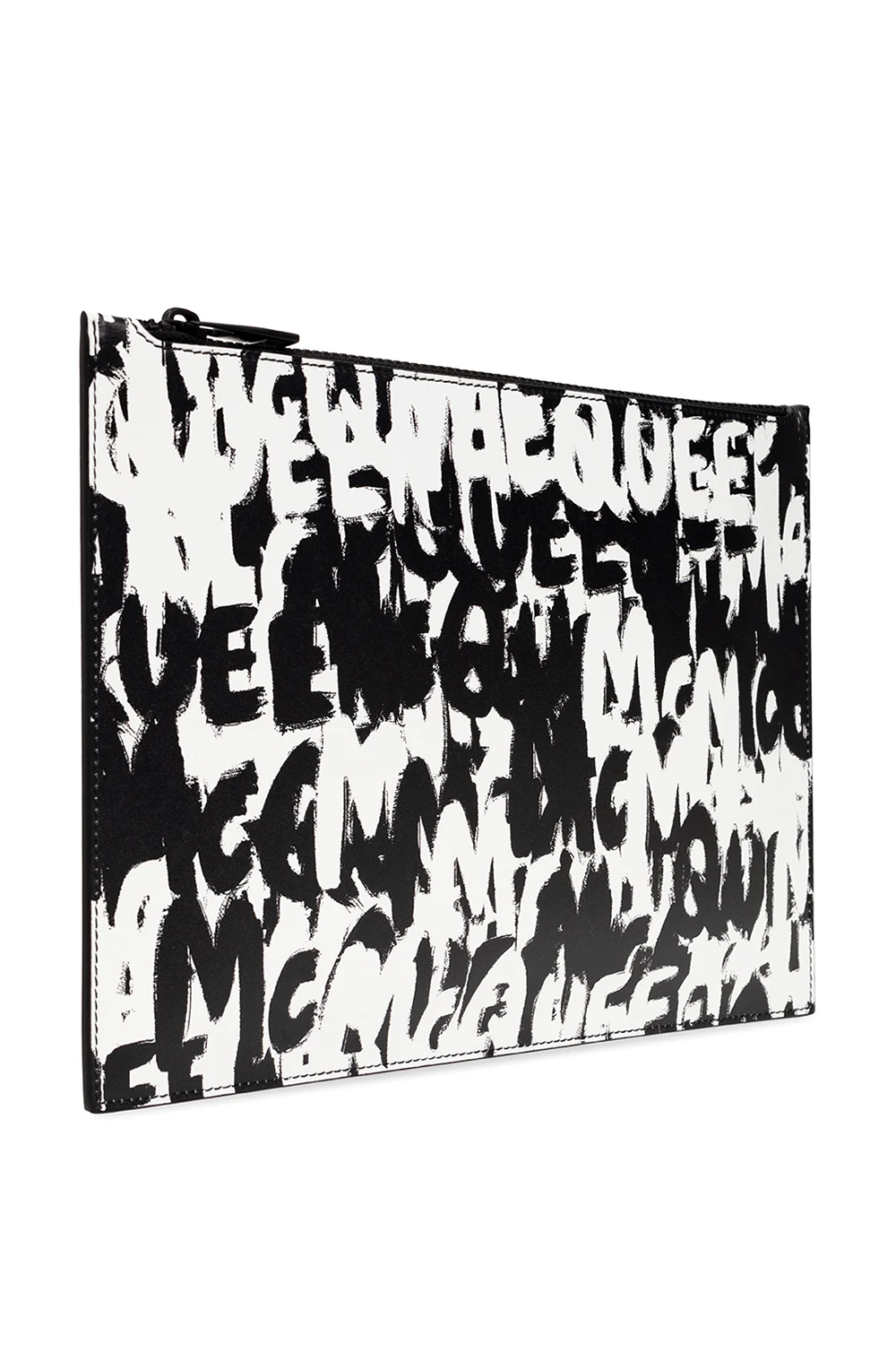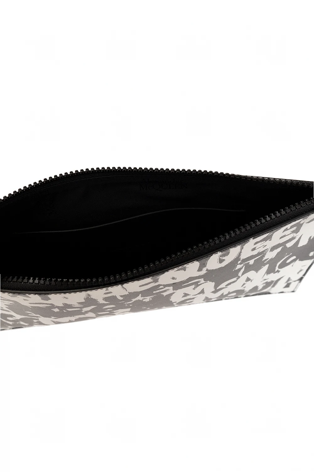 Black and white pouch from Alexander McQueen. Made of leather, this model features a zip fastening and McQueen Graffiti logo pattern. It has six card slots and one slip pocket inside.