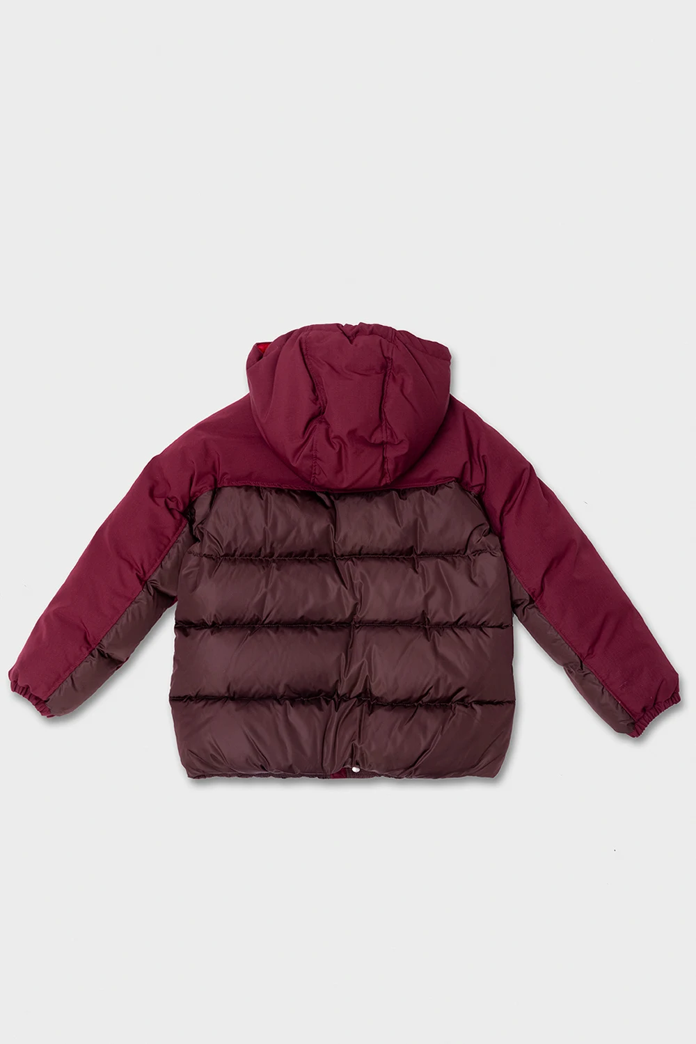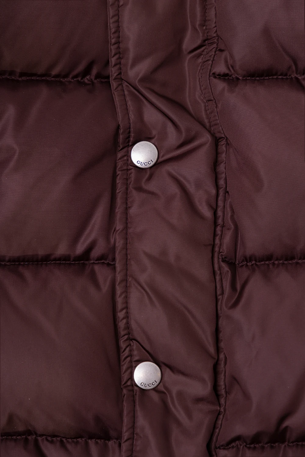 Maroon and brown down jacket from Gucci Kids. Embroidered with the brand's logo, this style features a zipper, snap fastenings, frontal pockets, a red lining and long sleeves with elasticated cuffs.