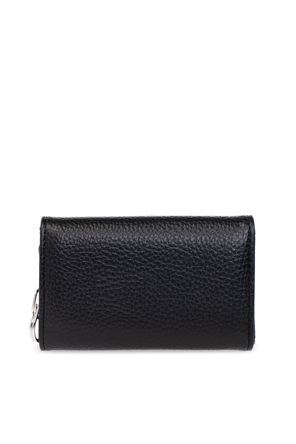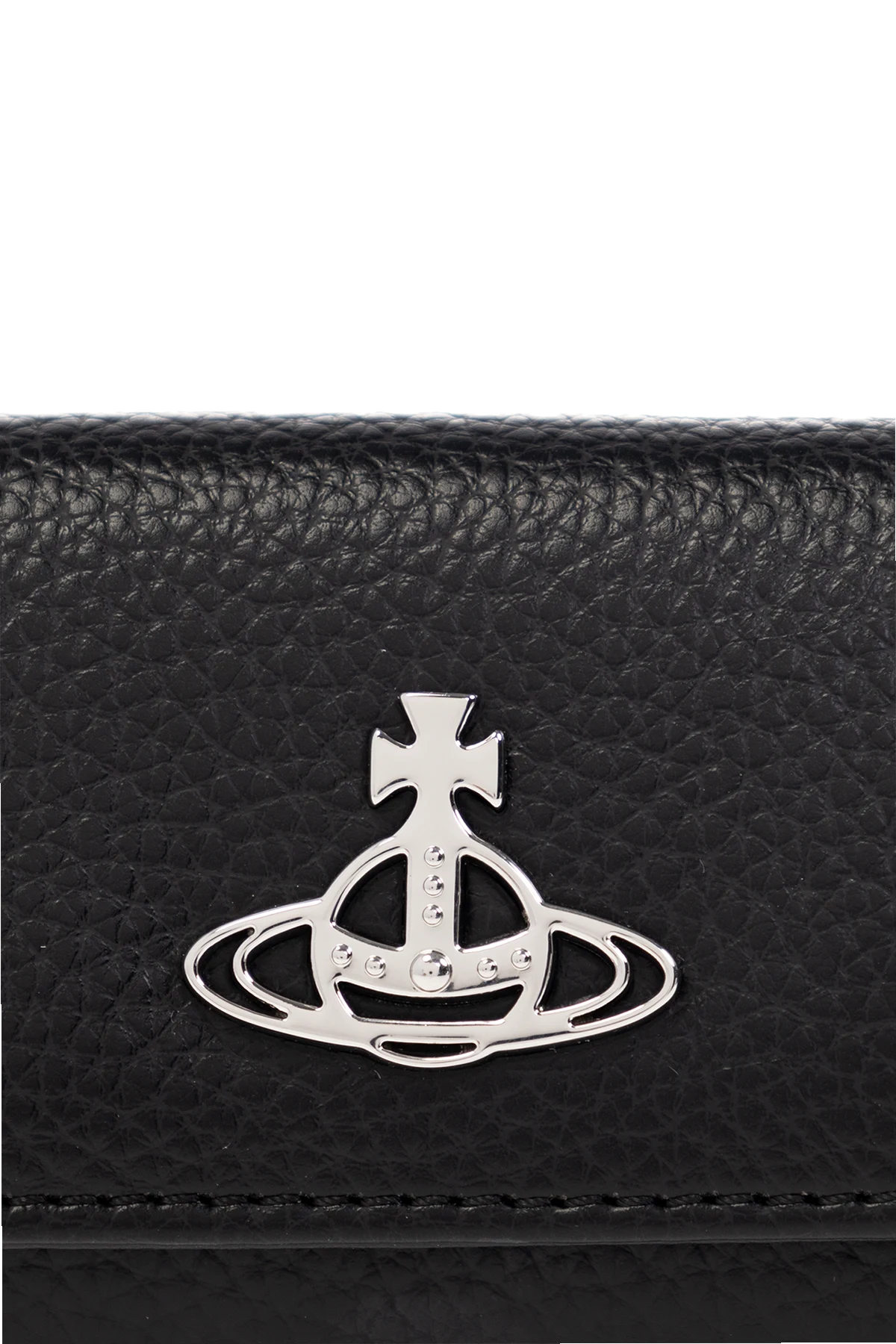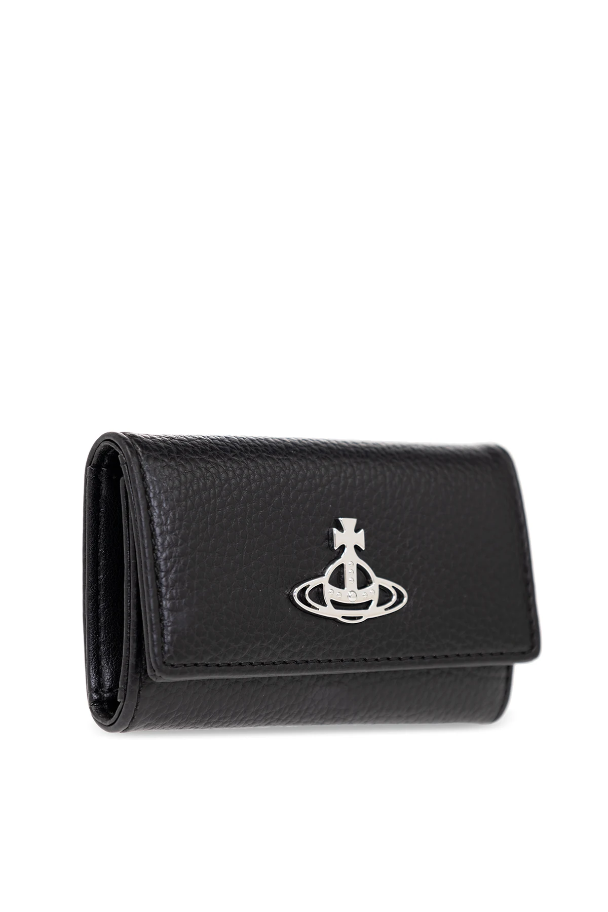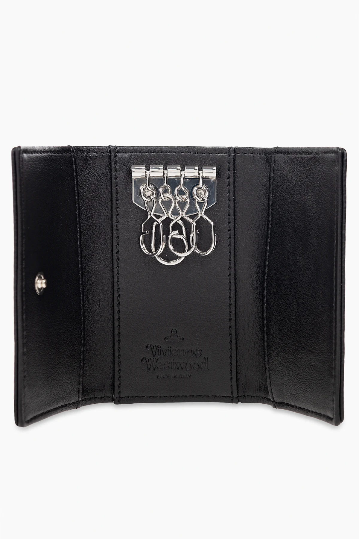 Black key holder from Vivienne Westwood. Made of vegan leather, this item features a snap closure, silver-tone logo detail as well as four hooks and three slip pockets inside.