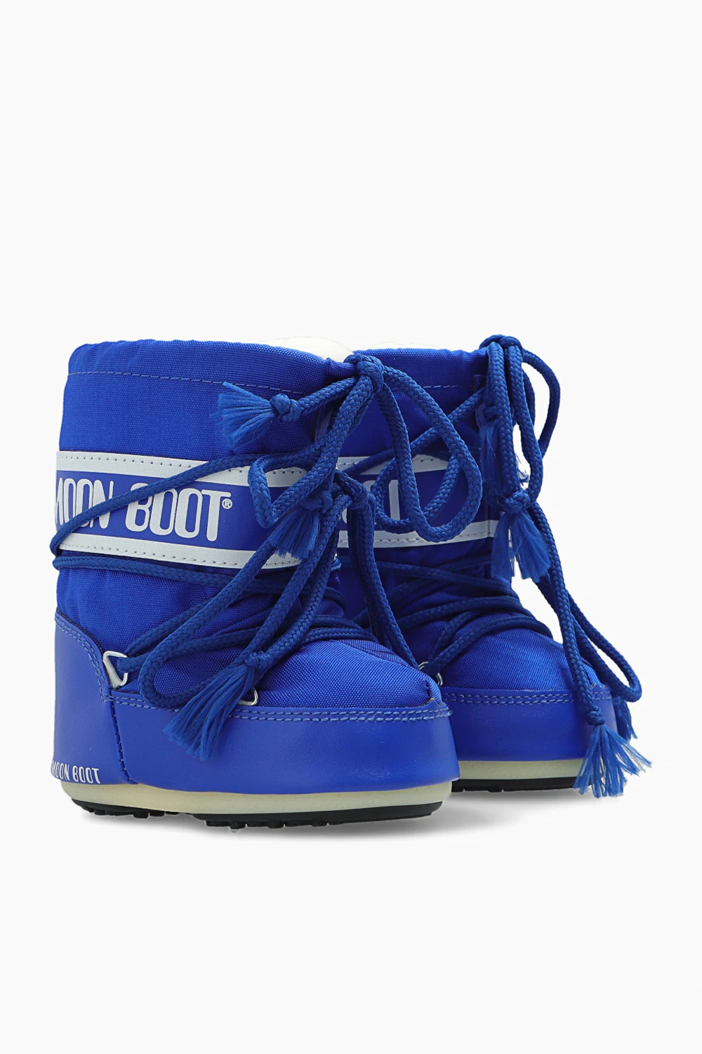 Blue and white ‘Icon Nylon’ snow boots from Moon Boot Kids. Fastened with double laces, this pair features a logo print, silver-tone metal hardware and rubber sole in beige and black. Inspired by the peculiar shape and technology of the astronauts’ boots, the iconic style was designed in 1969 after the first Moon landing.