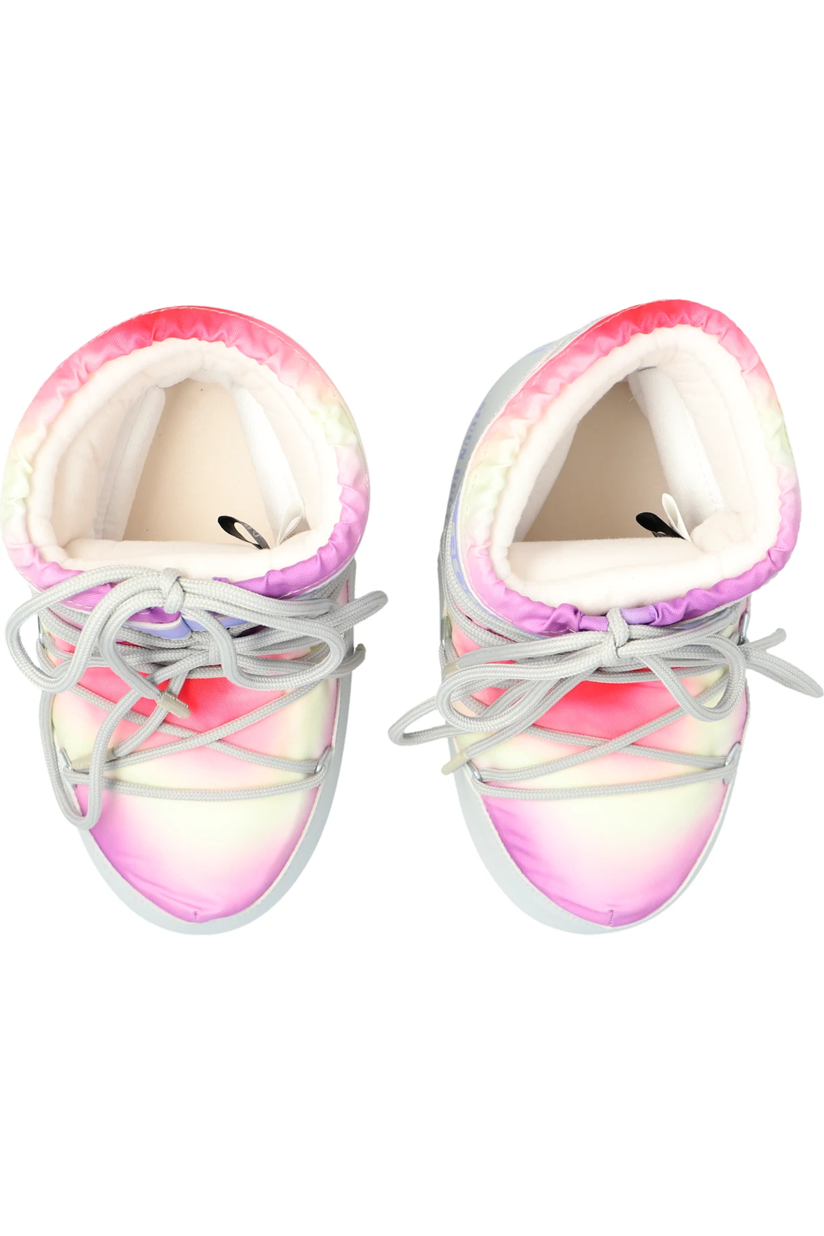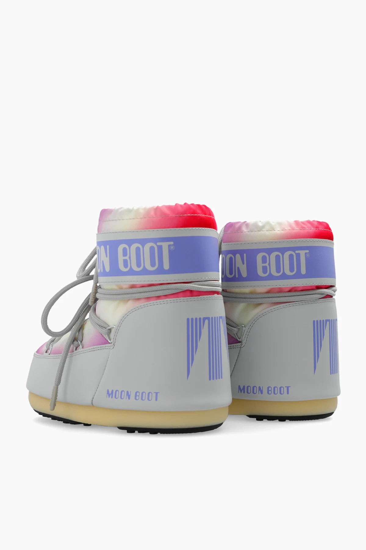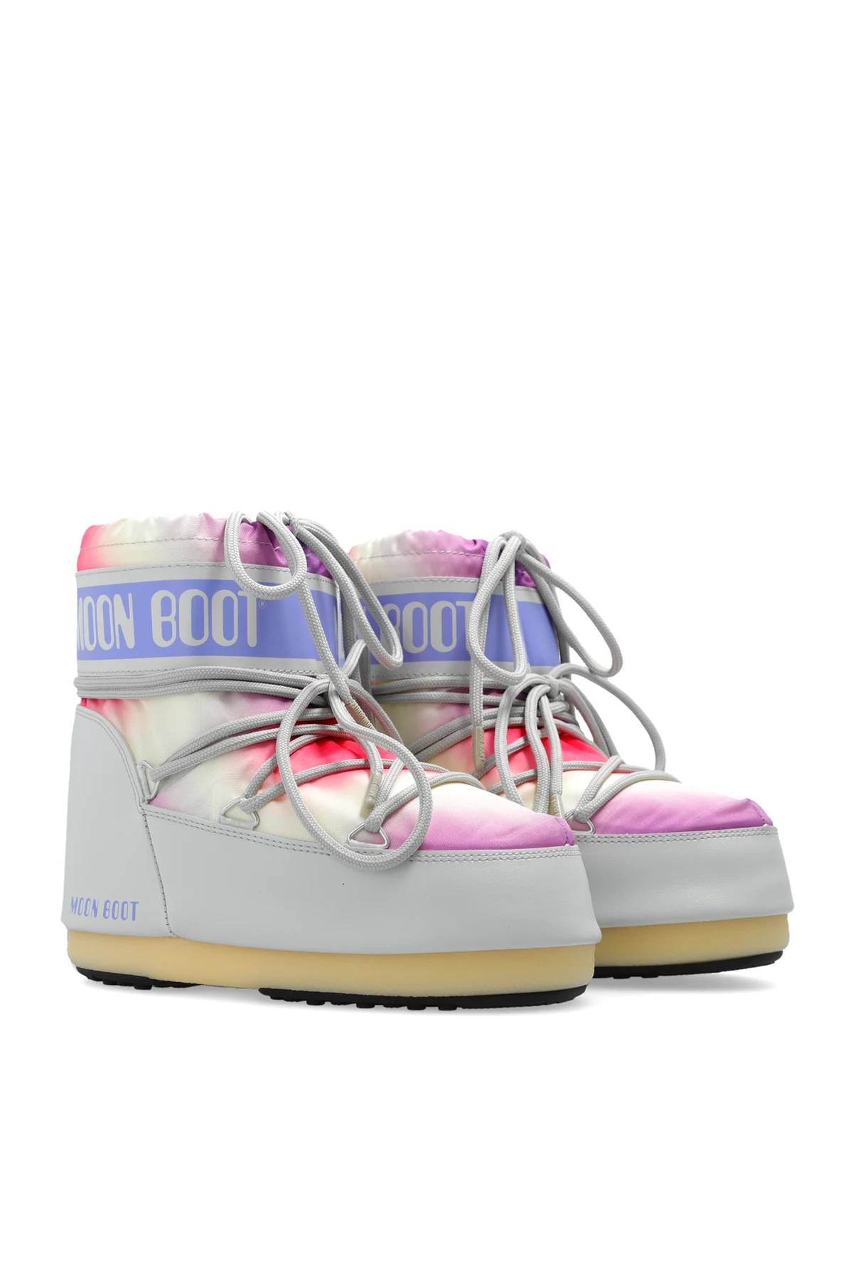 Multicoloured ‘Icon’ snow boots from Moon Boot. Made of waterproof material, this model sits on a beige and black tread rubber sole for traction on all terrains and showcases a tie-dye motif, the brand's logo, double lace-up detailing and silver-tone metal hardware.