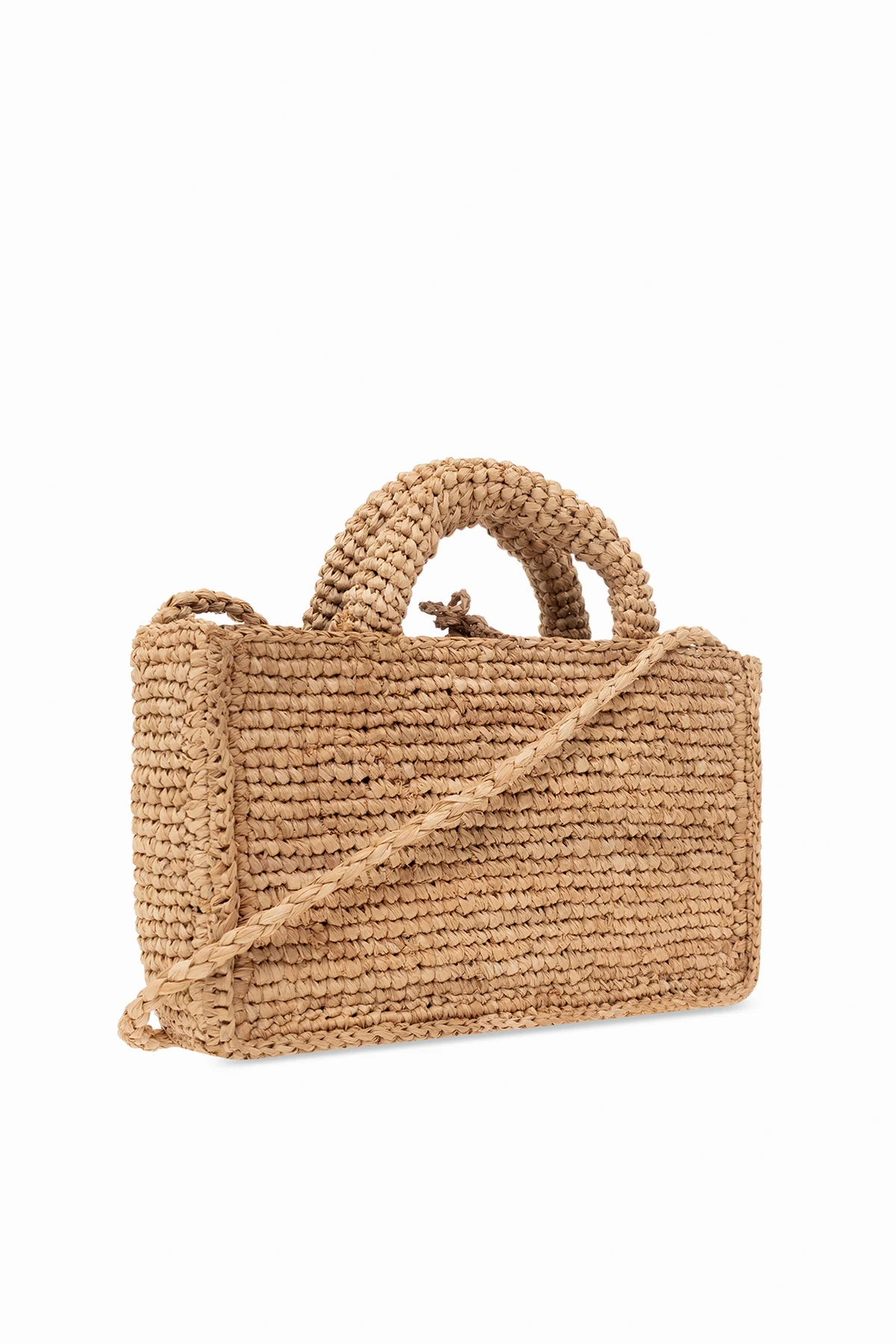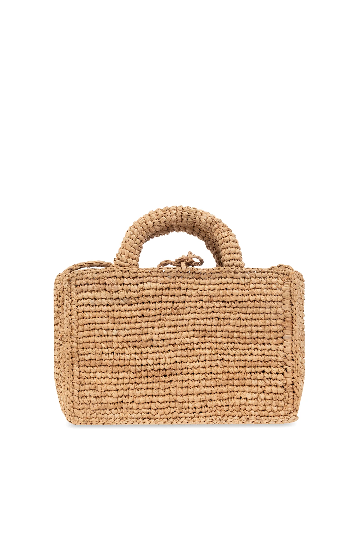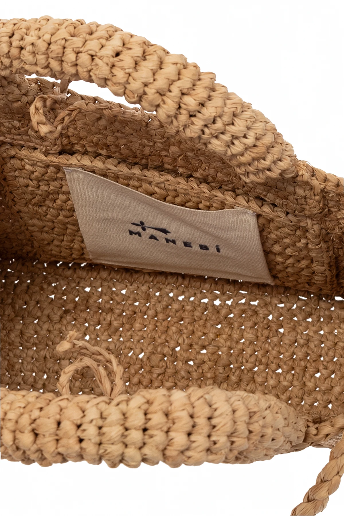 Beige ‘Sunset Mini’ shoulder bag from Manebi. Made from raffia, this design cinches closed with drawstrings and features a woven strap, two half-round handles and one internal compartment with a card slot.