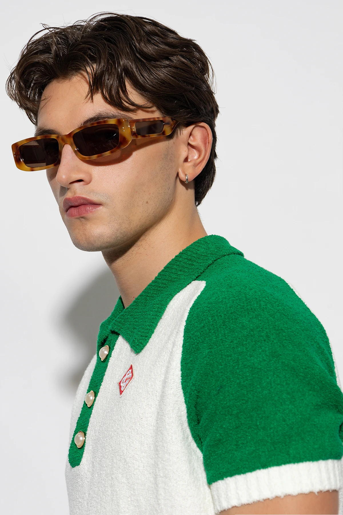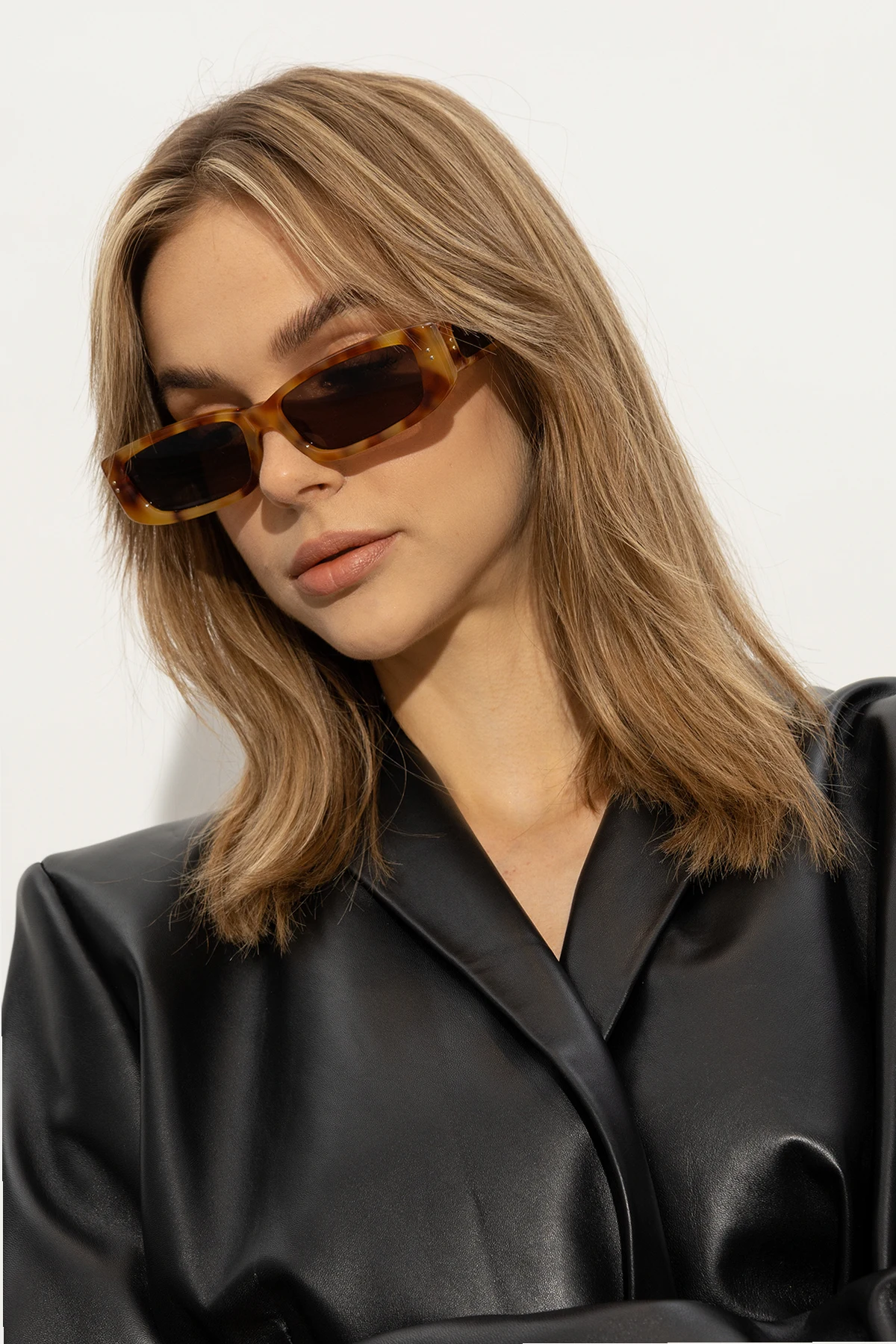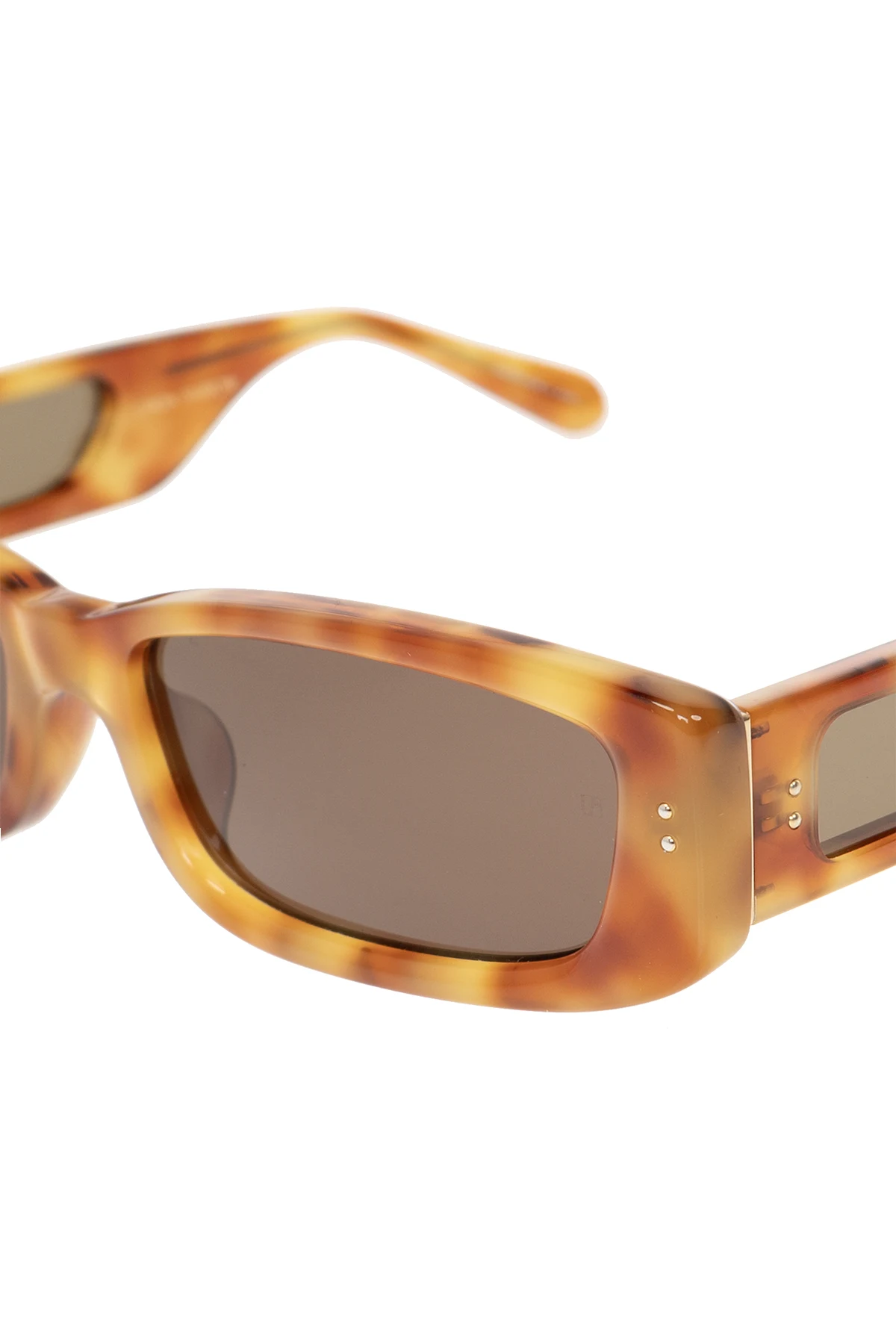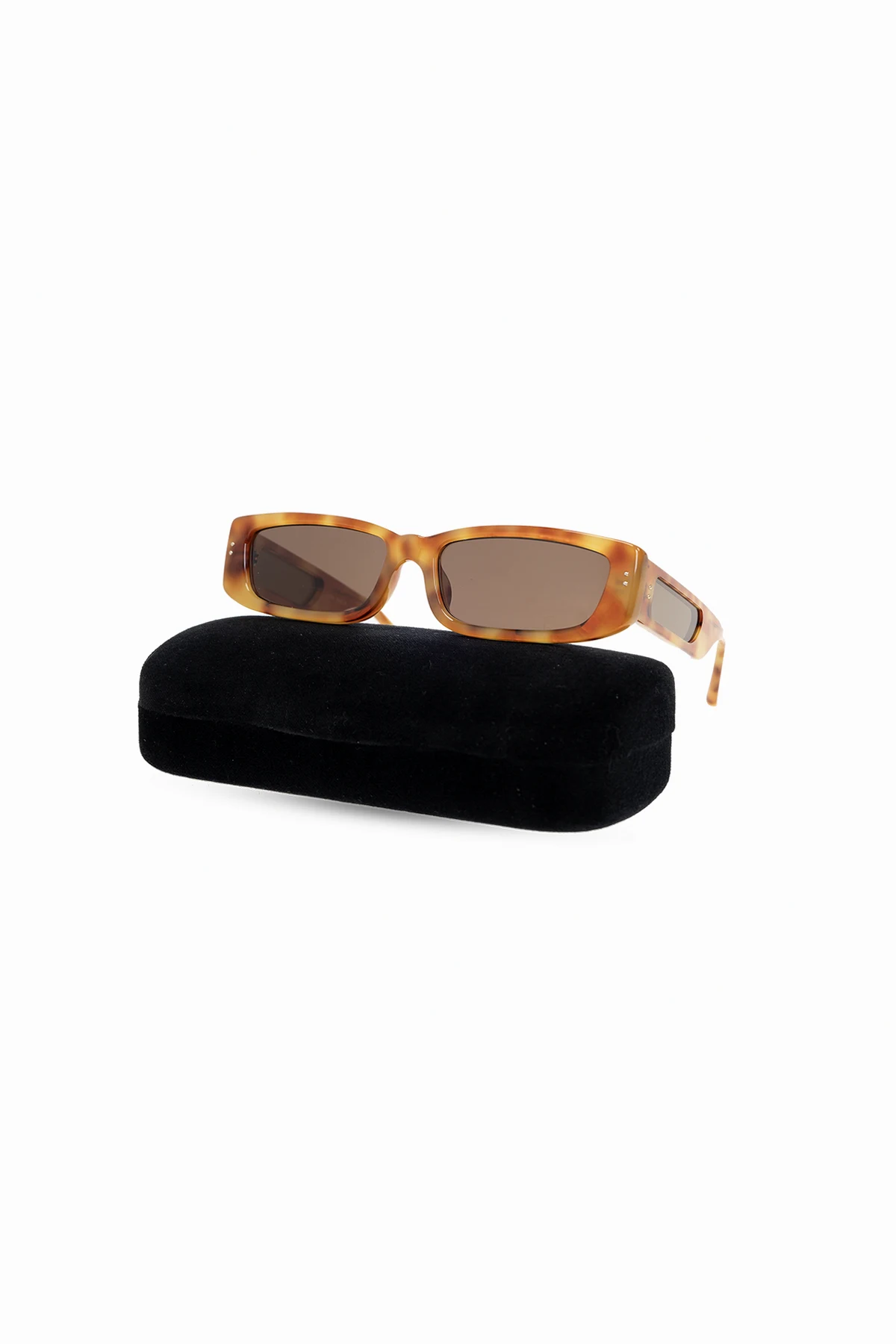 Brown and yellow ‘Talita’ sunglasses from Linda Farrow. Made of hand-polished acetate with a tortoiseshell effect, this pair features a rectangular frame, lens inserts at the temples and brown lenses with UV protection. Case included.