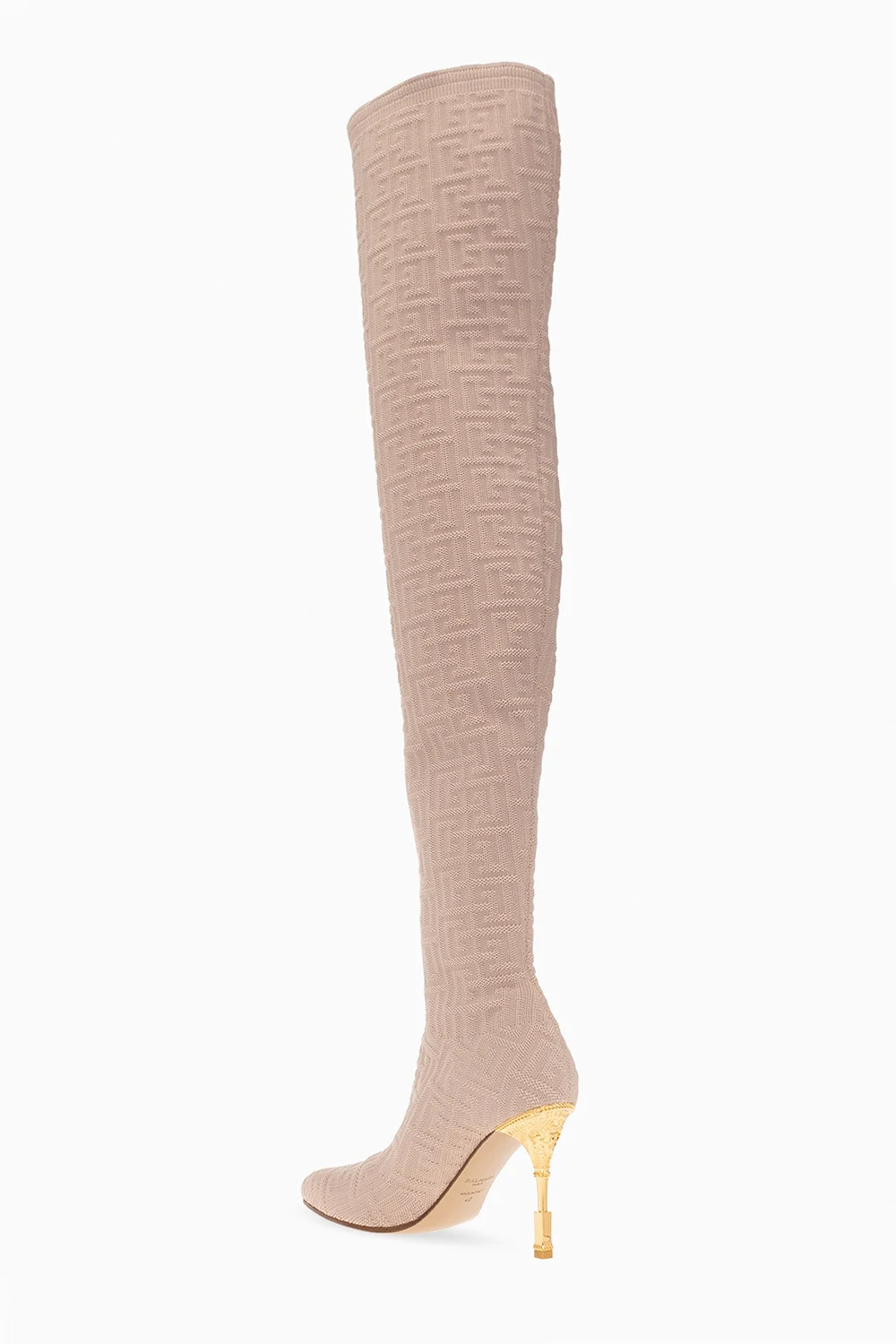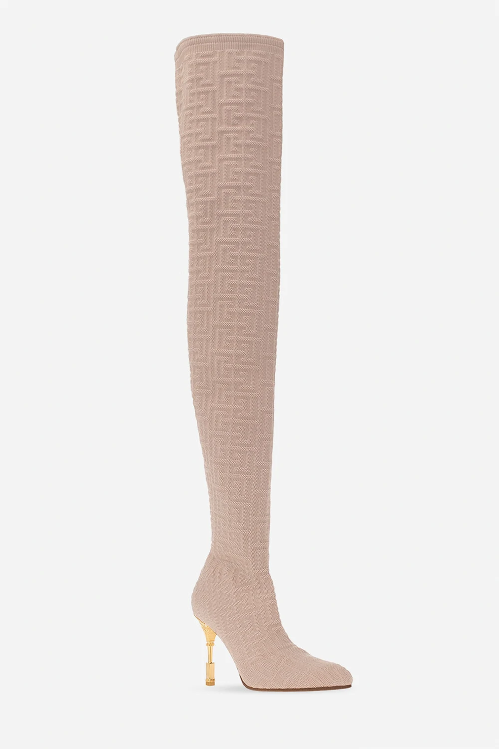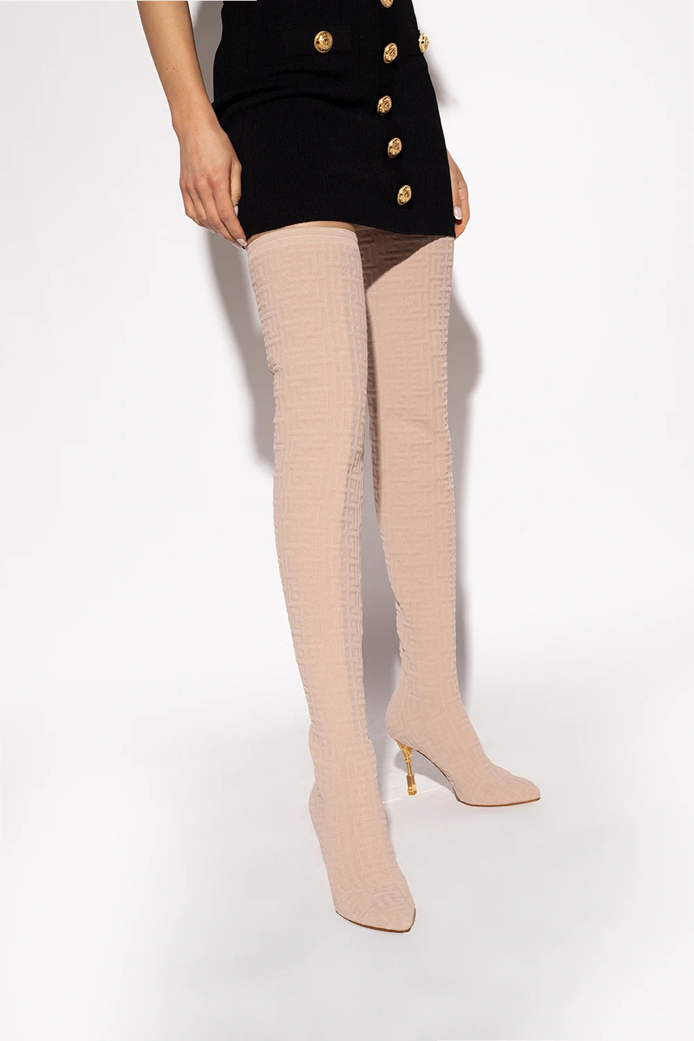 Light beige ‘Moneta’ heeled slip-on boots from Balmain. This thigh-high pair features an embroidered monogram pattern, pointed toe, decorative logo detail in gold-tone and beige leather sole.