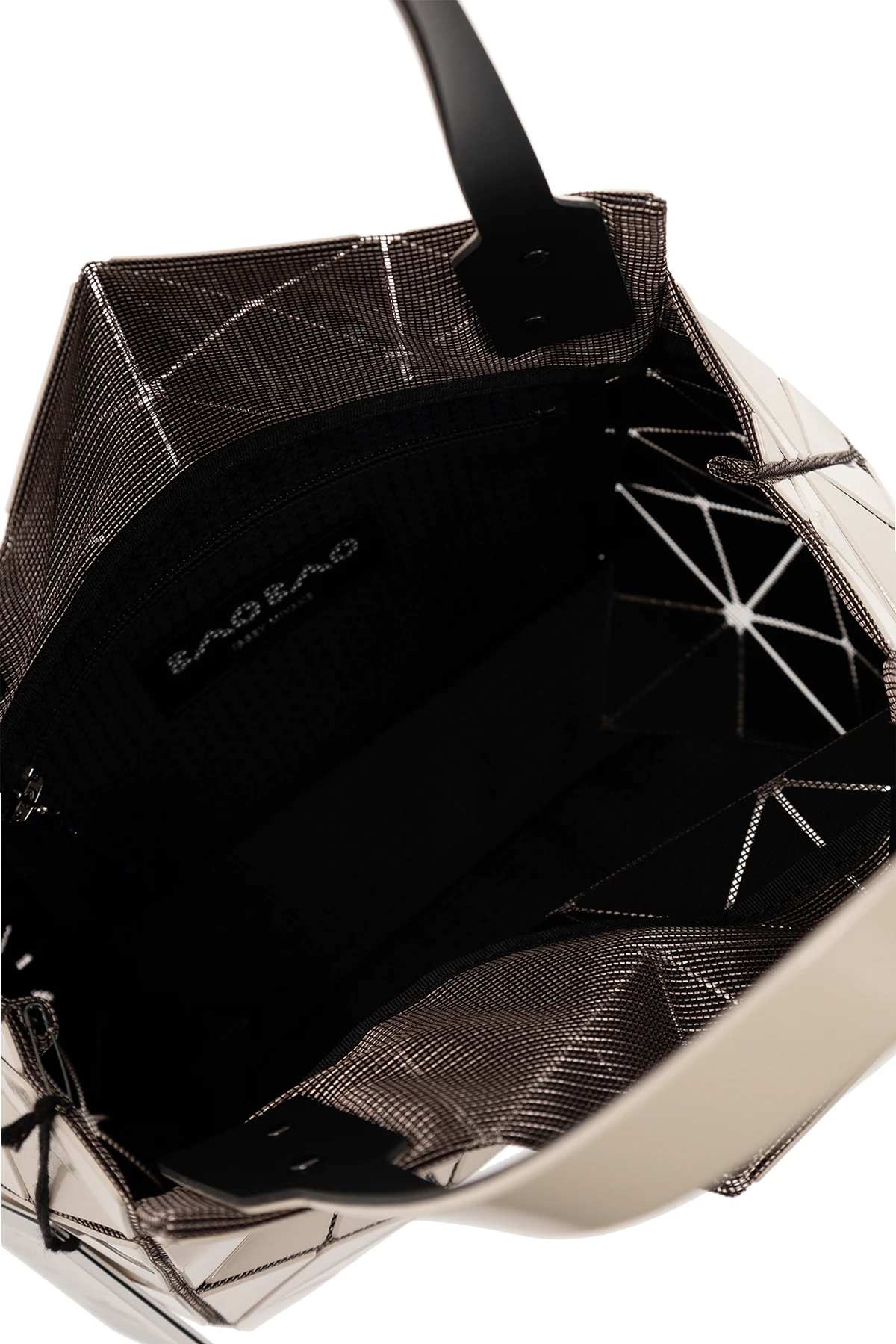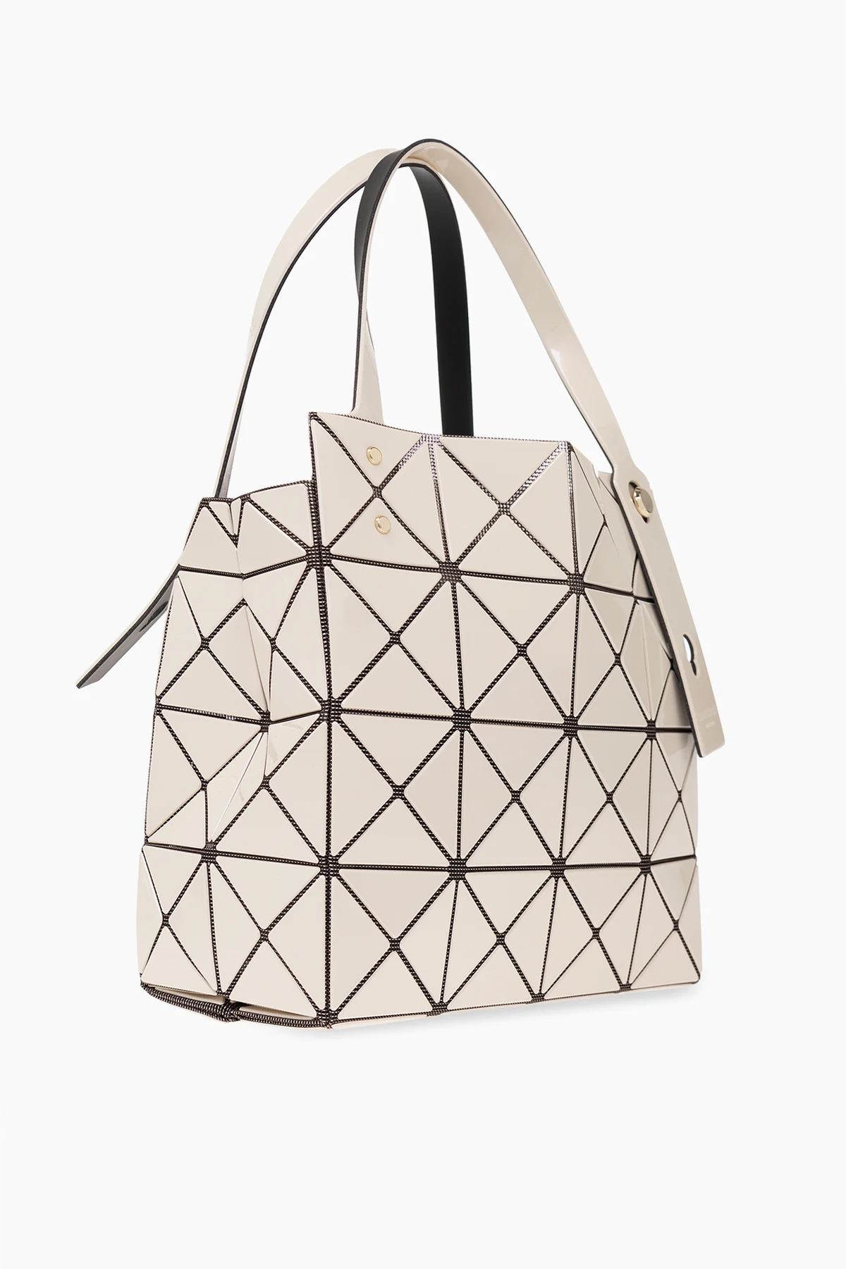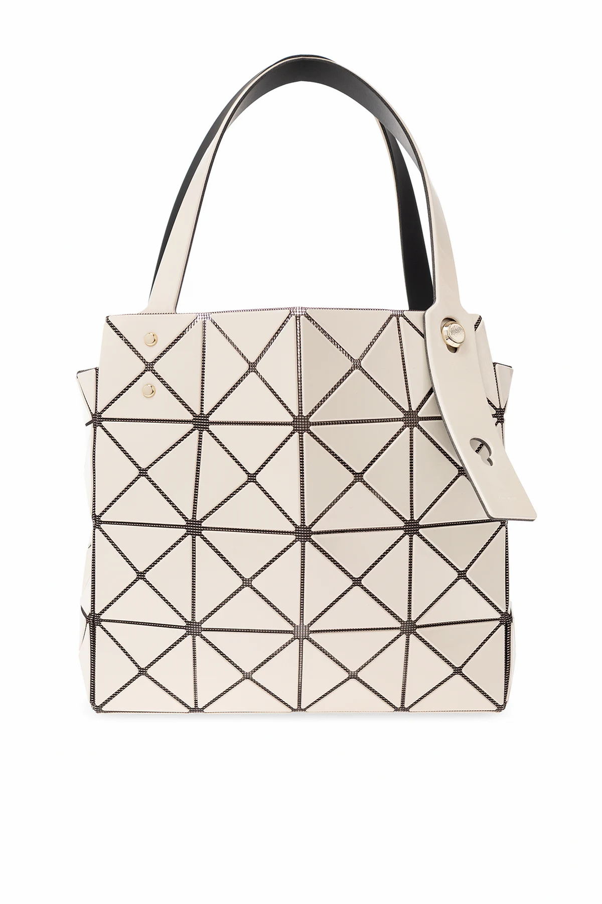 Cream and black ‘Carat’ handbag from Issey Miyake Bao Bao. Crafted from fabric embellished with geometric rubber details with a holographic effect, this model is complete with two adjustable half-round handles embossed with a logo, light gold-tone metal hardware and one internal compartment with one zip pocket.