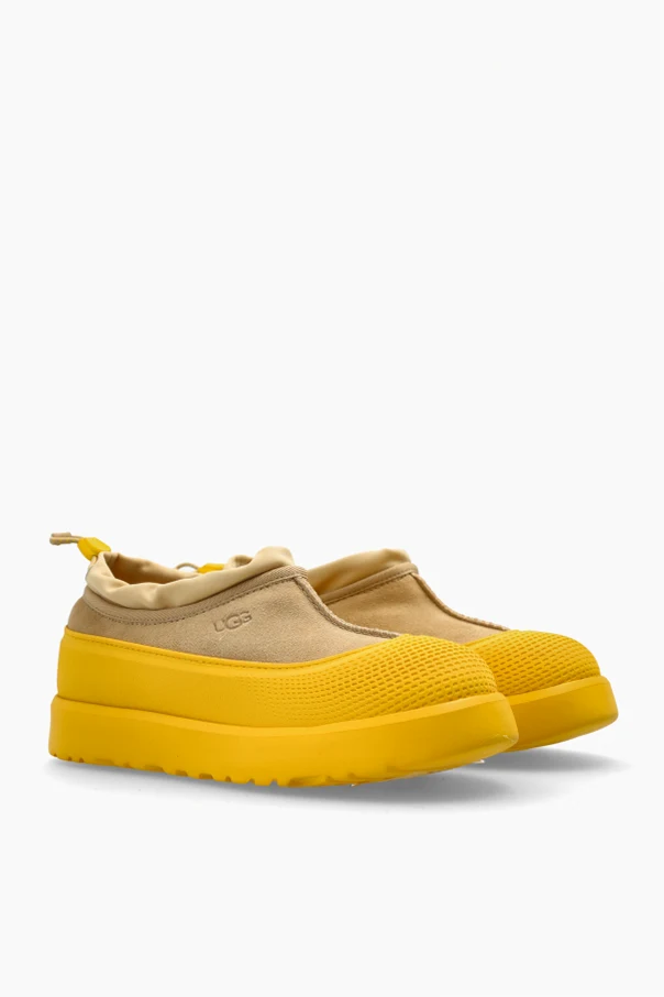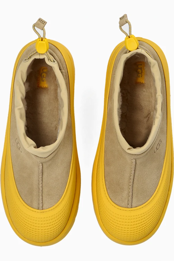 K TASMAN WEATHER HYBRID Schuhe von UGG Kids sind eine raffinierte Wahl, die Funktionalität mit modernem Design in Einklang bringt. Die intensiv gelbe Sohle und das dezente beige Obermaterial bilden eine einzigartige, kontrastreiche Komposition, die durch den sportlichen Schnitt und die abgerundete Form betont wird.
