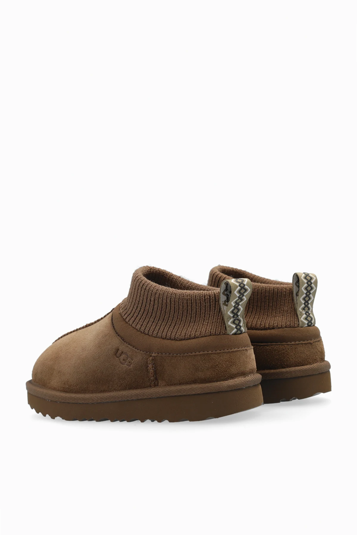 Der obere Rand des Schuhs ist mit einem elastischen, gerippten Bündchen versehen, das sich perfekt an das Bein anpasst und für eine bessere Isolierung vor Kälte sorgt. Das Markenlogo "UGG" ist in das Wildleder an der Seite des Schuhs eingeprägt und der Fersenriemen mit einem dekorativen, geometrischen Muster betont die Einzigartigkeit und Liebe zum Detail.
