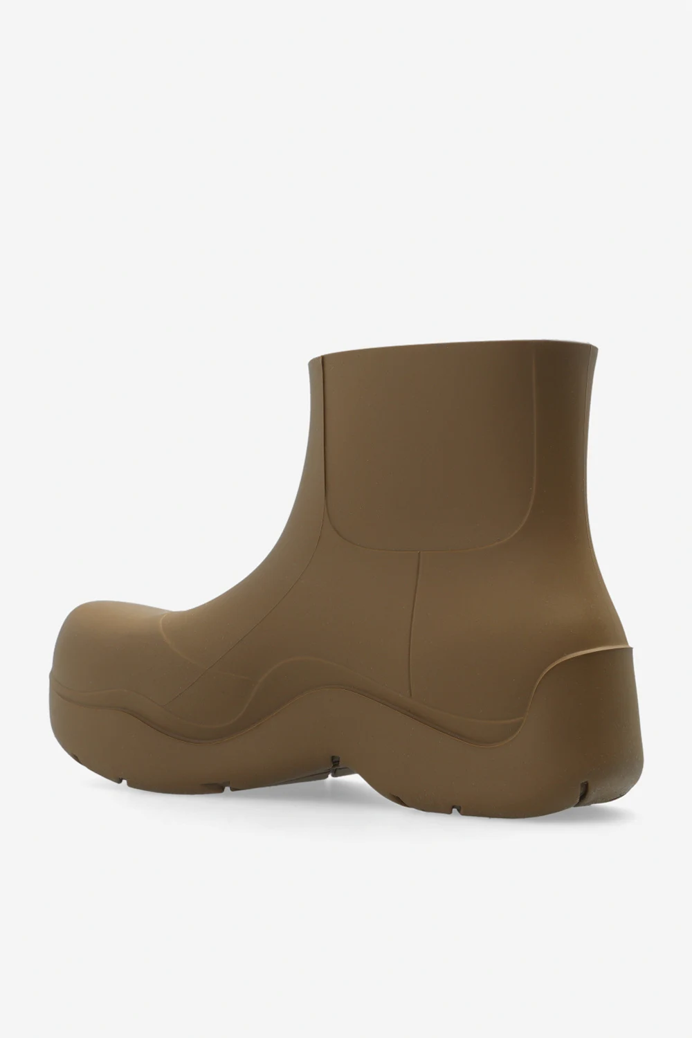 Brown ‘Puddle’ short rain boots from Bottega Veneta. Crafted from biodegradable material, this model features a seamless construction, cotton lining and a brown rubber sole.