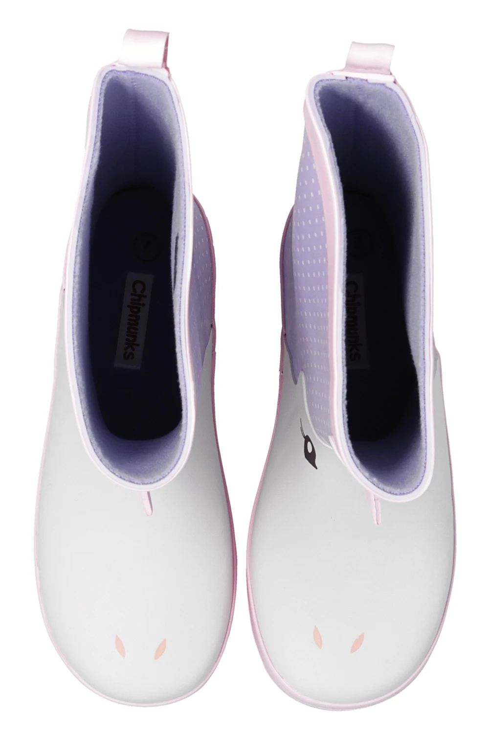 White, purple and pink, waterproof ‘Una Unicorn’ rain boots from Chipmunks. Decorated with a unicorn motif and raised logo, this pair features textile lining, purple rubber sole and two half-round straps for an easy on and off.