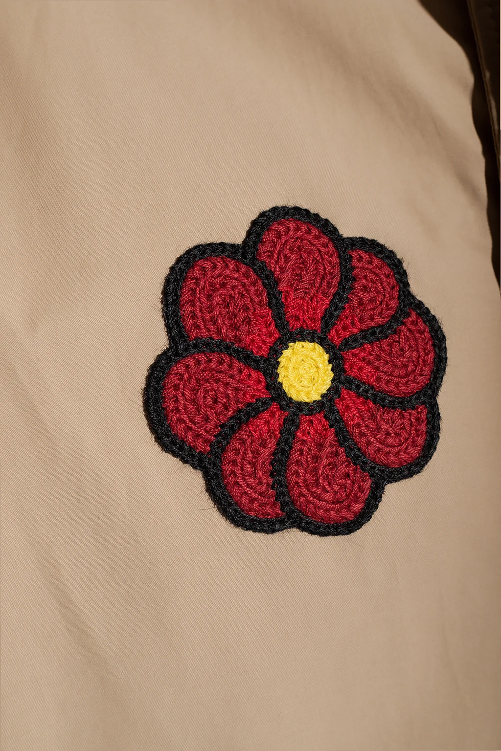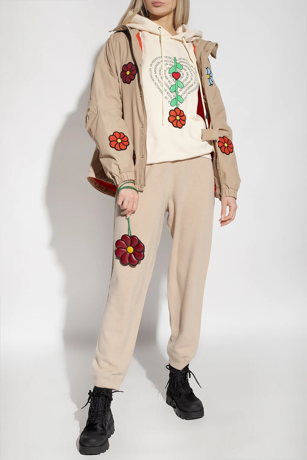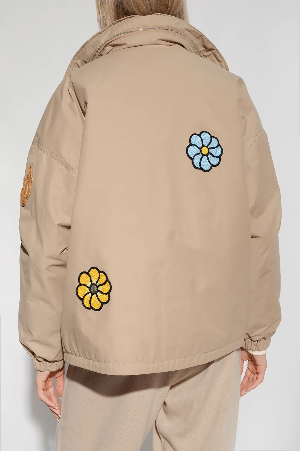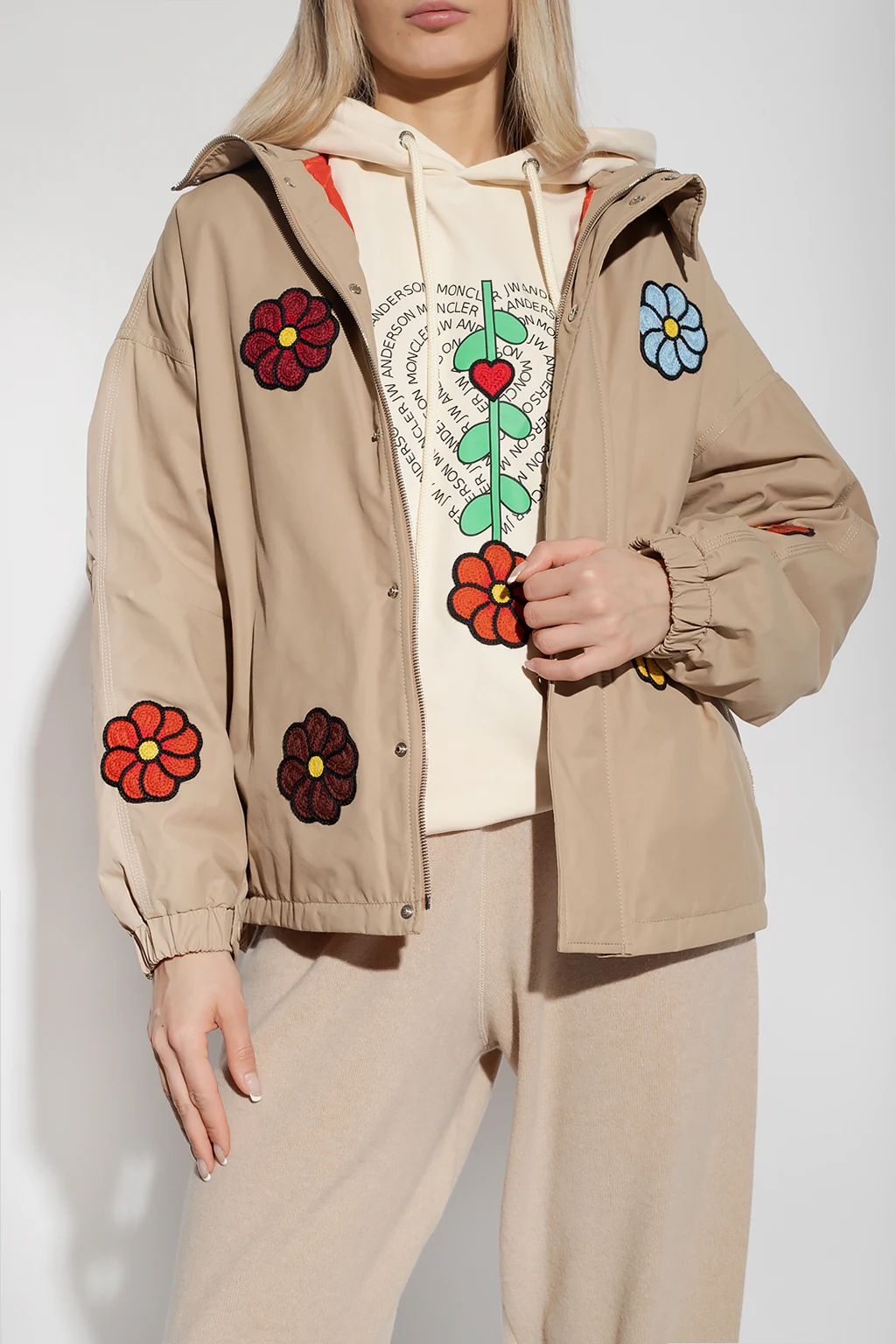 Beige ‘Delamont’ down jacket from Moncler Genius, the ‘1 Moncler JW Anderson’ collection. Crafted from a cotton blend, this style fastens with a zipper and snaps and showcases colourful flower patches, a tonal logo patch on the sleeve, a red drawstring hood which conceals in the standing collar, two zip pockets, a drawcord-adjustable hem and long sleeves with elasticated cuffs and snap closures.
