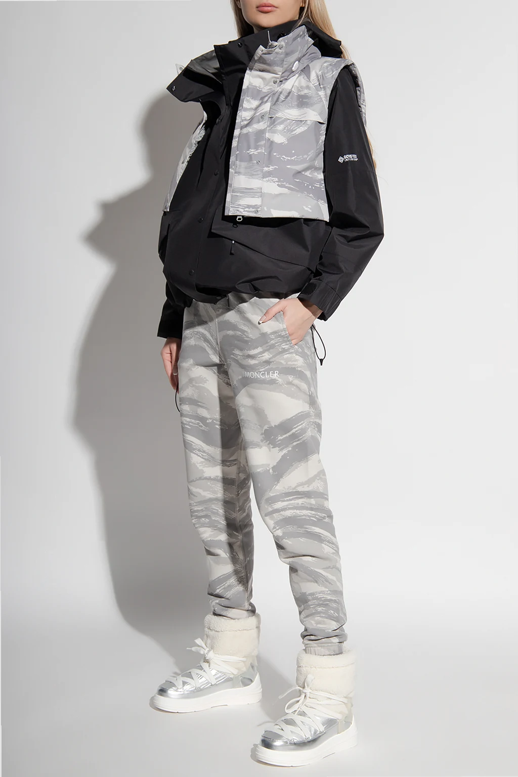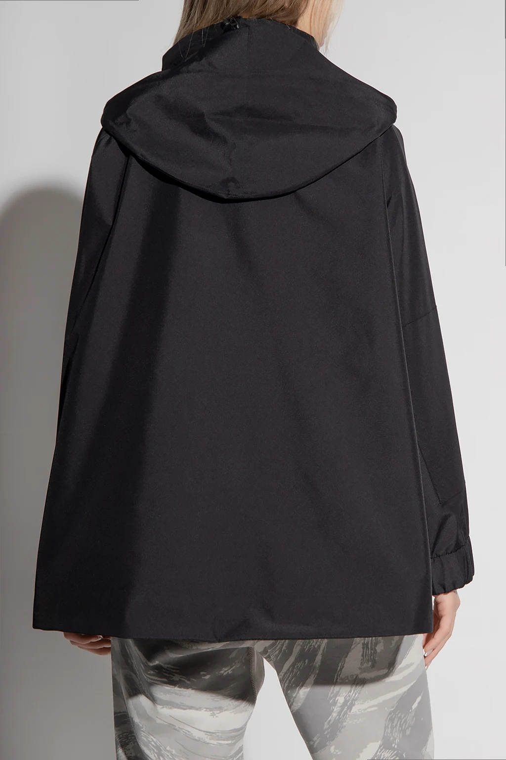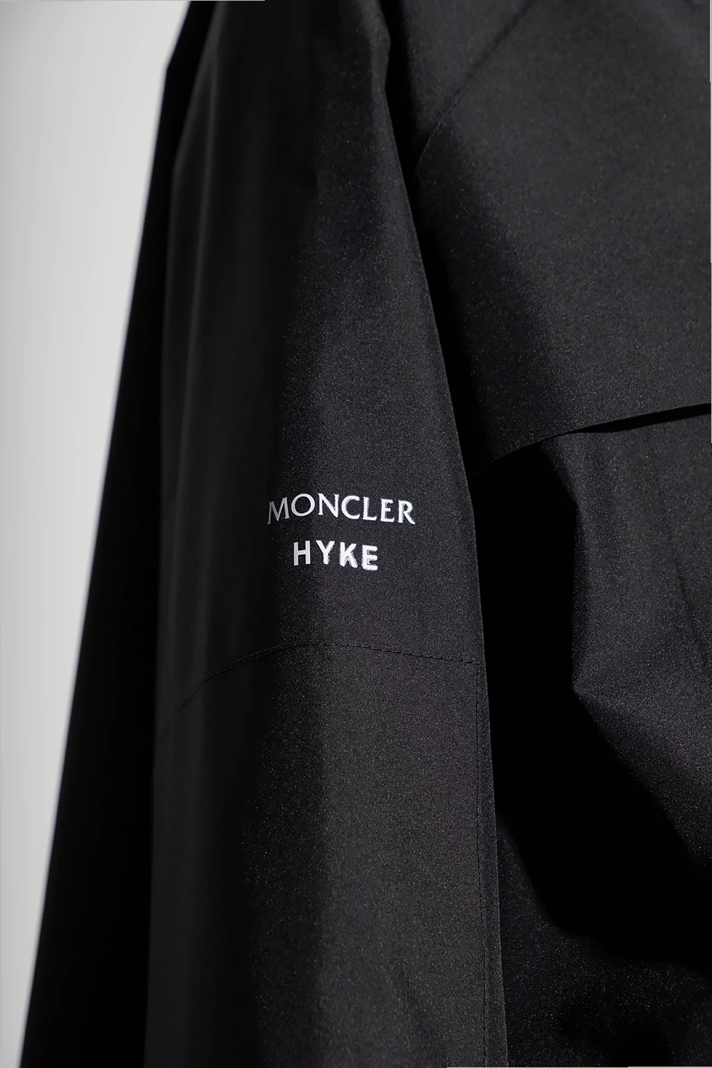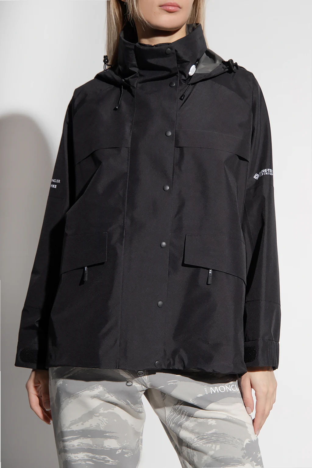Black water-repellent jacket from Moncler Genius, the ‘4 Moncler Hyke’ collection. Equipped with Gore-tex membrane, this style fastens with a zipper and snaps and showcases a printed logo, two zip pockets, long sleeves and drawcord-adjustable upper and bottom hems