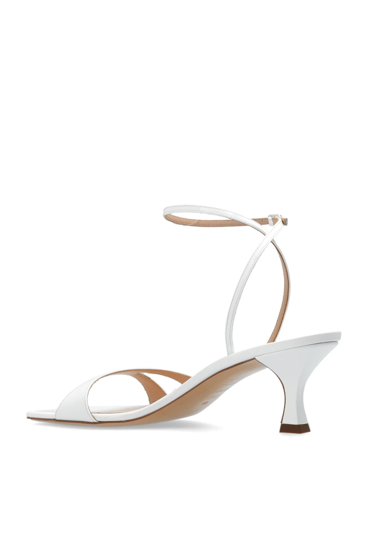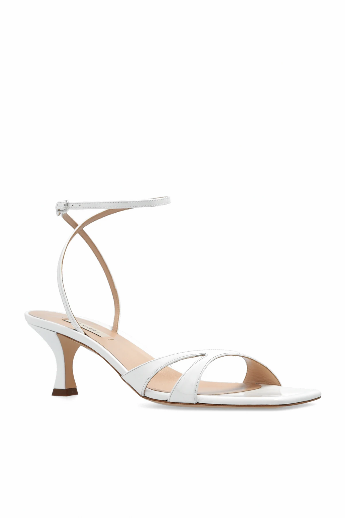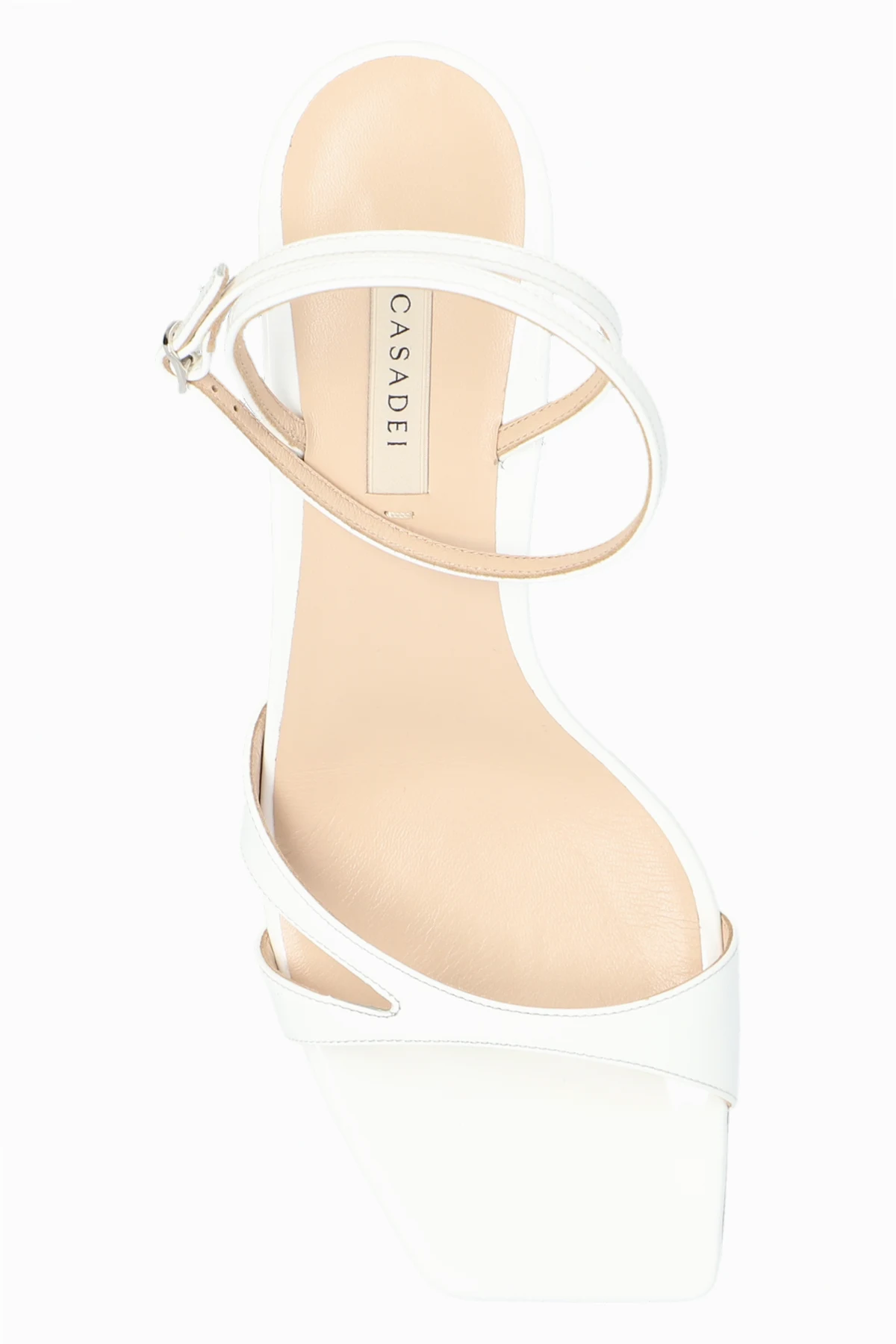 White ‘Geraldine’ heeled sandals from Casadei. Made from glossy leather with a square toe, this model sits on a beige leather sole and features an adjustable ankle strap with a buckle and a decorative opening on the side.