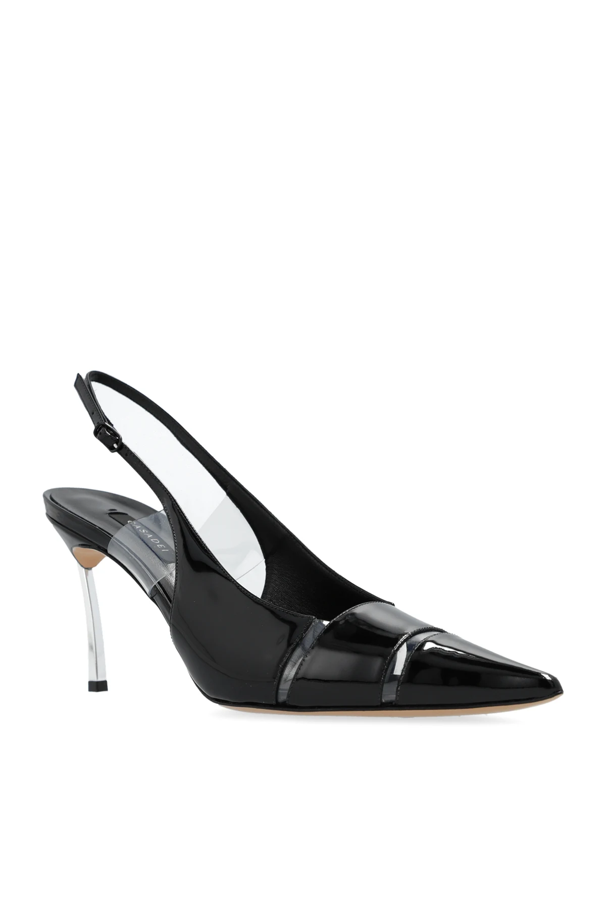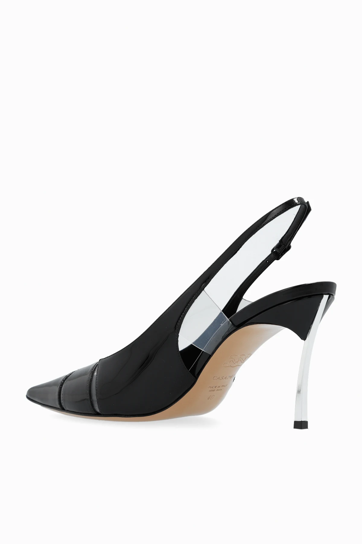 Black ‘Blade’ pumps from Casadei. Enriched by transparent inserts, this pointed toe pair is complete with an adjustable buckle strap, pointed toe, the brand’s signature stainless steel heel in silver-tone and a beige leather sole.