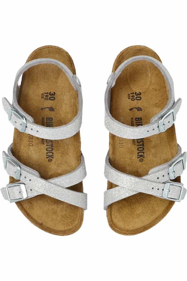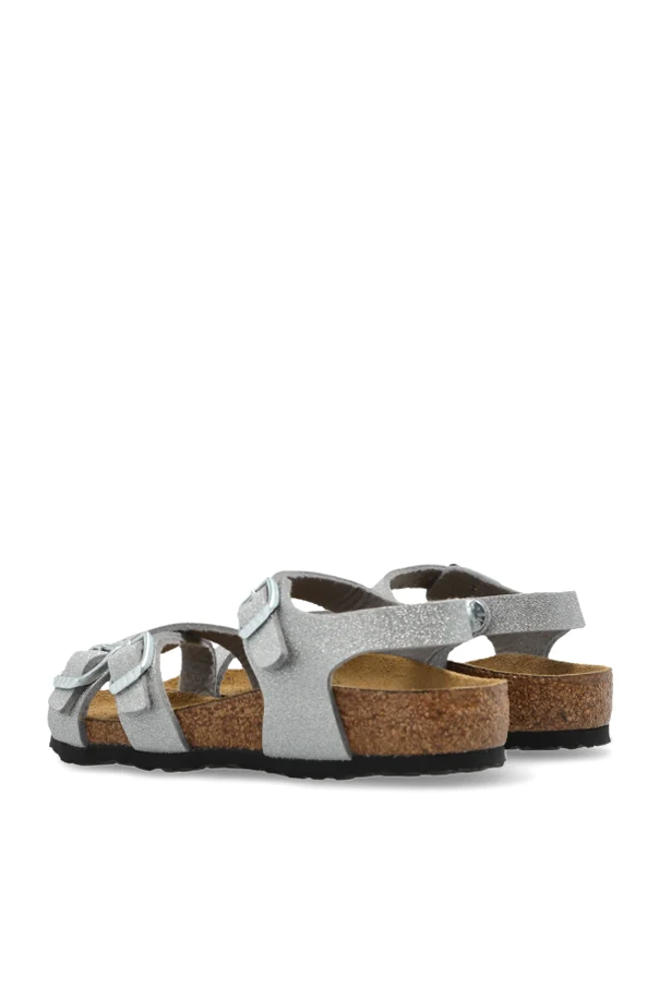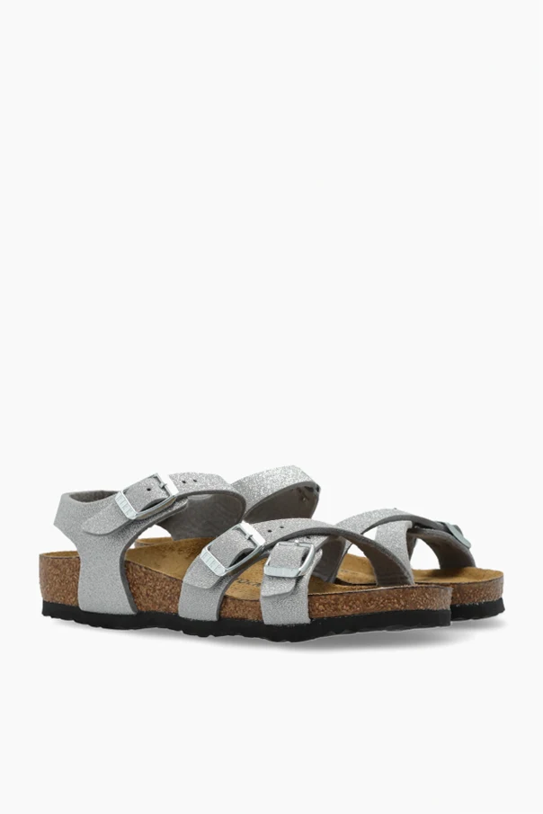 ‘Kumba’ Sandalen von Birkenstock Kids begeistern mit eleganter Ausstrahlung in einem silbernen Farbton und vereinen klassisches Design mit außergewöhnlicher Funktionalität. Die dezent schimmernden Riemen aus hochwertigem, lederähnlichem Synthetikmaterial bilden ein sinnliches Arrangement – zwei vordere Riemen sowie ein umlaufender Riemen am Knöchel –, die mit verstellbaren, silberfarbenen Schnallen geschlossen werden.
