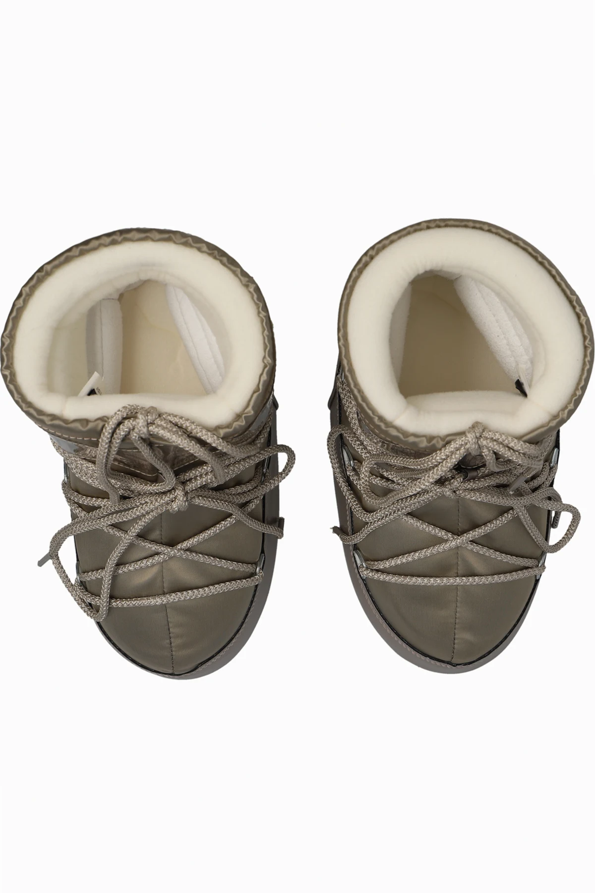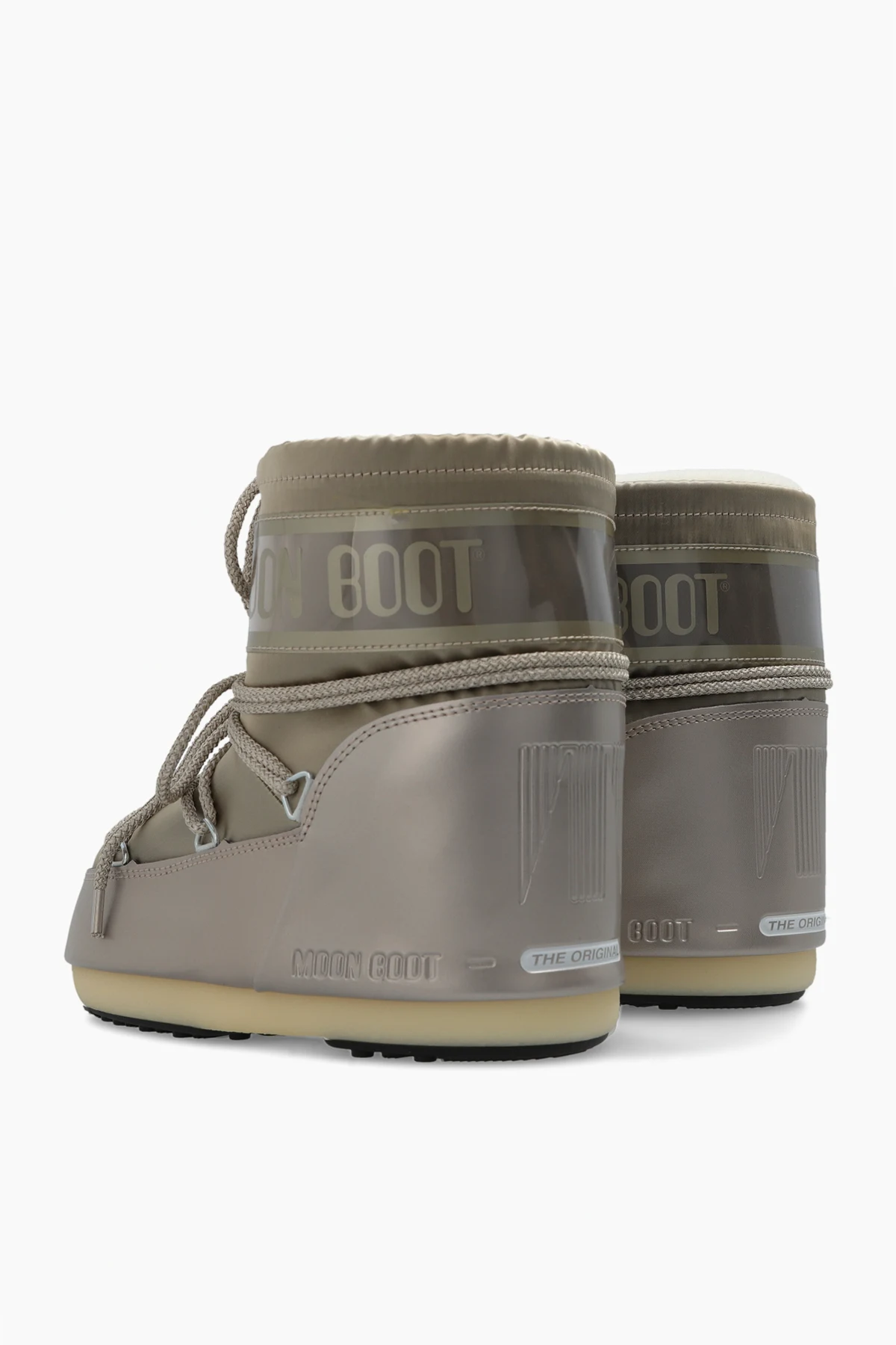 Gold-tone ‘Icon Low’ snow boots from Moon Boot Kids. Made of sparkling waterproof material and rubber, this model sits on a cream and black rubber sole and showcases the brand's logo and double lace-up detailing on the front.