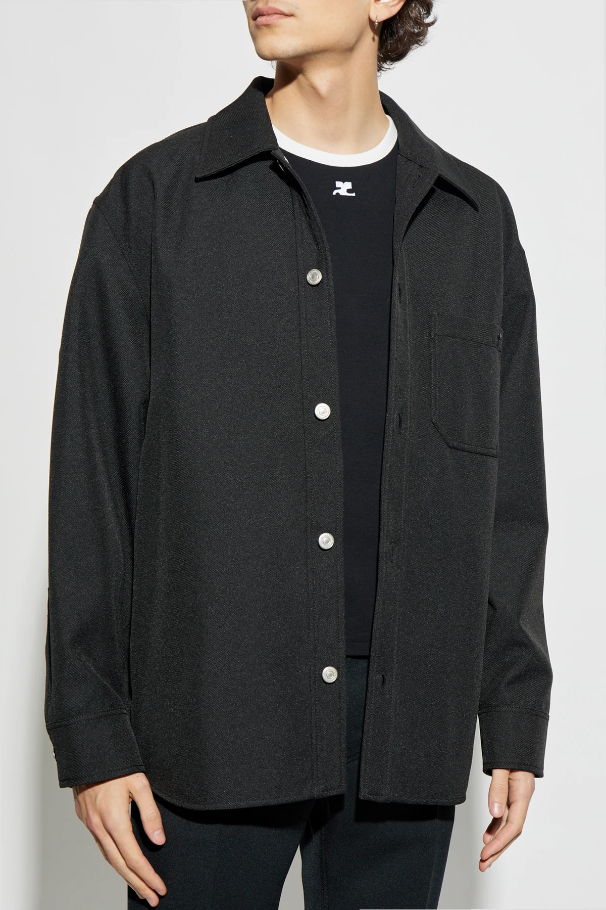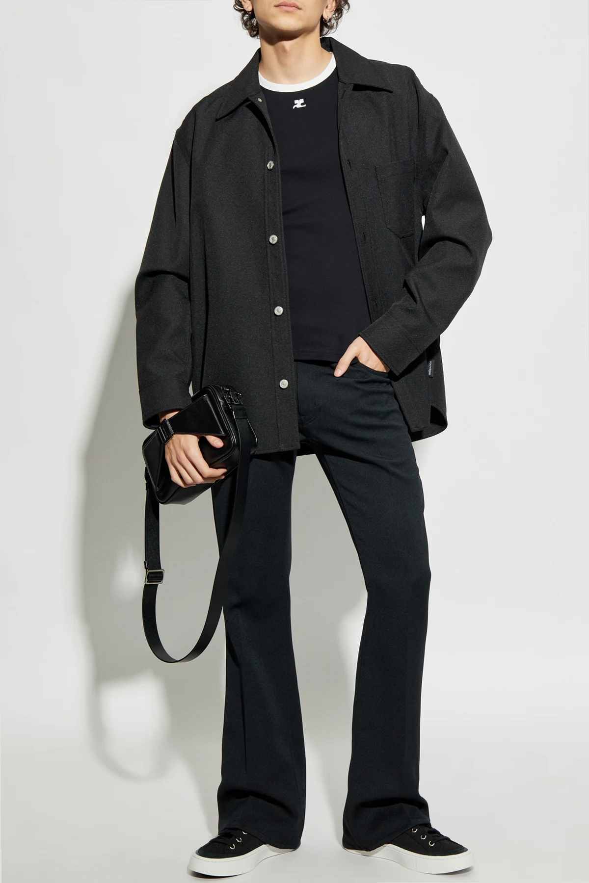 Wir präsentieren das außergewöhnliche Hemd Courreges X Vestiaire , das klassischen Stil mit modernen Akzenten verbindet. Seine schwarze Farbe und der schlichte Schnitt mit langen Ärmeln und Kragen machen es zu einer universellen Wahl für jede Gelegenheit. Das Hemd, das mit Knöpfen geschlossen wird, bietet Eleganz und Komfort in einem.