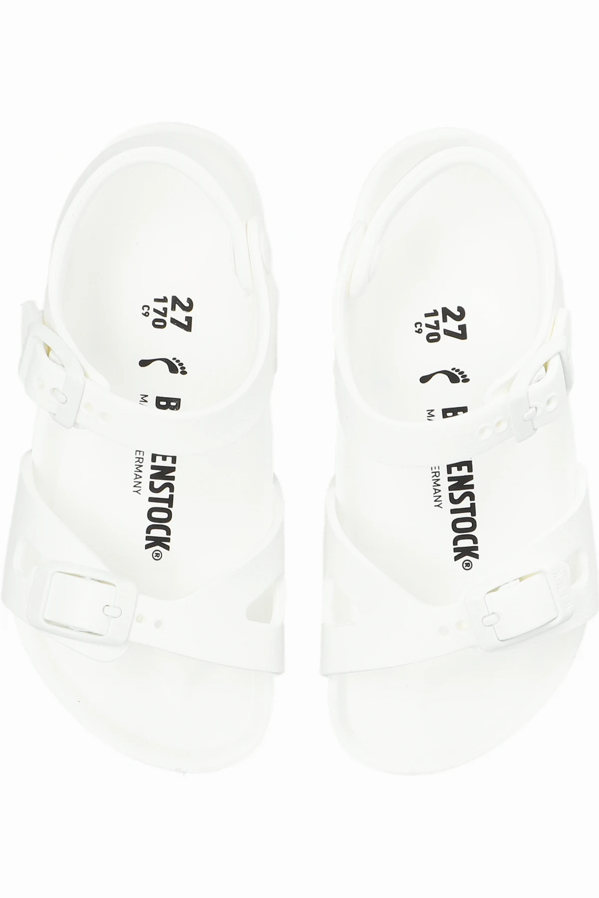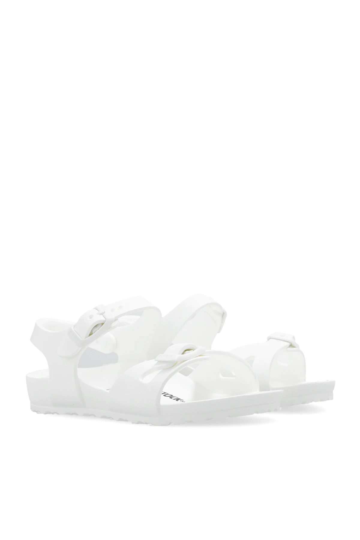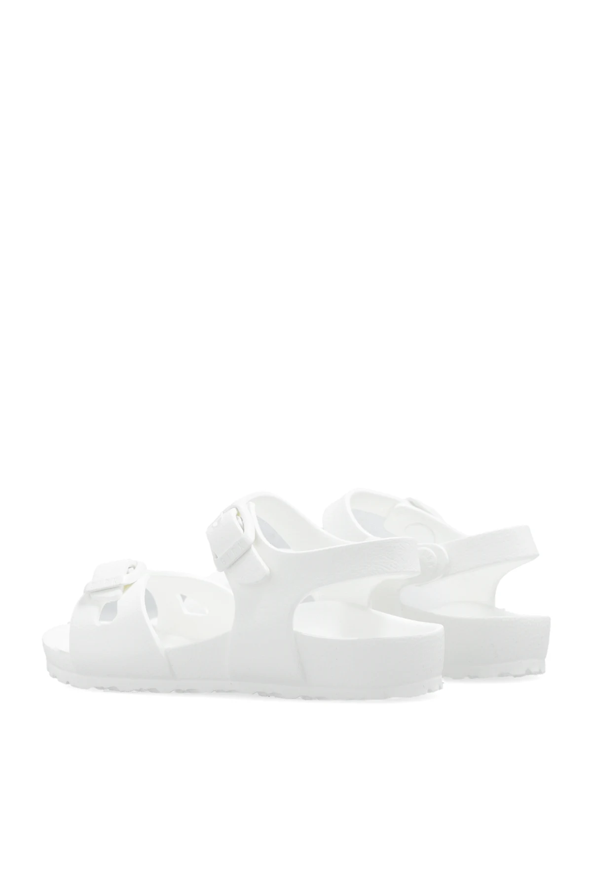 White ‘Rio EVA’ sandals from Birkenstock Kids. Made entirely from EVA foam, this model sits on a white sole and features a tapered, anatomically-shaped footbed and adjustable straps with logo-embossed buckles.