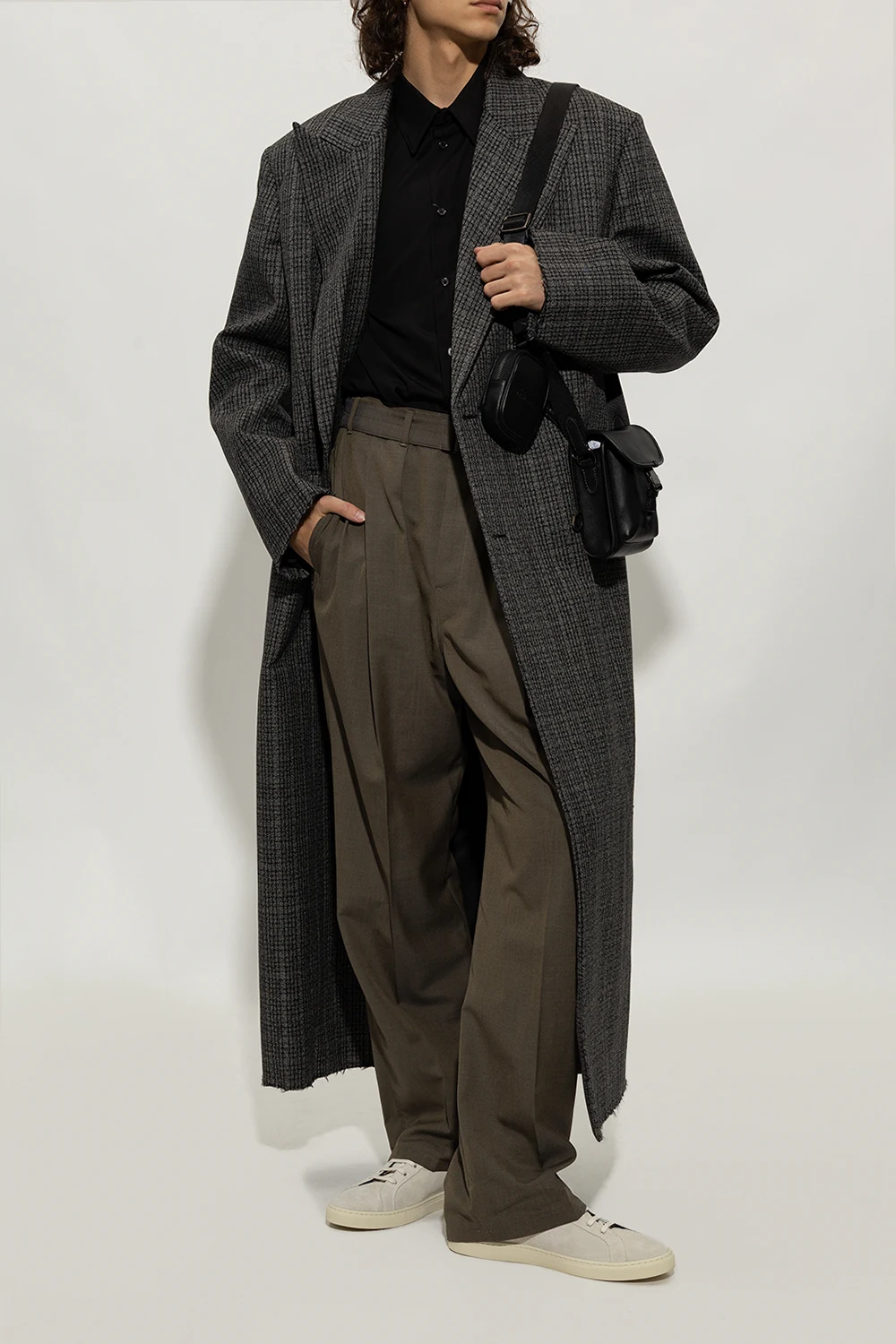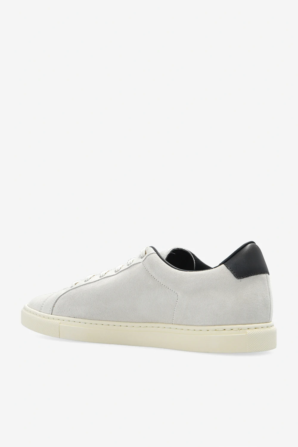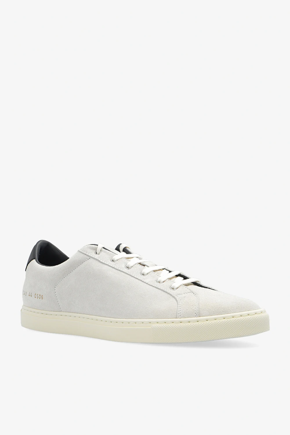 Light grey ‘Retro Low’ sneakers from Common Projects. Crafted from suede, this lace-up model sits on a cream rubber sole and features a gold-tone graphic print and a black heel counter and lining. Swappable shoelaces included.