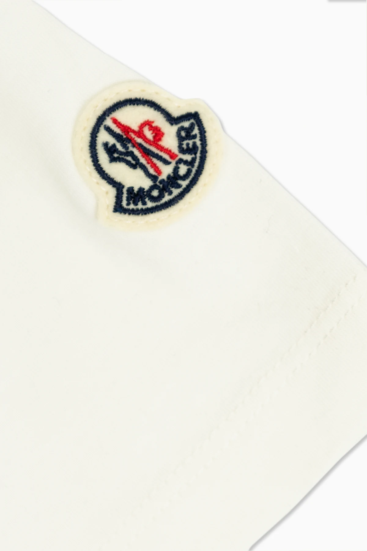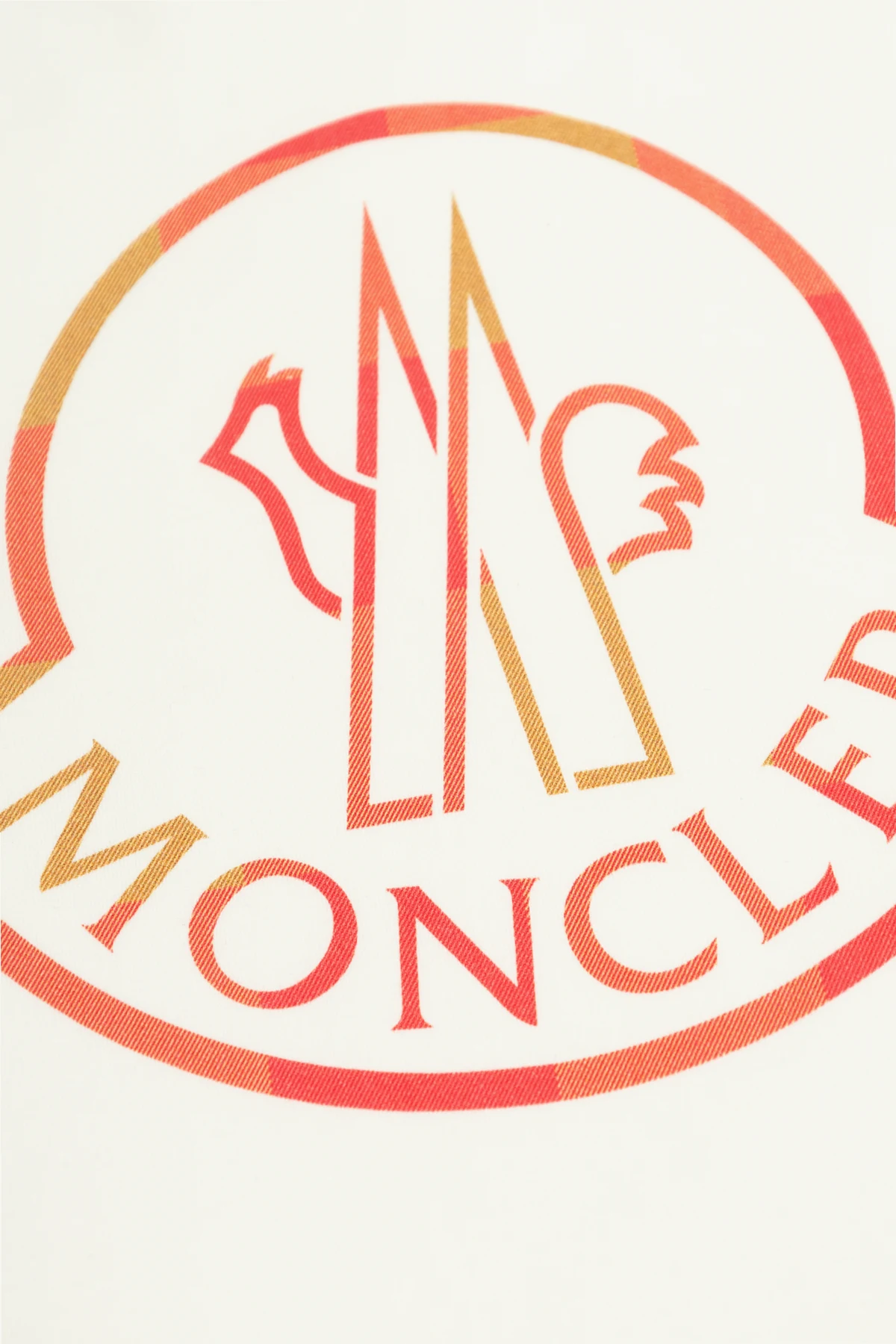Auf der Vorderseite des T-Shirts befindet sich ein großes, markantes Moncler-Logo in Rot- und Orangetönen, das stilisierte Buchstaben "M" und "C" sowie grafische Elemente, die an einen Vogel und Berge erinnern, darstellt. Darüber hinaus ist auf dem linken Ärmel ein Moncler-Logo-Patch in Weiß-Marineblau-Rot angebracht, der die Authentizität und den Prestigewert des Produkts zusätzlich hervorhebt.