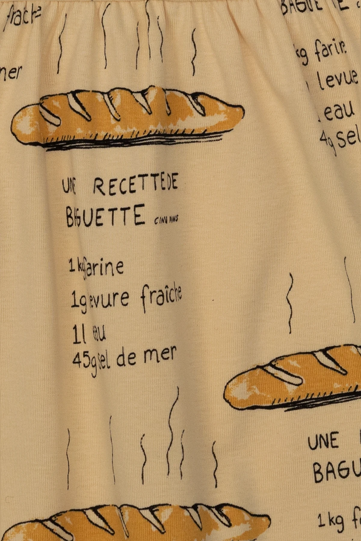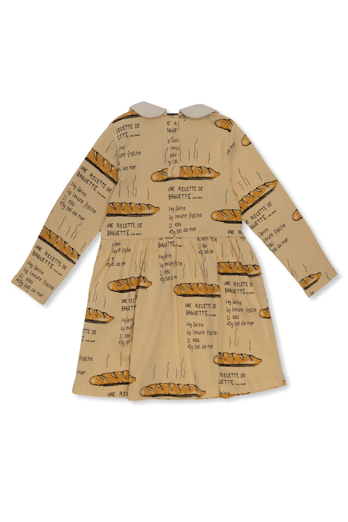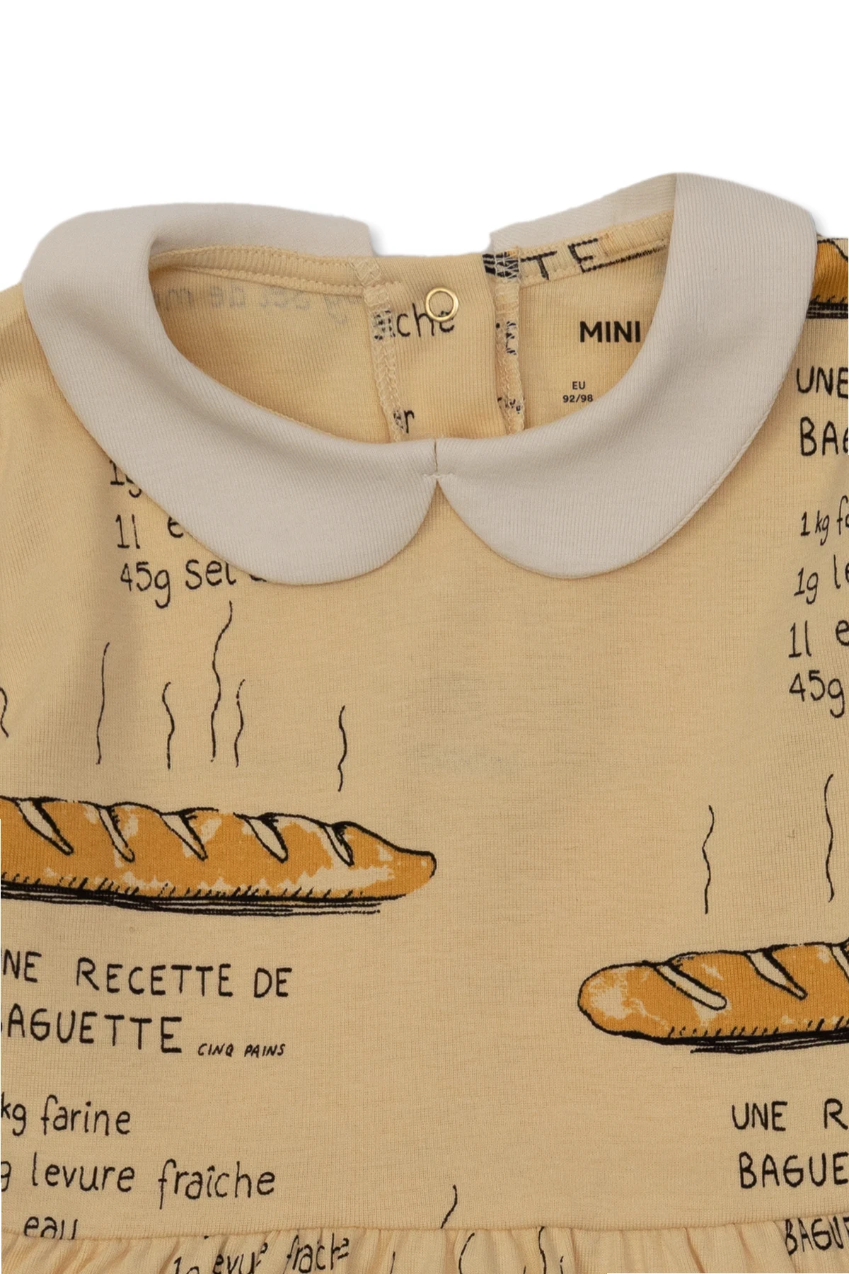 Light yellow from Mini Rodini. Crafted from organic cotton with the GOTS certificate, this style fastens with back snaps and showcases an all-over baguette & recipe print in black and beige. It is complete with a collared neckline and long sleeves.