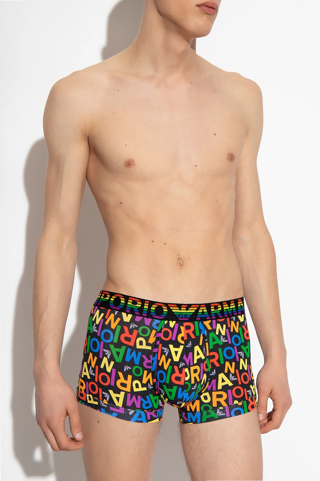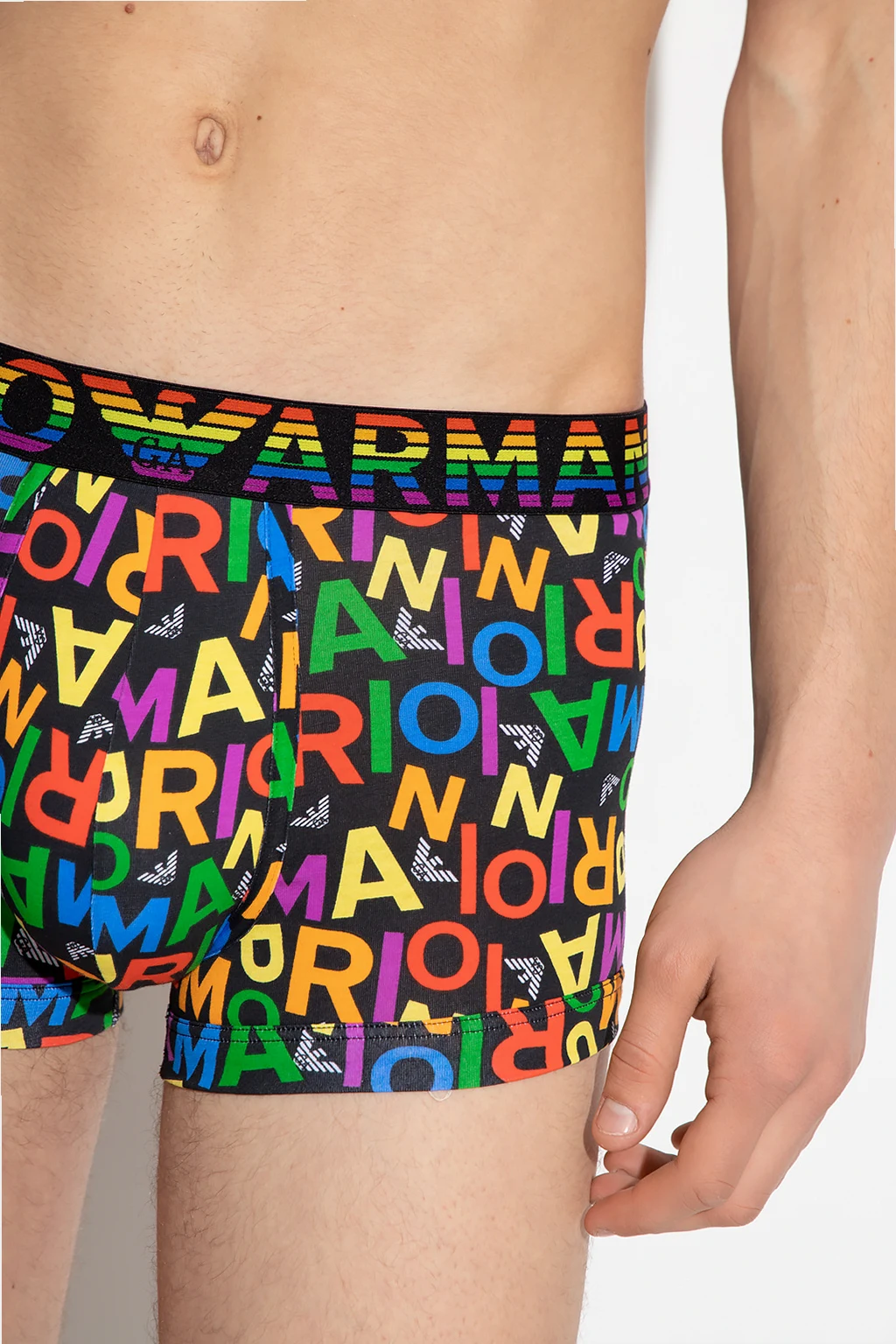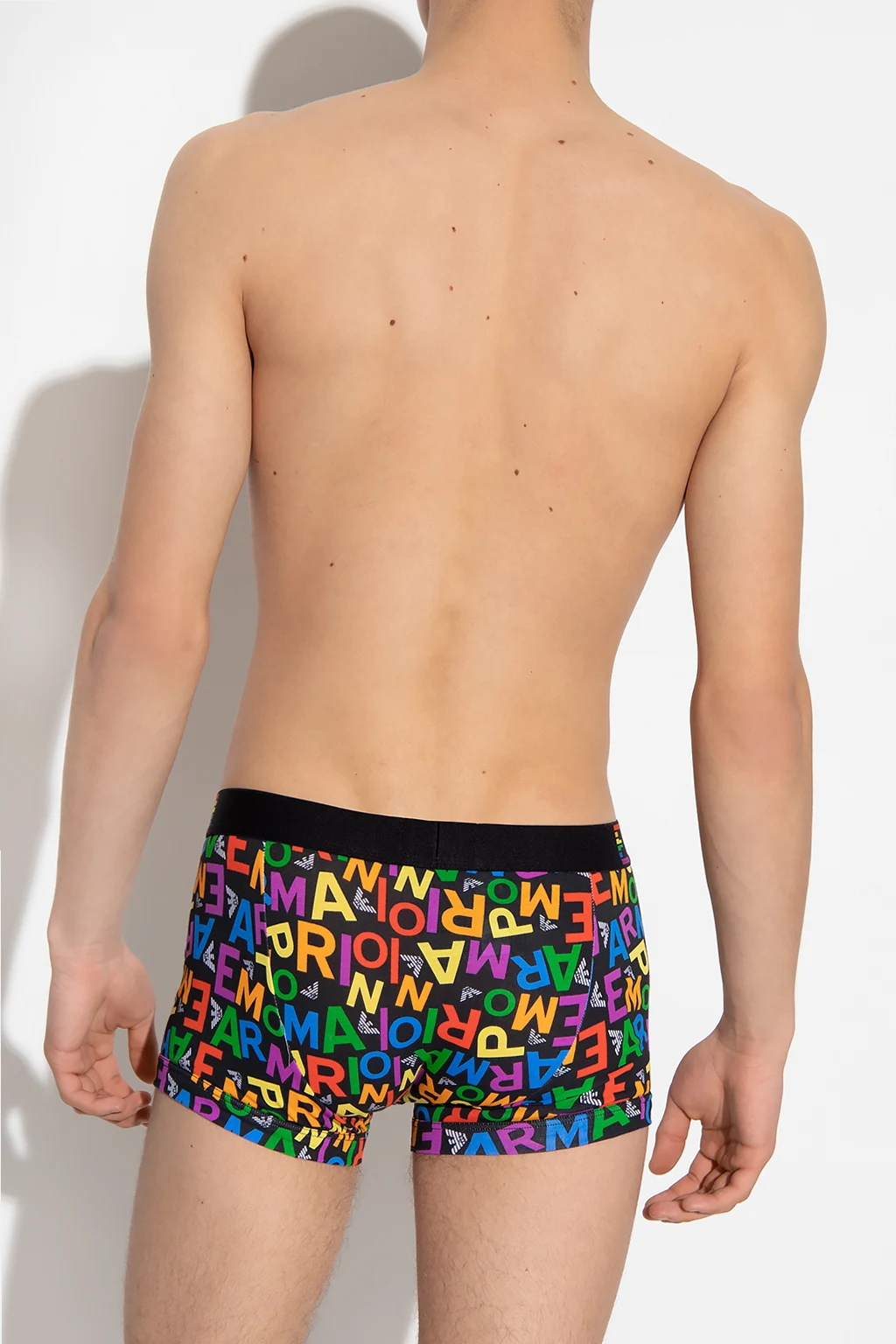 2-pack of black boxers from Emporio Armani. Made of cotton, each pair features an elastic waistband and multicolored logo pattern.