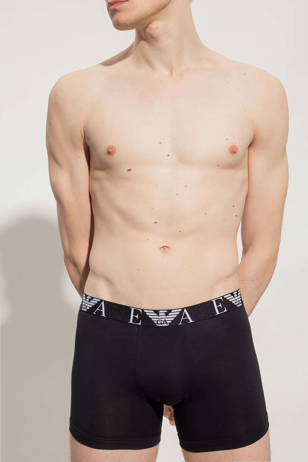 Black boxers three-pack from Emporio Armani. Made of cotton, they feature an elasticated waistband with an embroidered white logo.