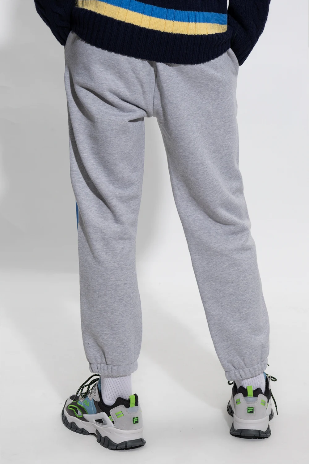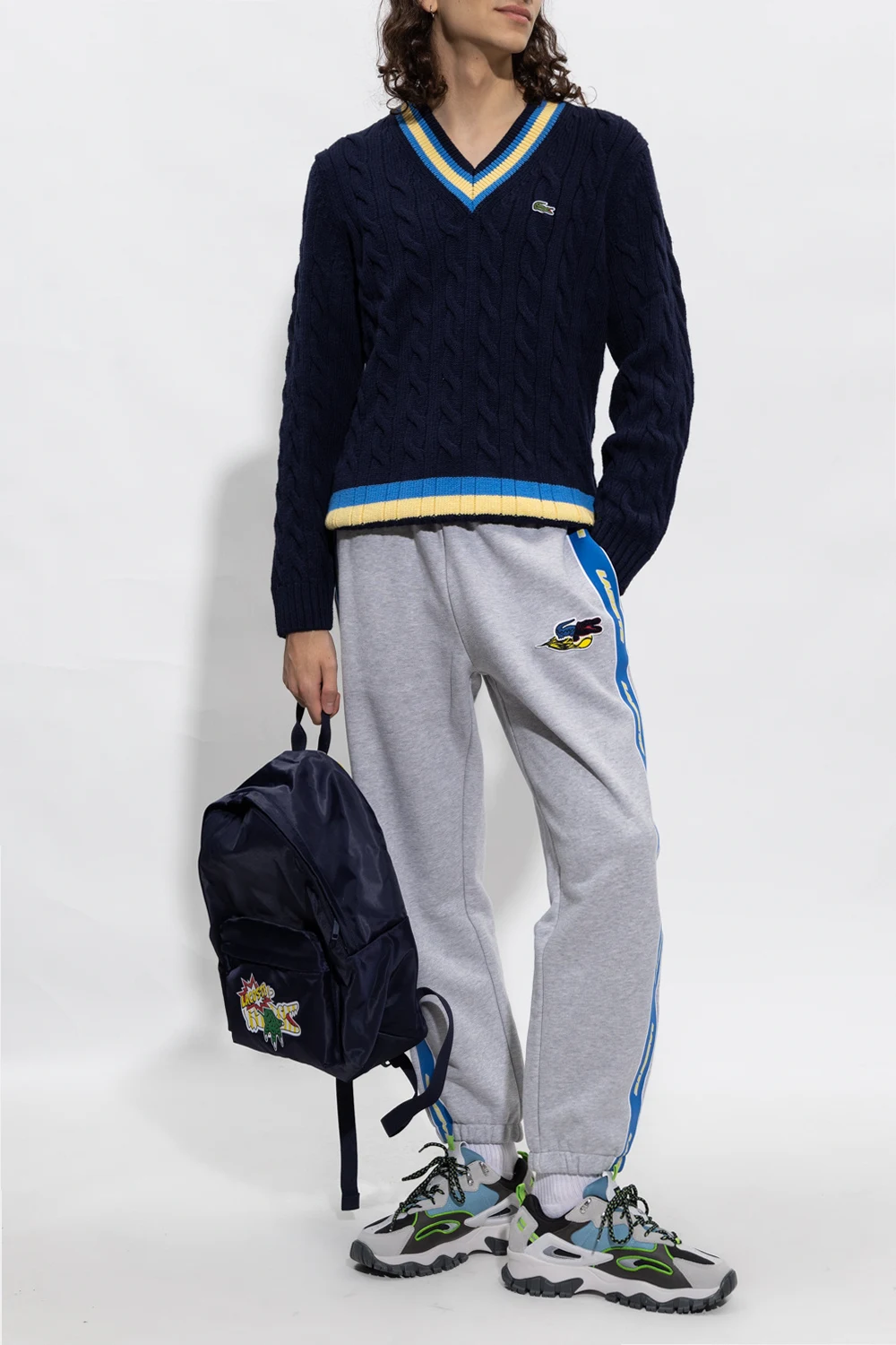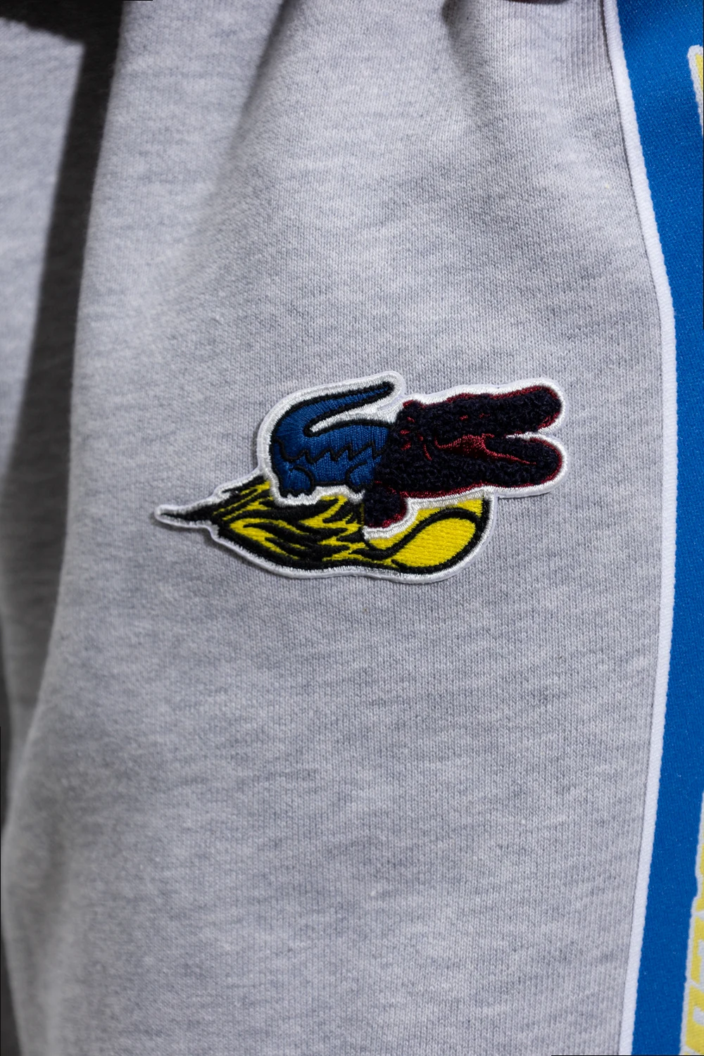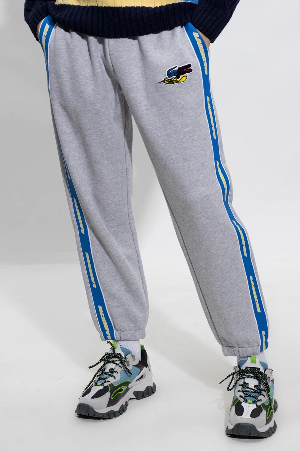 Grey loose-fitting sweatpants from Lacoste. Made of organic cotton, this pair features an elastic drawstring waistband, multicolored and grey patch with the brand’s signature crocodile skin effect, two slip pockets, blue and yellow logo-embroidered side stripes and elasticated cuffs.