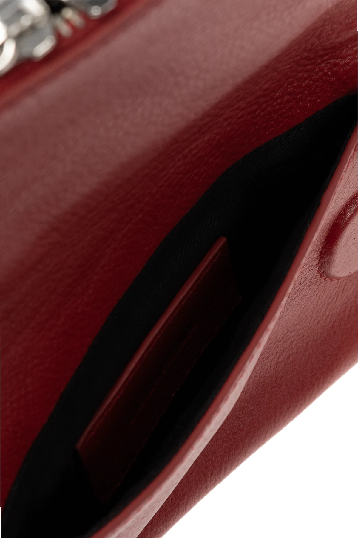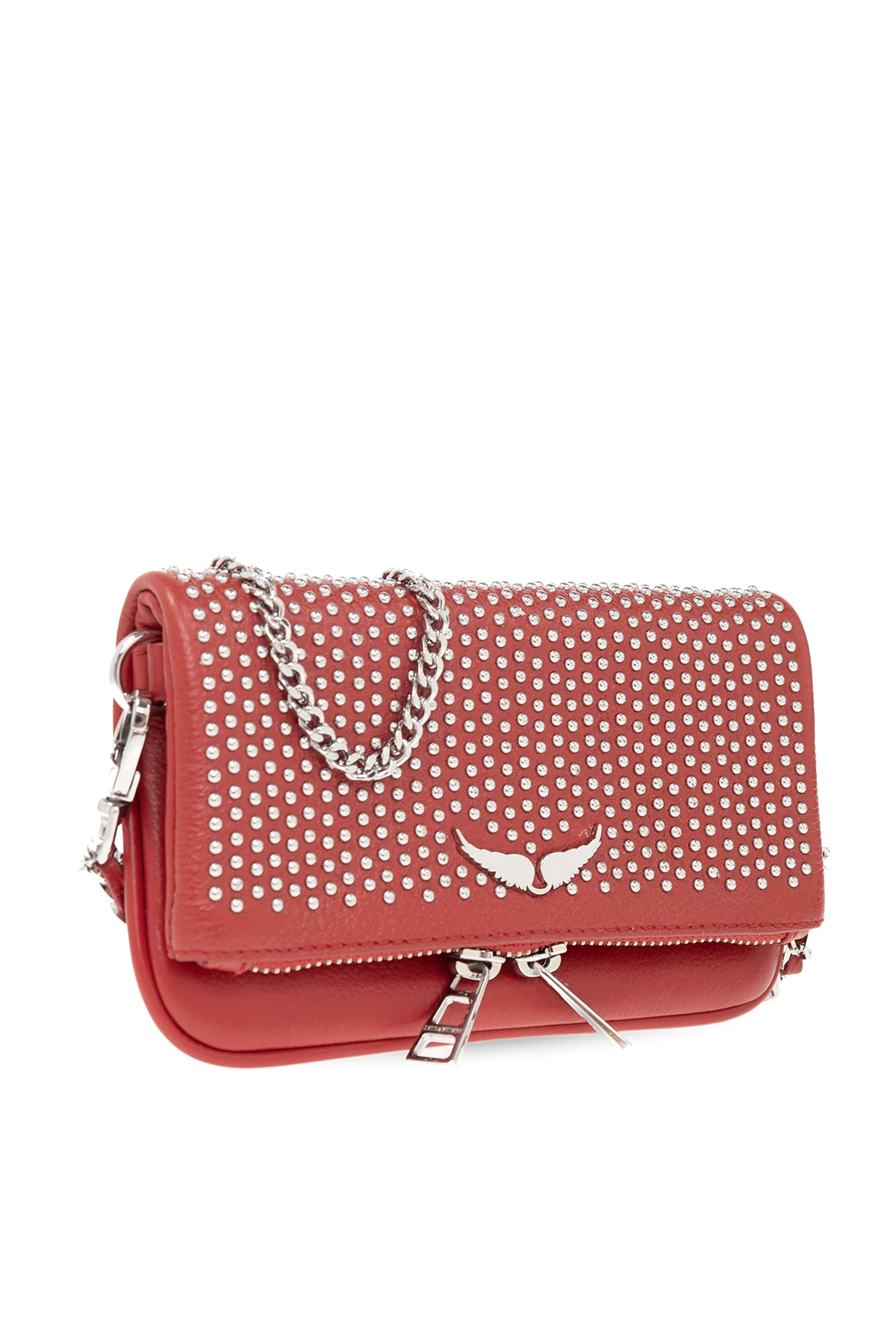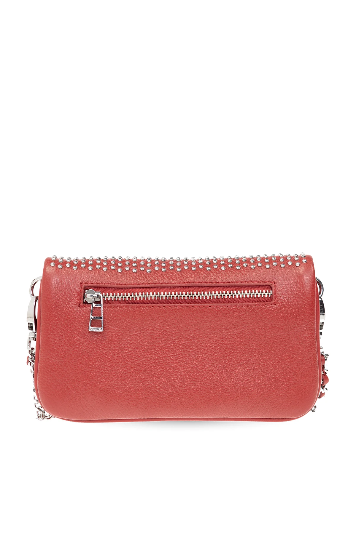 Red 'Rock Nano' shoulder bag from Zadig & Voltaire. Made from cow leather and enriched by metal studs, this design secures with a magnetic fastener and showcases the brand's logo. It is complete with a detachable double chain strap interwoven with leather, silver-tone metal hardware and two compartments inside: one is zipped.