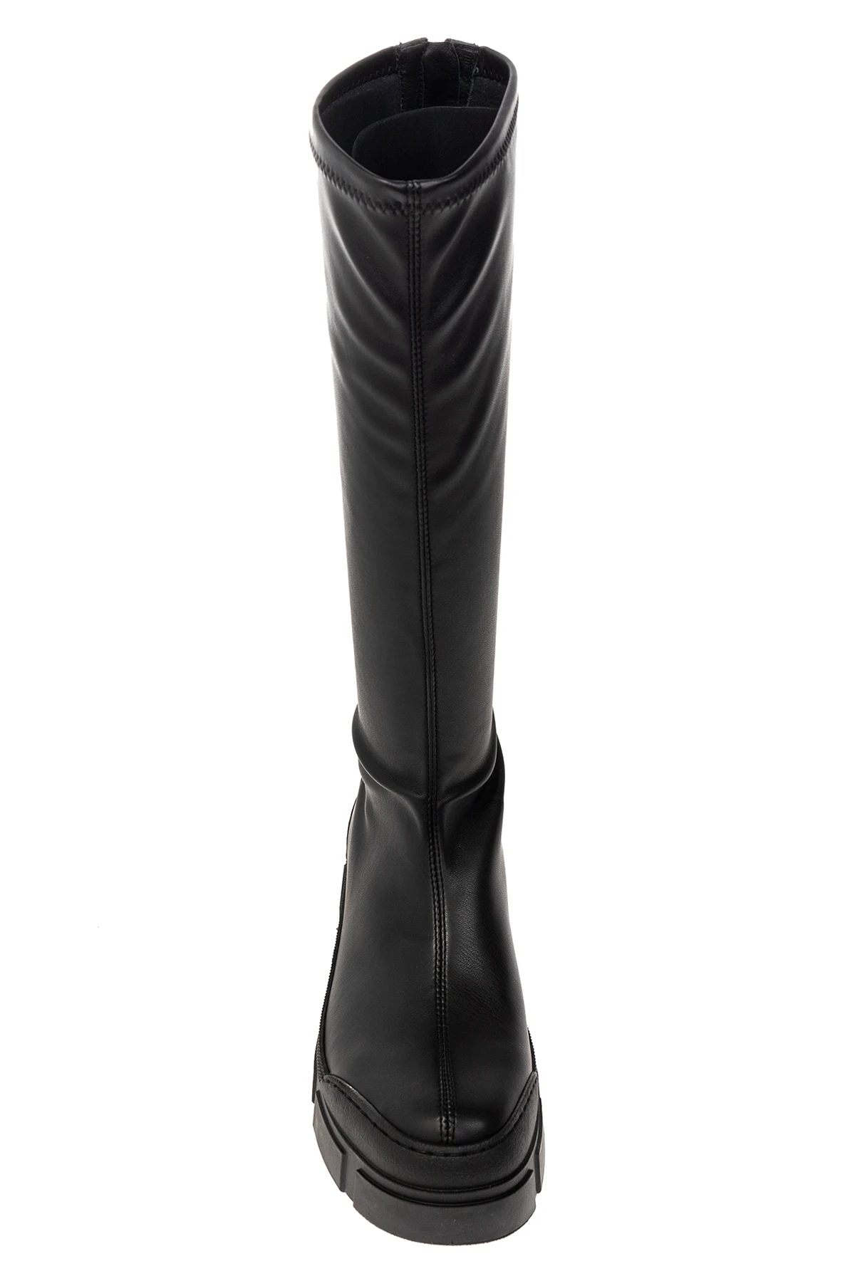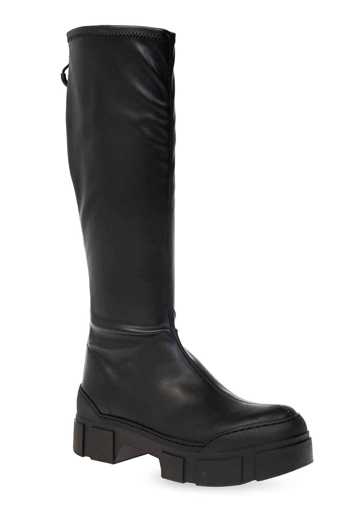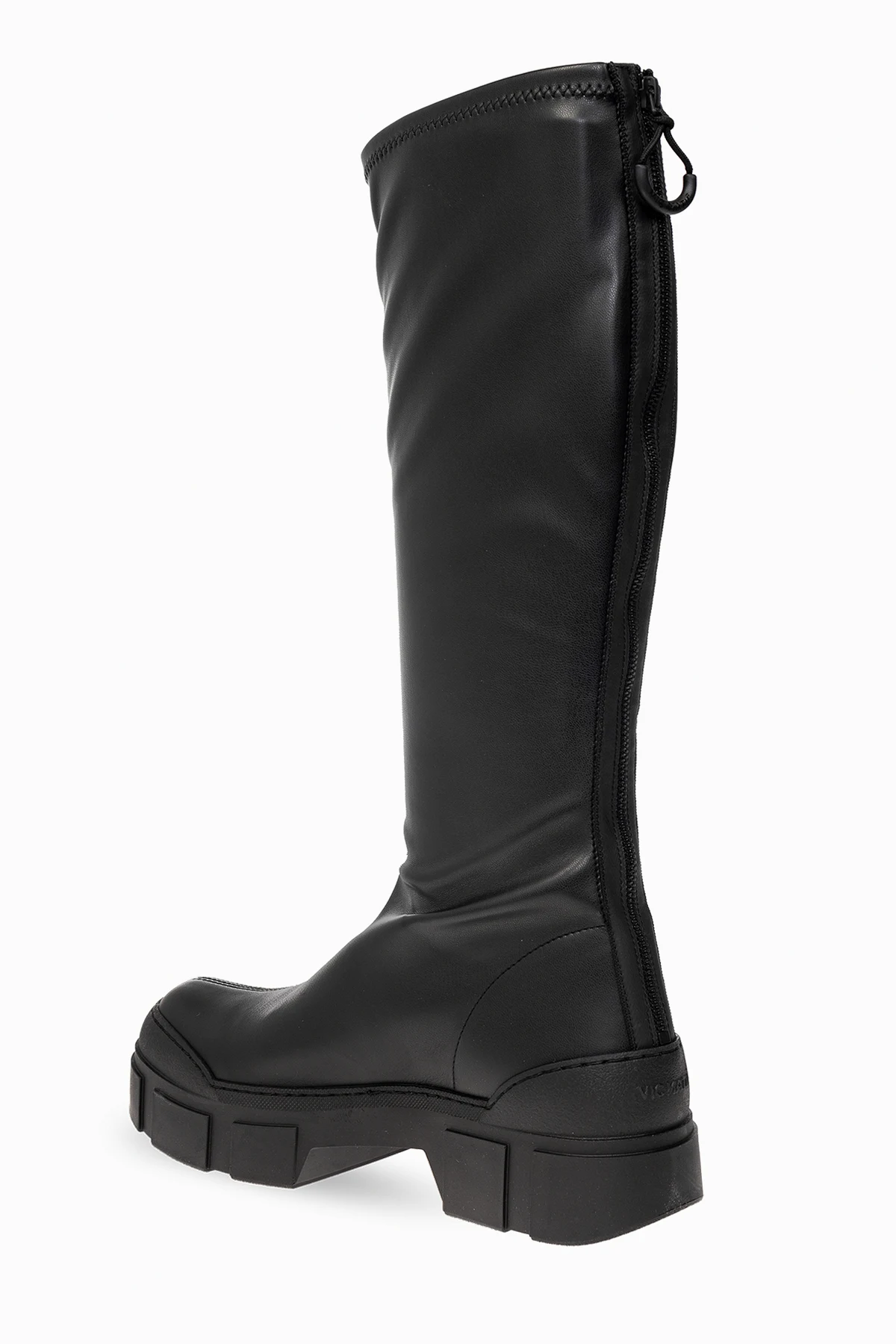 Black knee-high boots from Vic Matie. Made of faux leather, this pair is complete with a zip at the back, tactile logo and black rubber sole.
