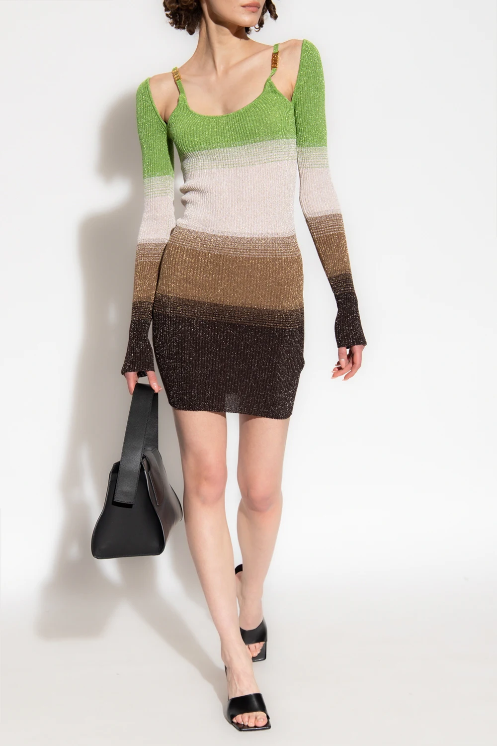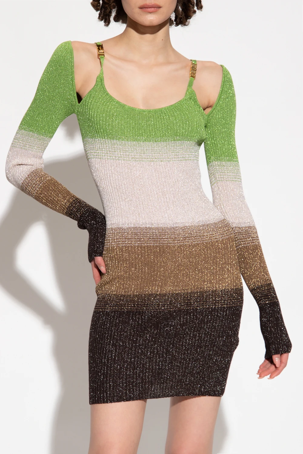 Green, beige and brown dress from GCDS. Crafted from ribbed knit inlaid with gold-tone lurex yarn, this style features a gradient effect, a cropped, form-fitting fit, spaghetti straps, a denuded back, long sleeves and logo-shaped snap closures.