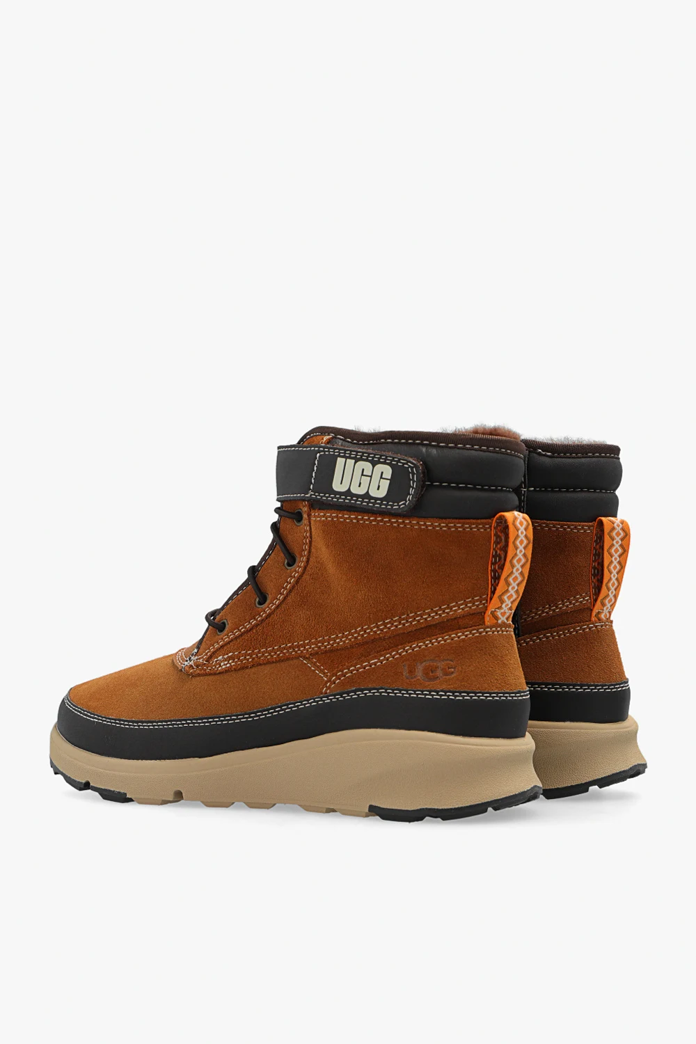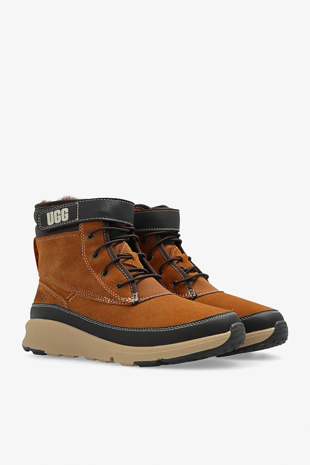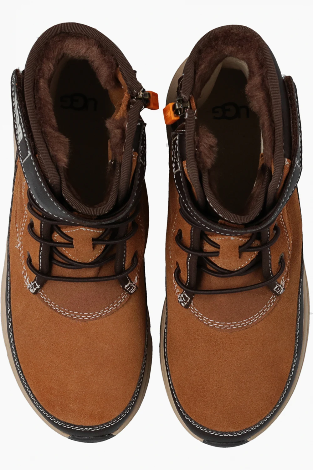 Brown ‘Arren Weather’ waterproof shoes from UGG Kids. Crafted from suede, this model features a side zipper, logo detailing, a faux fur insole and a dark brown and beige rubber sole.