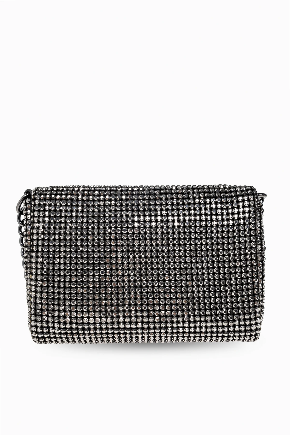 Ihre Einzigartigkeit wird ebenso durch den langen, kettenförmigen Riemen unterstrichen, der ein Tragen über der Schulter erlaubt und perfekt mit der metallischen Ästhetik harmoniert. An der Vorderseite der Tasche, als ihr zentraler Punkt, befindet sich eine dekorative Verschlussklappe mit Steinen, die an geschliffenes Glas erinnern, was ihren exklusiven Charakter noch mehr hervorhebt. Das Innere der Tasche, ausgekleidet mit einem kontrastierenden, dunklen Material, verbirgt ein praktisches Fach sowie eine Einschubtasche, die mit einem magnetischen Verschluss gesichert ist, was die Sicherheit der aufbewahrten Gegenstände gewährleistet.