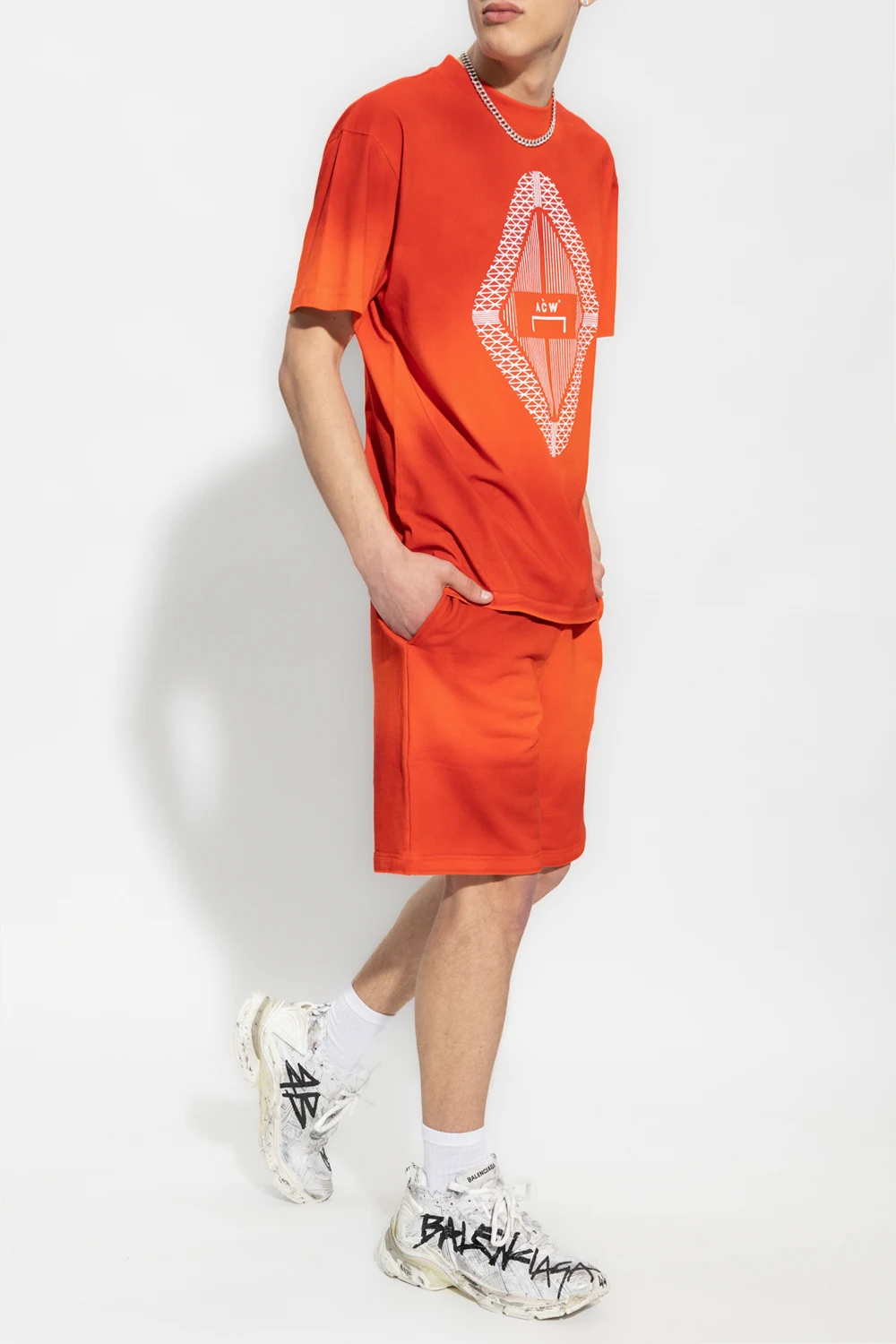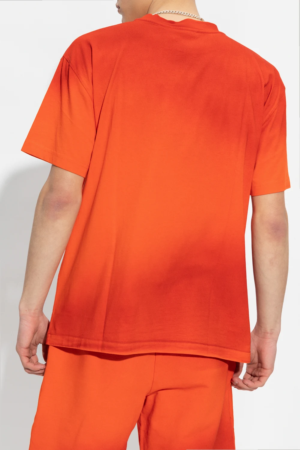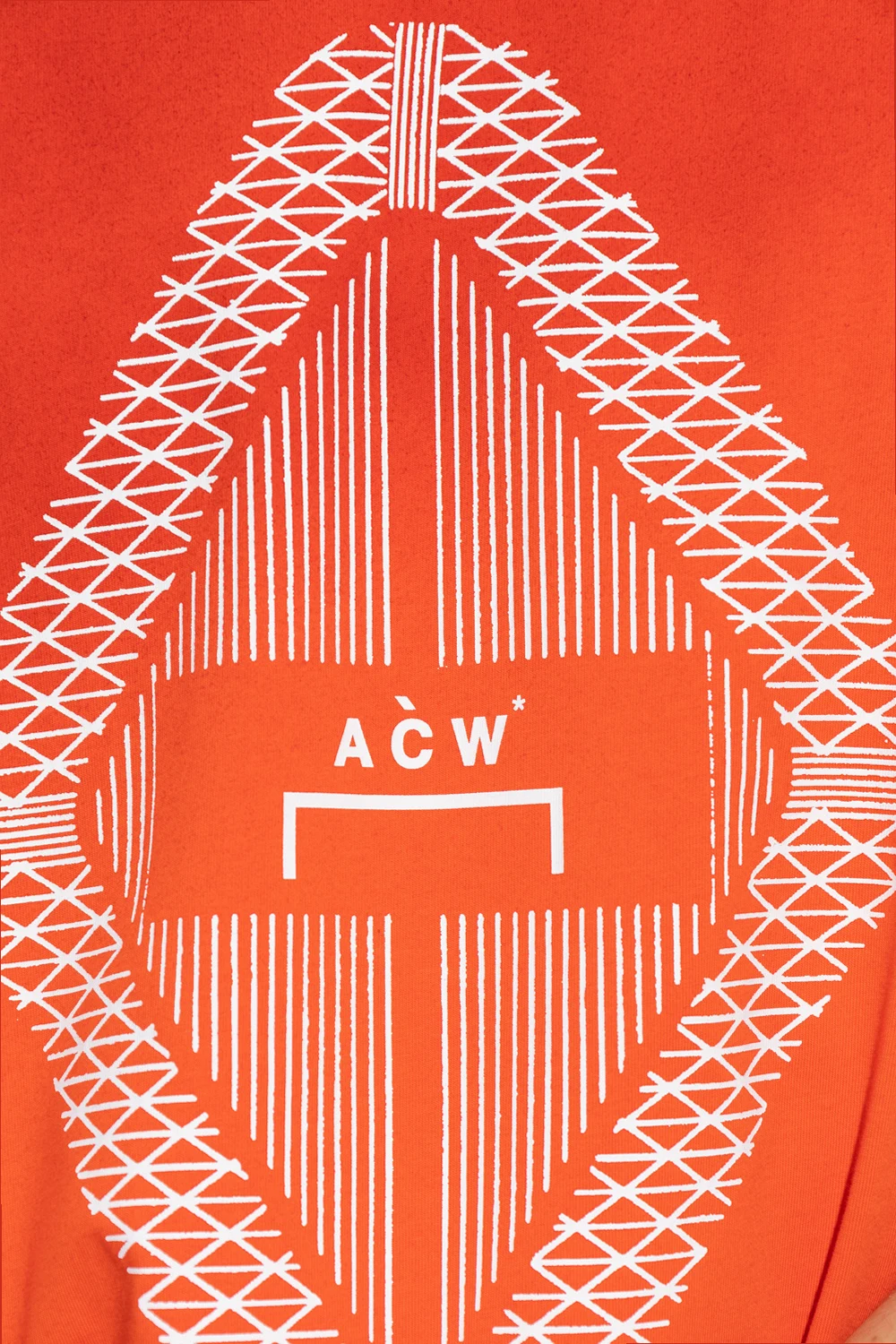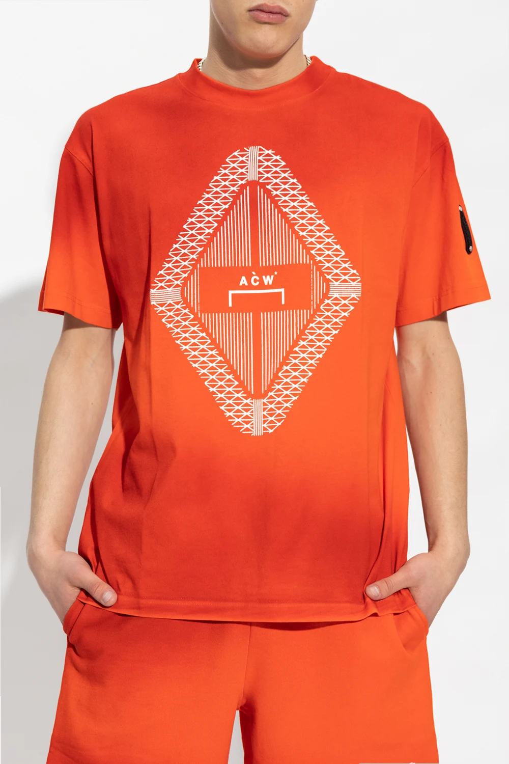 Reddish orange crewneck T-shirt from A-COLD-WALL*. Crafted from cotton, this style features a white logo print on the front and short sleeves – one has a logo patch.