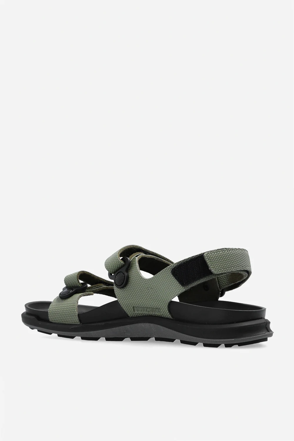 Green ‘Kalahari’ sandals from Birkenstock. Made of nubuck, this standard width pair is crafted from textured Birko-Flor and complete with adjustable velcro straps and black rubber sole.