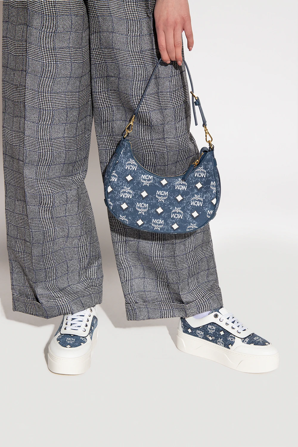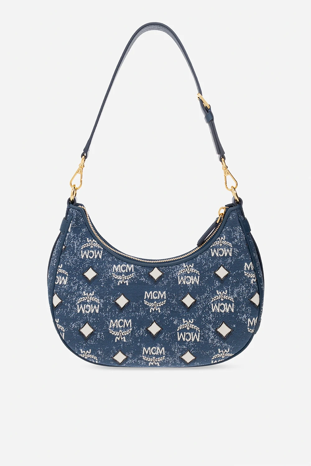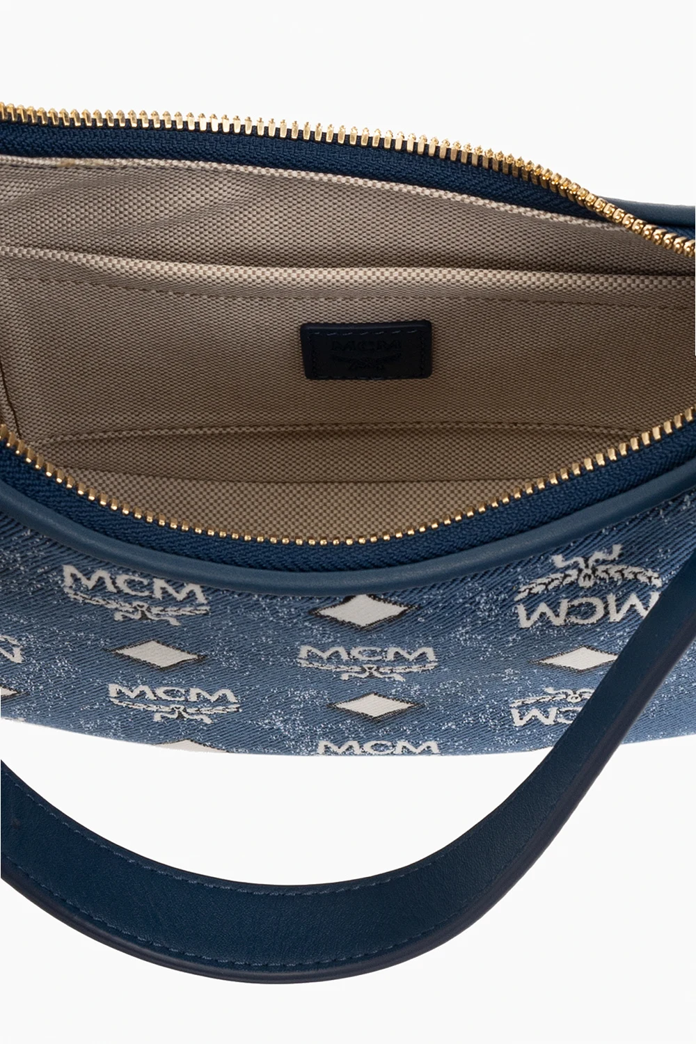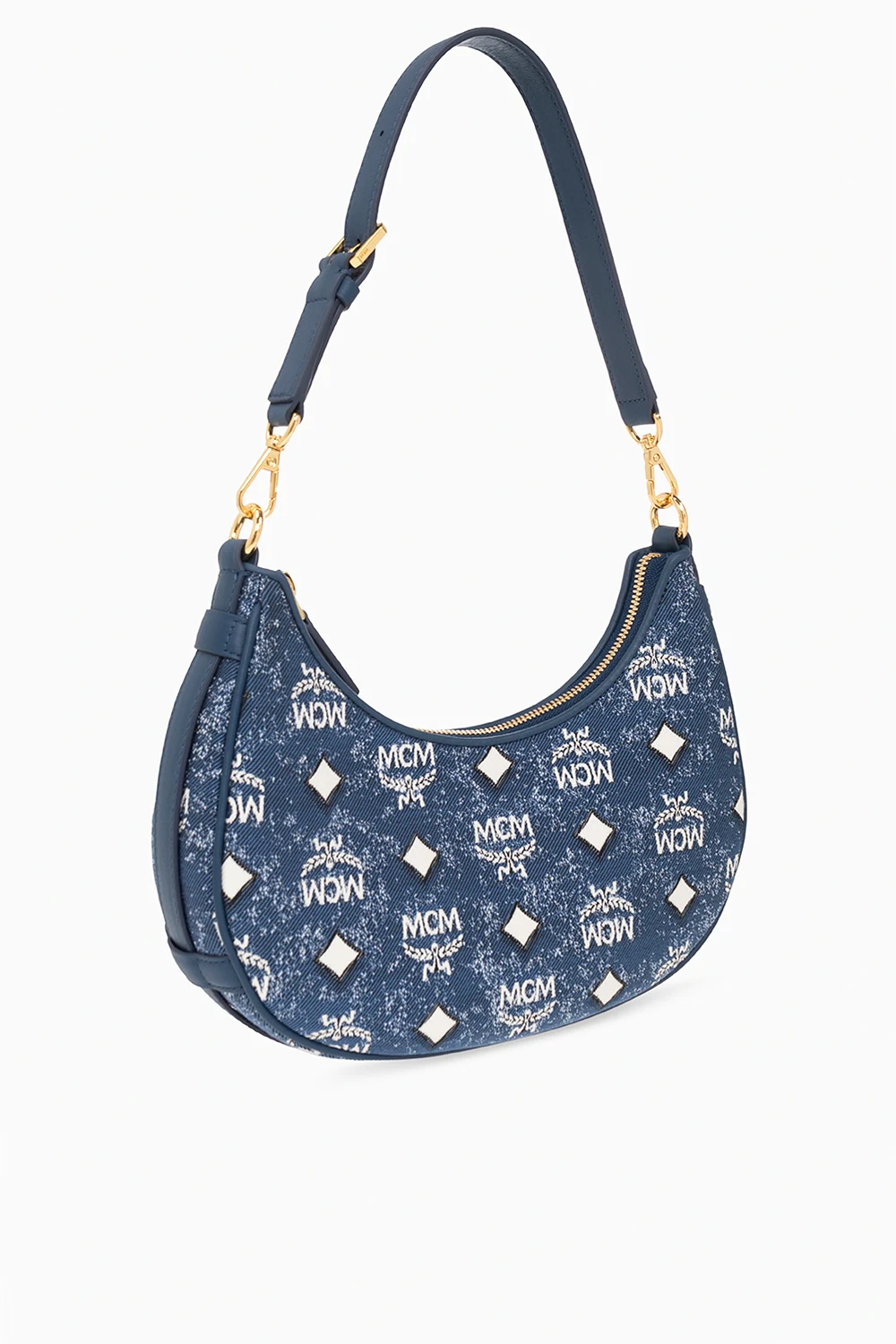 Blue shoulder bag from MCM. Made of denim, this model features a white and black monogram pattern, two half-round handles, detachable and adjustable shoulder strap, black metal hardware and one internal compartment with one slip pocket.