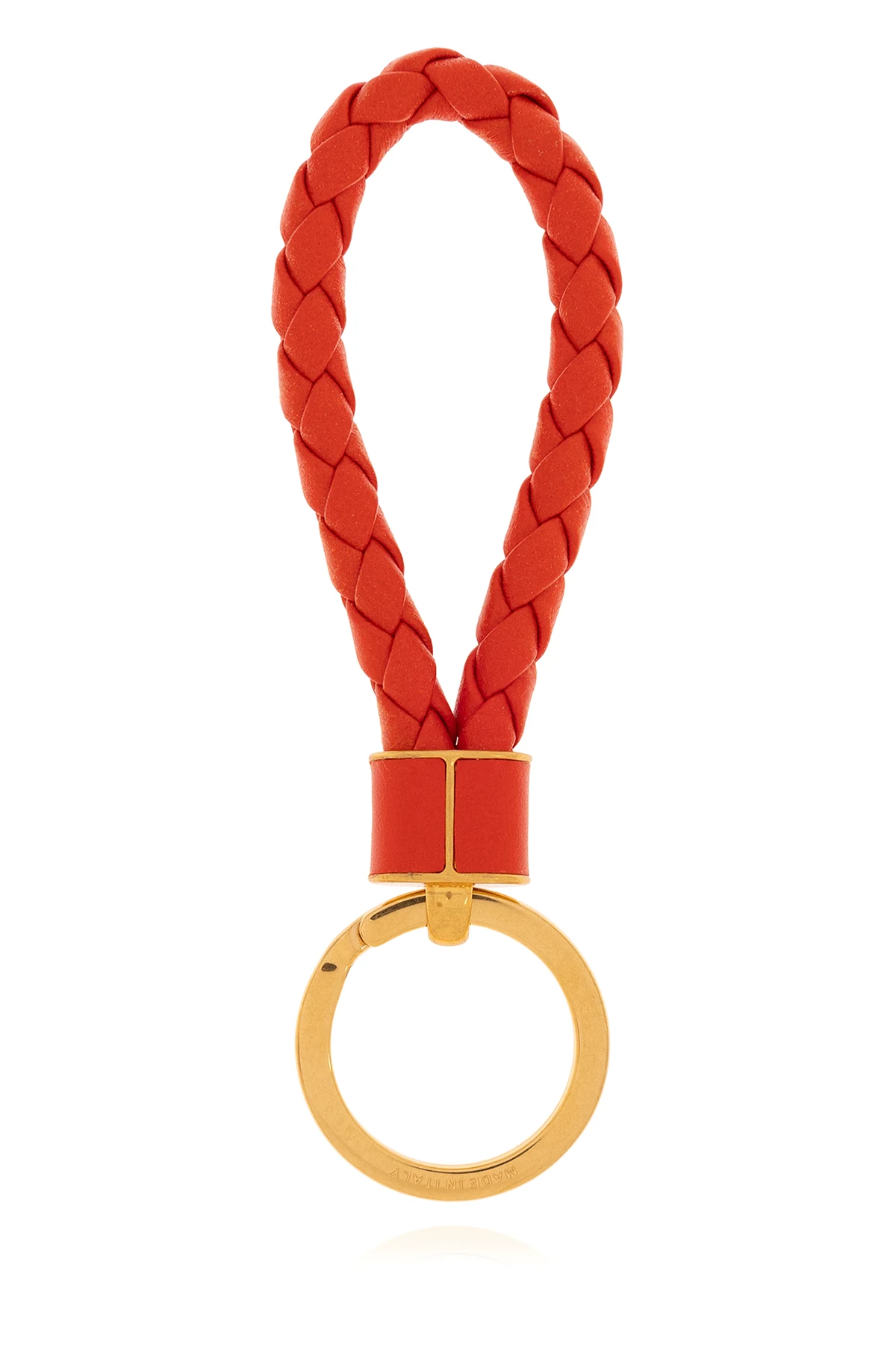 Gold-tone keyring from Bottega Veneta. This item features an engraved logo and a decorative charm woven from orange lamb leather.