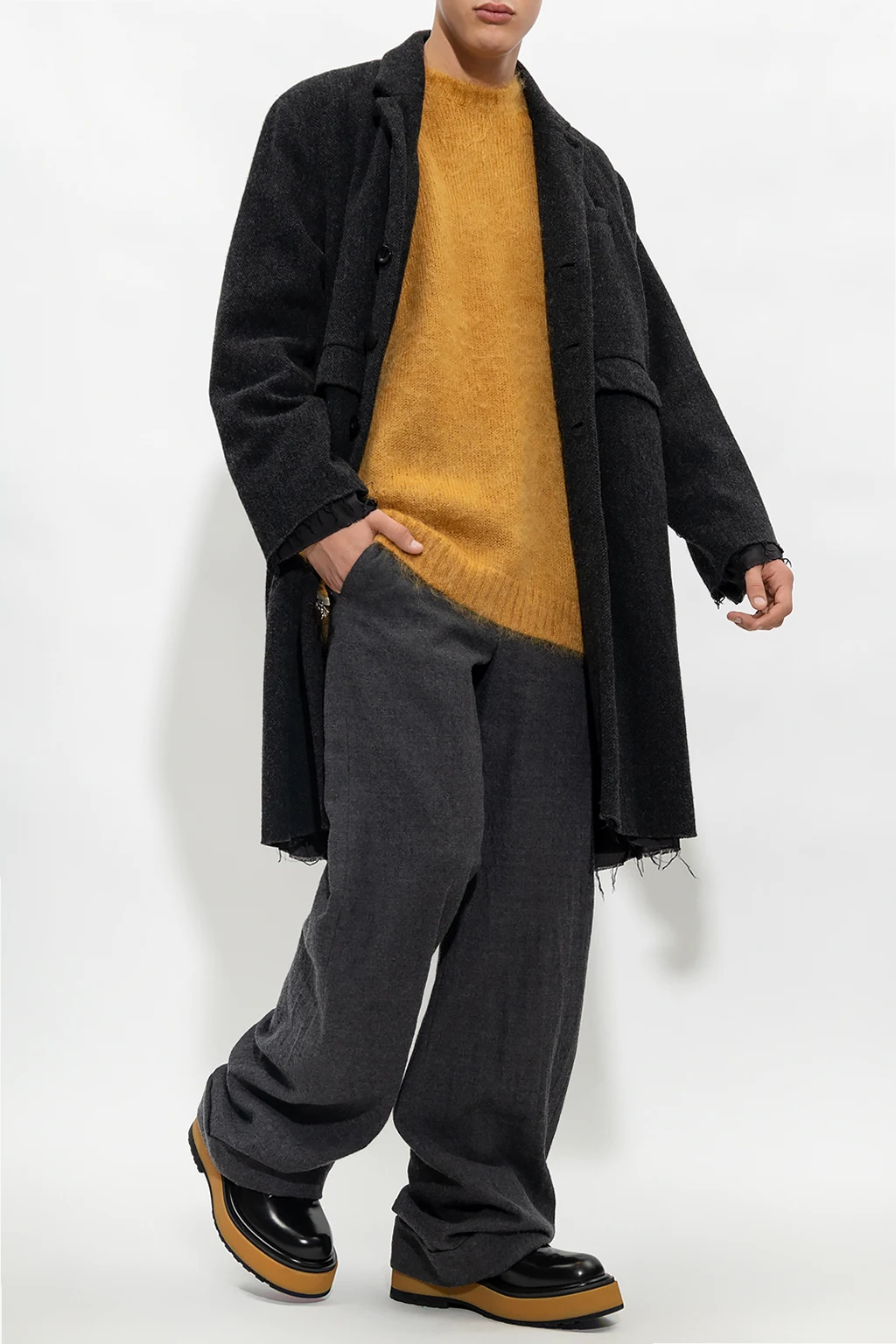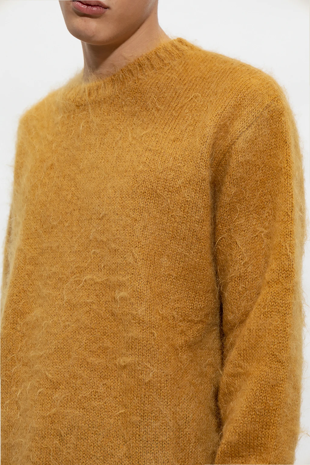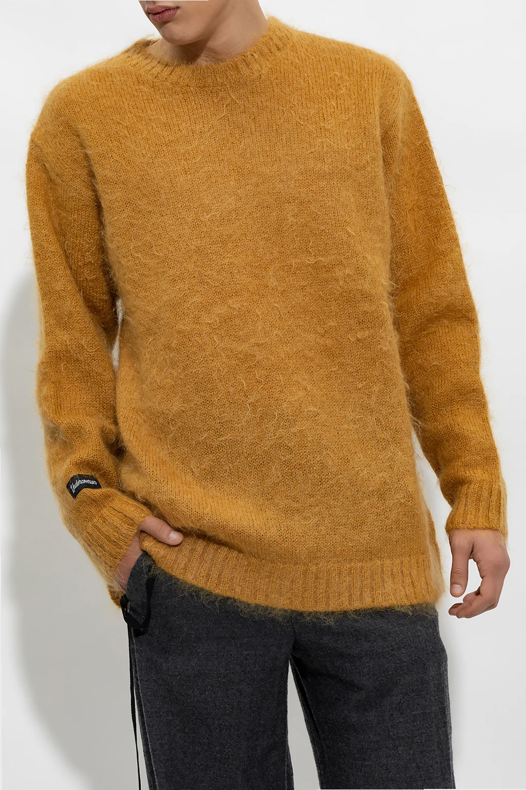 Dark yellow sweater from Undercover. Crafted from a mohair and wool blend, this long sleeve design features a black logo patch, round neck, ribbed edges and zips on the sides.