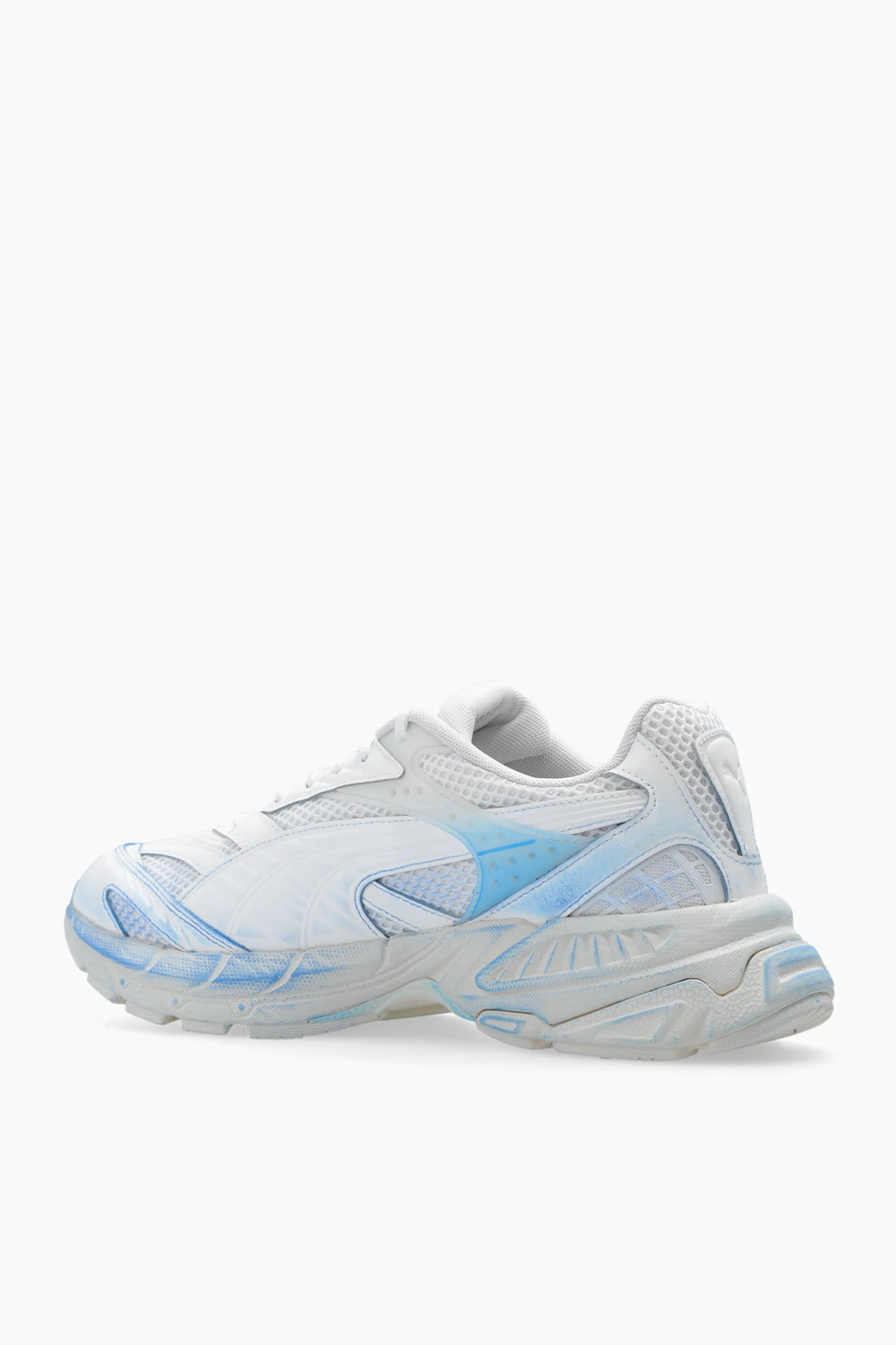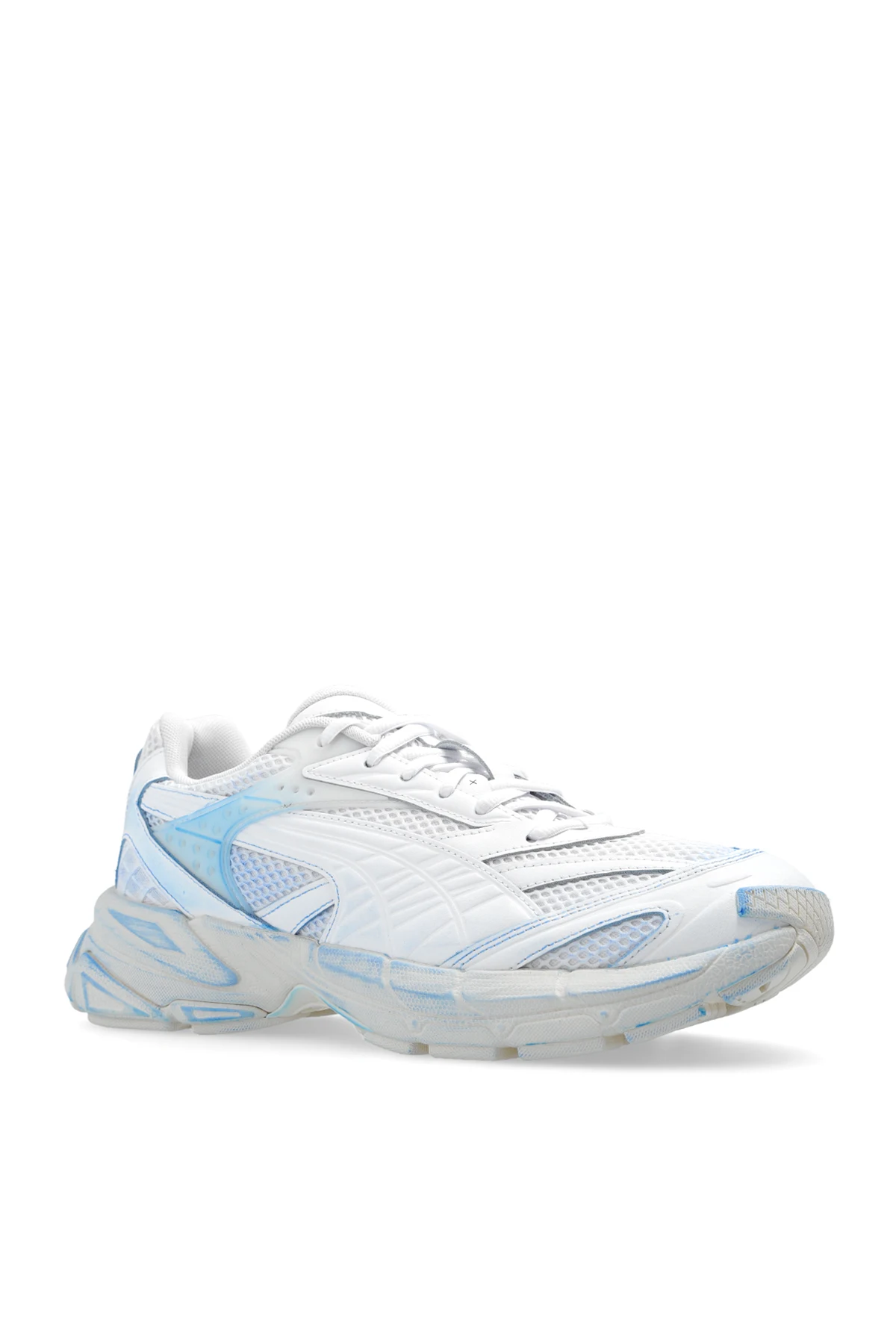 White and blue ‘Velophasis’ sneakers from Puma. Crafted from sports mesh and synthetic materials, this lace-up pair features a tie-dye effect, logo patch on the tongue and back as well as a cream rubber sole with PWRPLATE technology, a specially engineered carbon fiber inner plate that stabilizes the midsole while maximizing energy transfer.