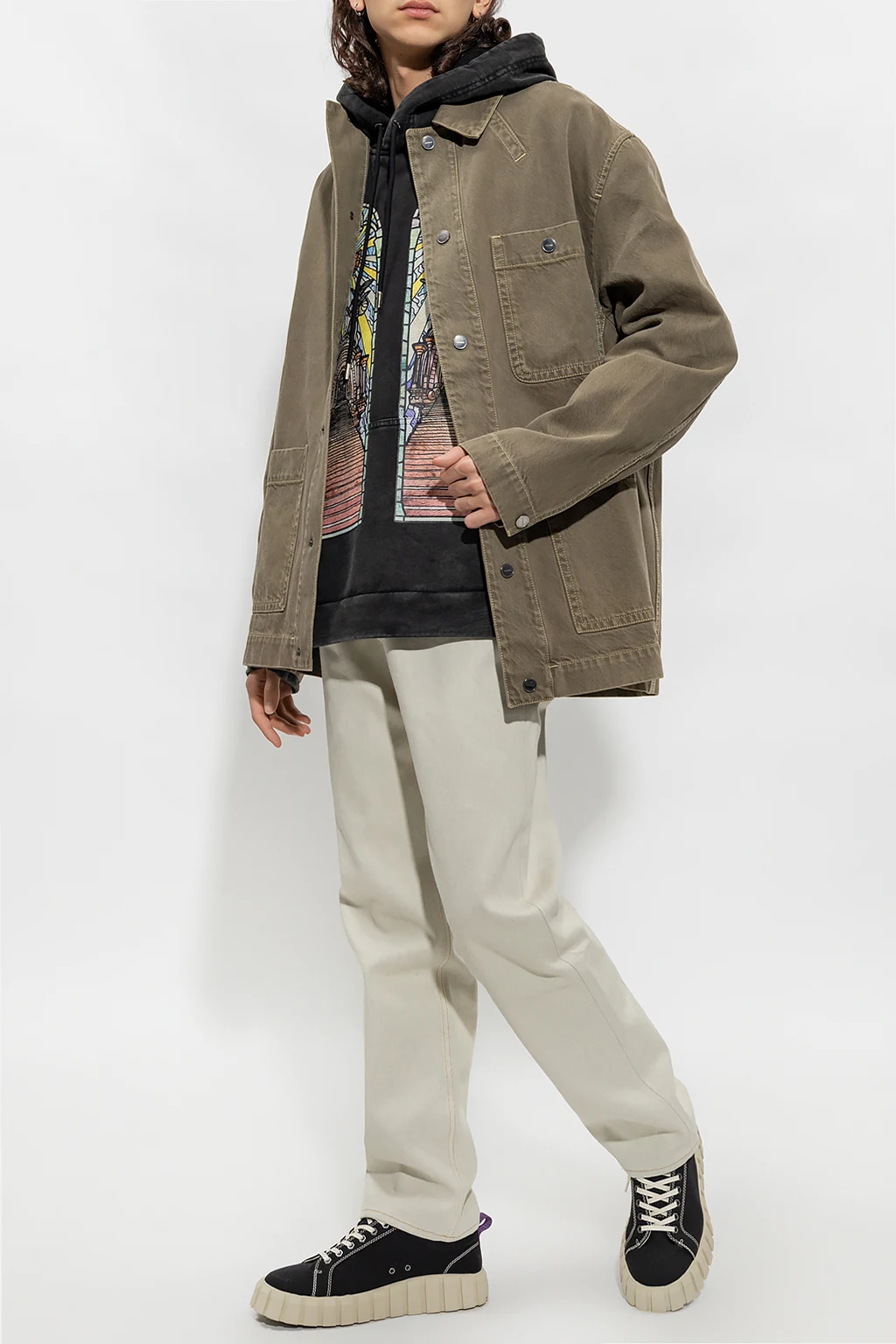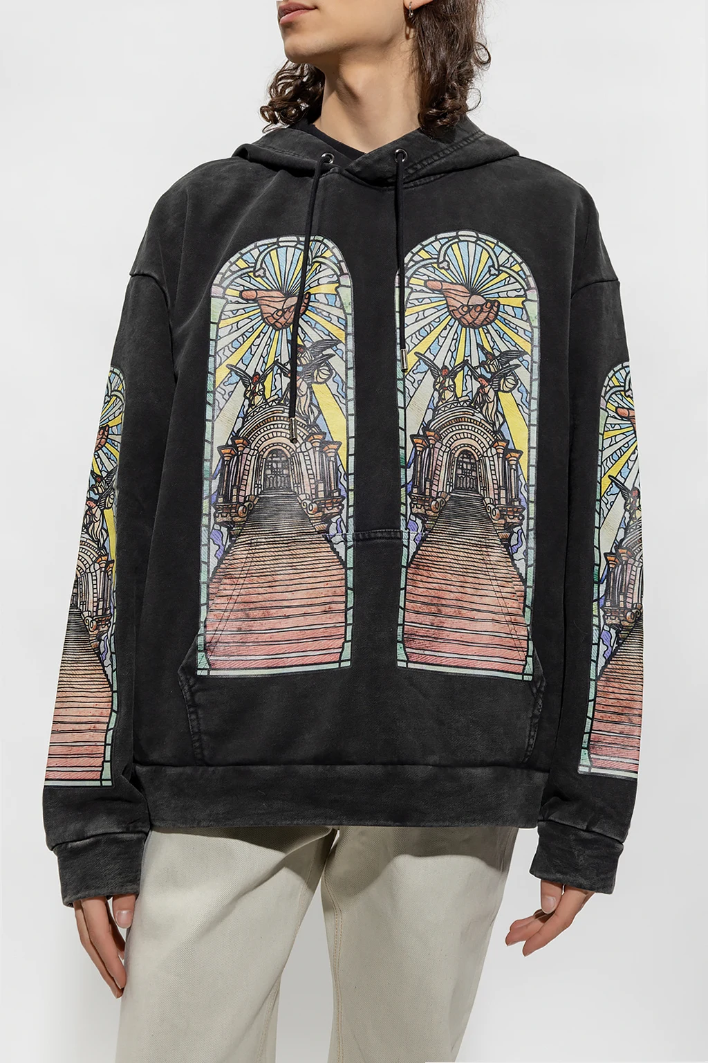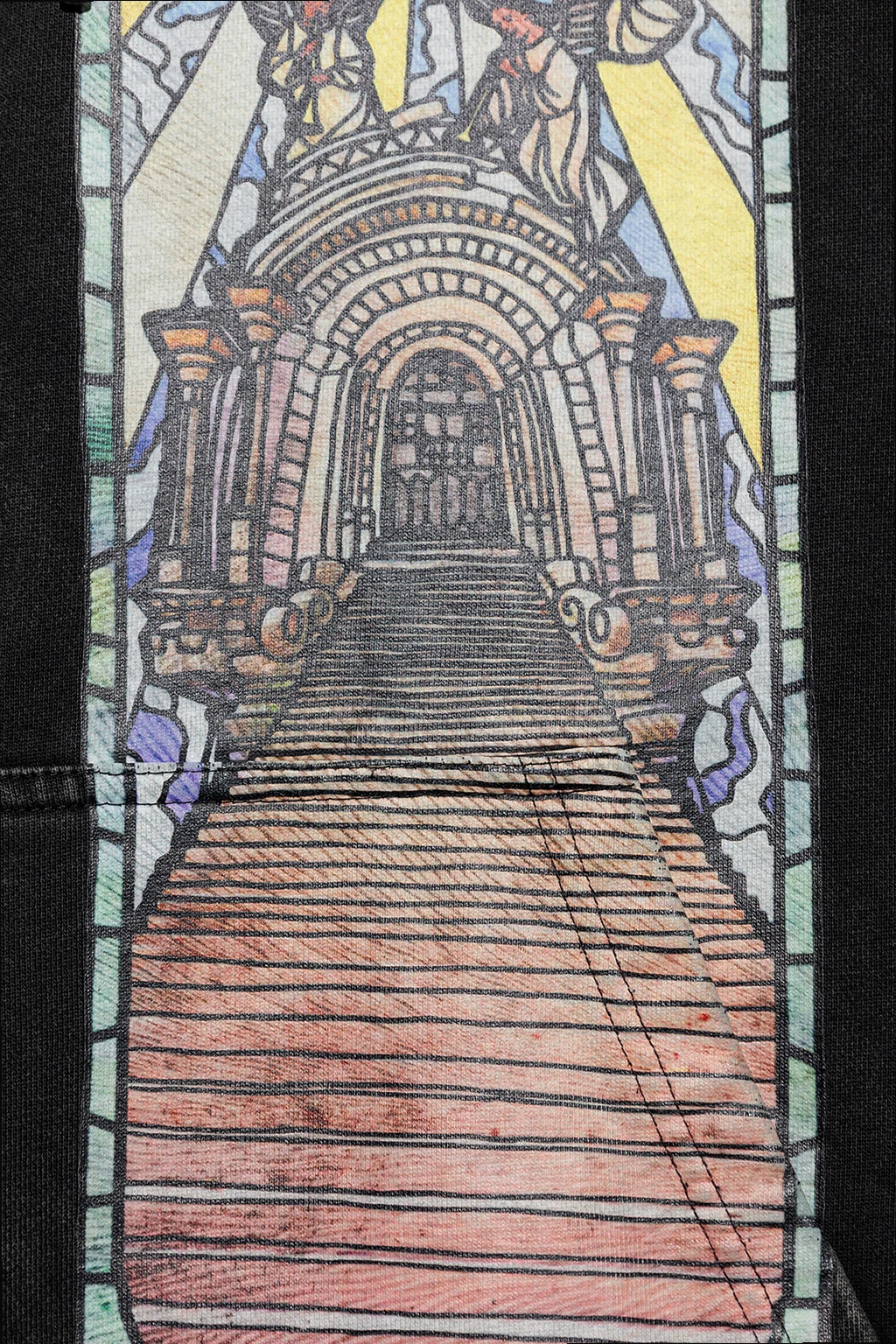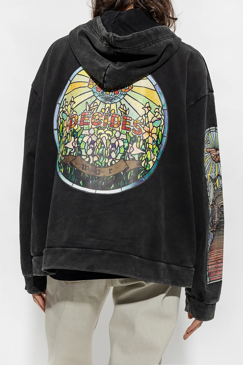 Black distressed hoodie from Who Decides War. Made of cotton, this long sleeve design features a vintage effect, multicolored stained glass print, drawstring hood, slip pocket and ribbed trims at the hem and cuffs.